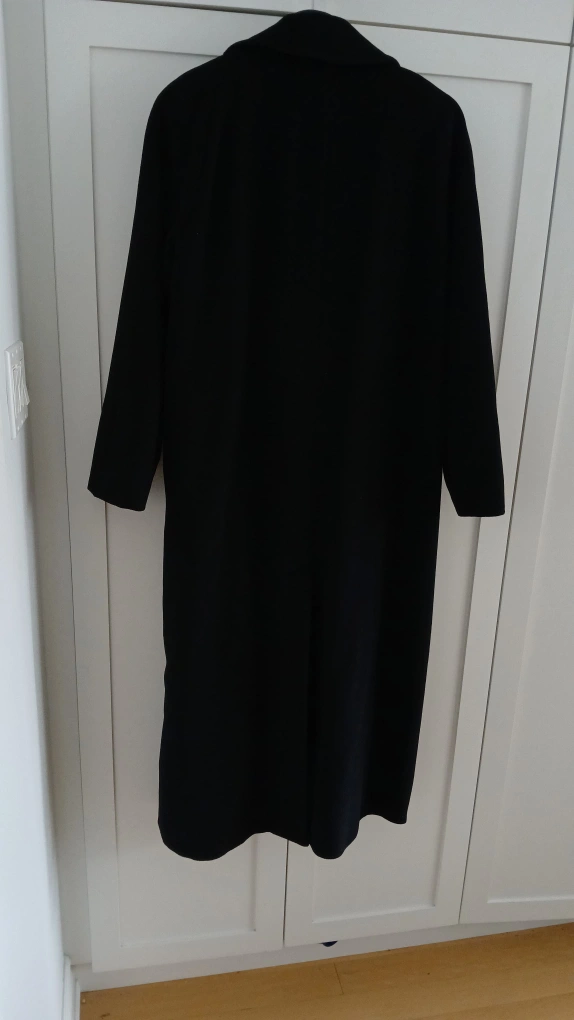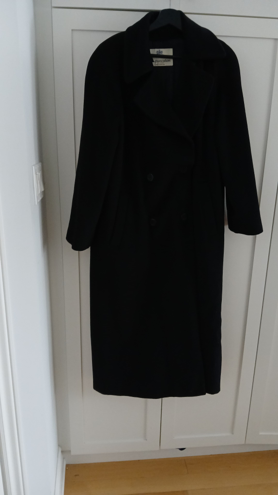This is a classic black overcoat that's perfect for cooler weather. It's made from a wool blend and has a timeless design. It’s in great condition and ready for a new home!