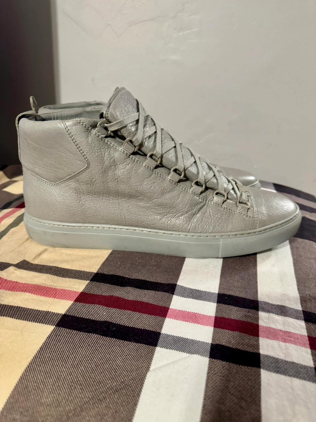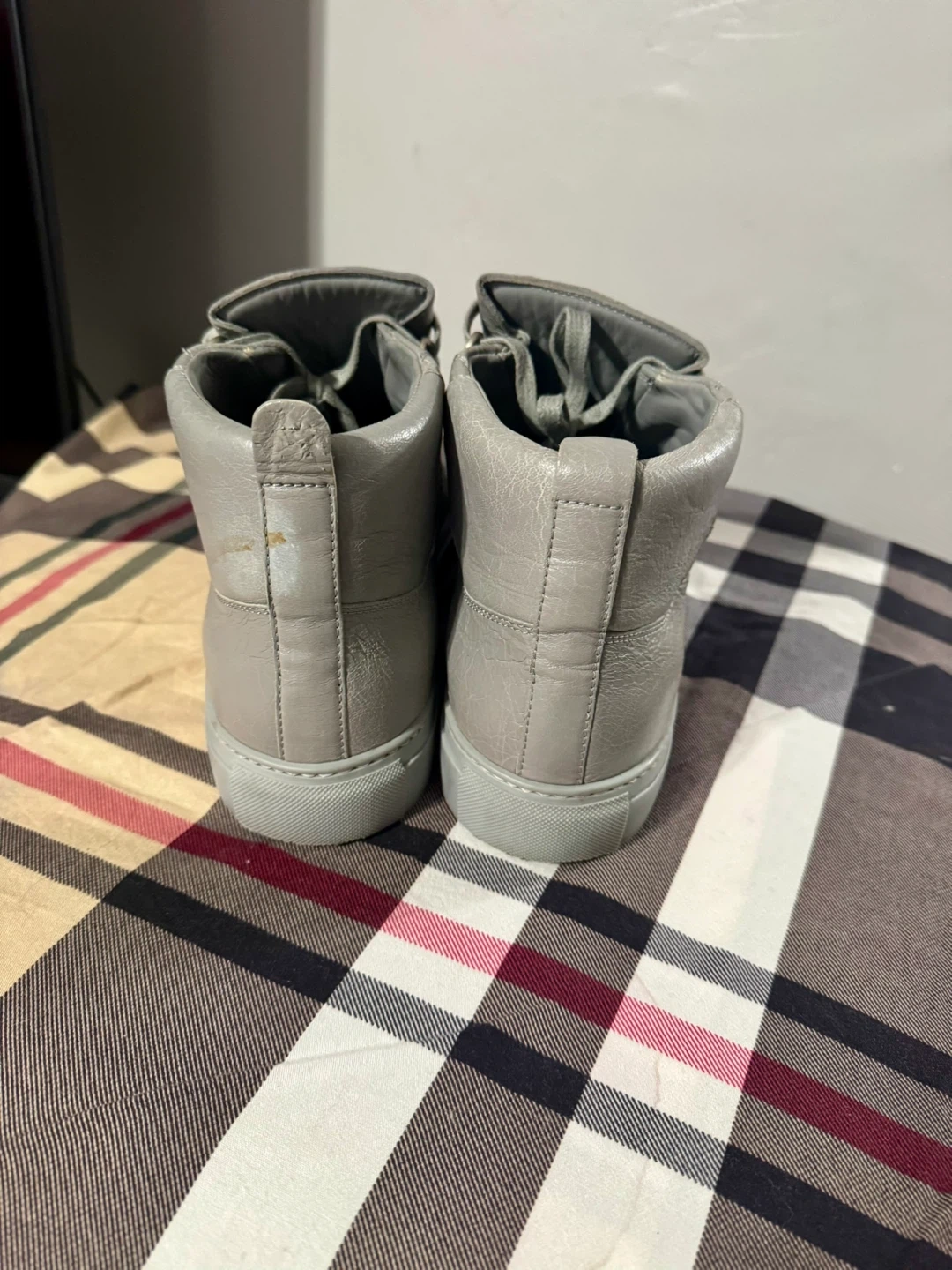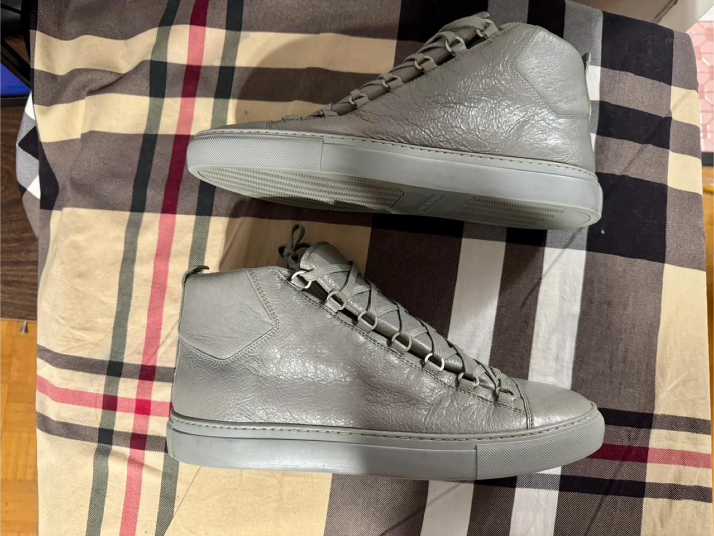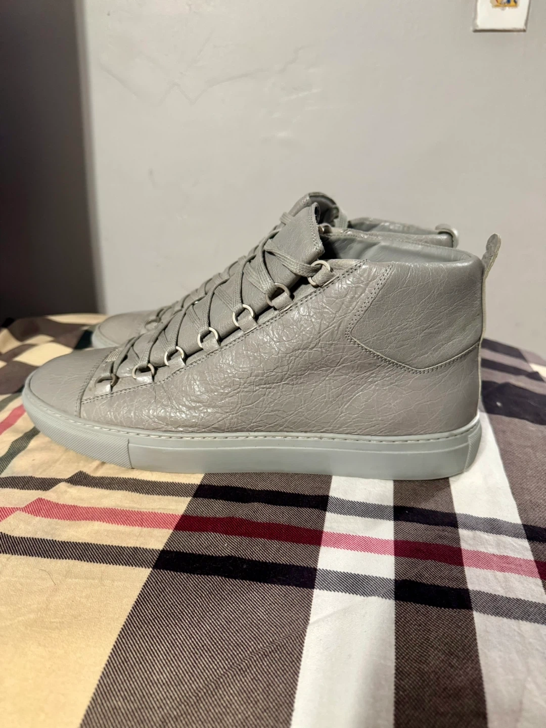 Selling a pair of Balenciaga Paris high-top sneakers in a stylish grey colour! They are a size 45. Some stain on outer left ankle part.They show some signs of wear, but are still in good condition for everyday use! What you see is what you get. Cash only and for pick up at 4 Goldfinch court north york
