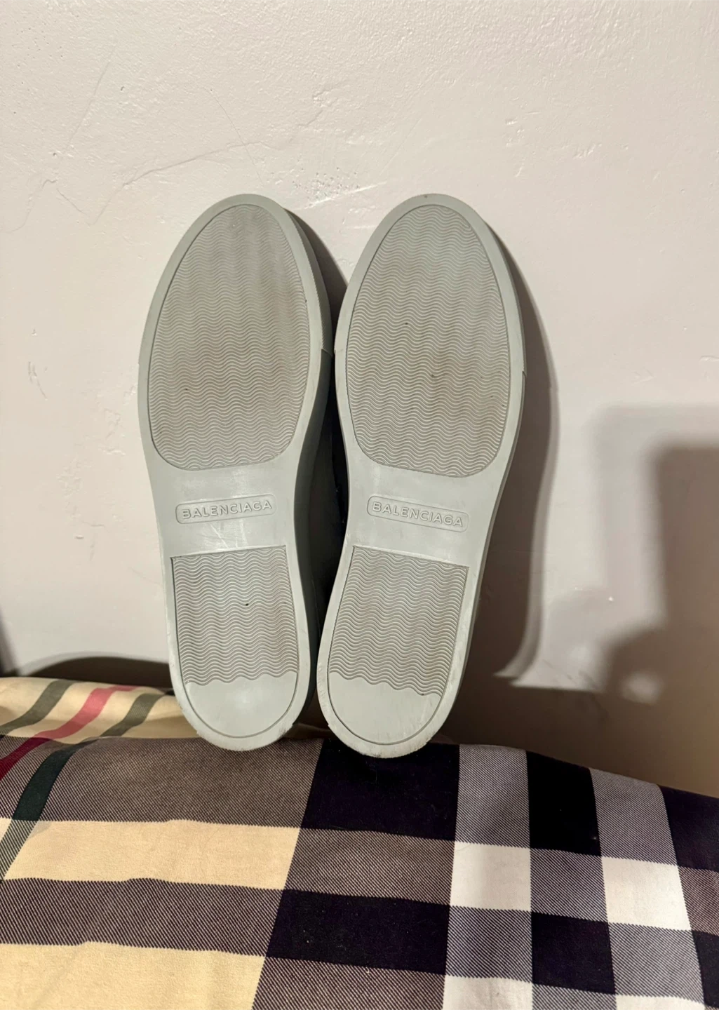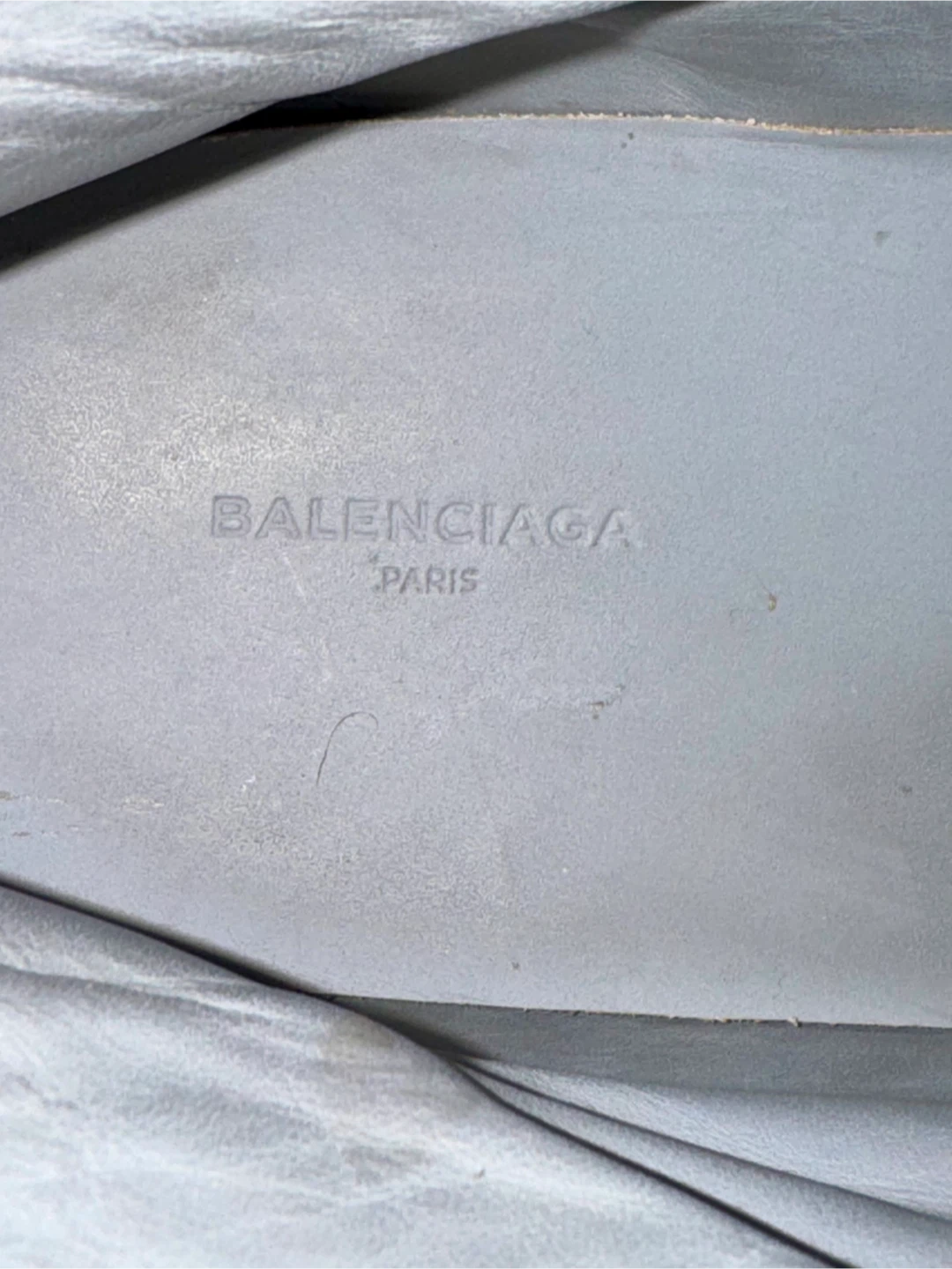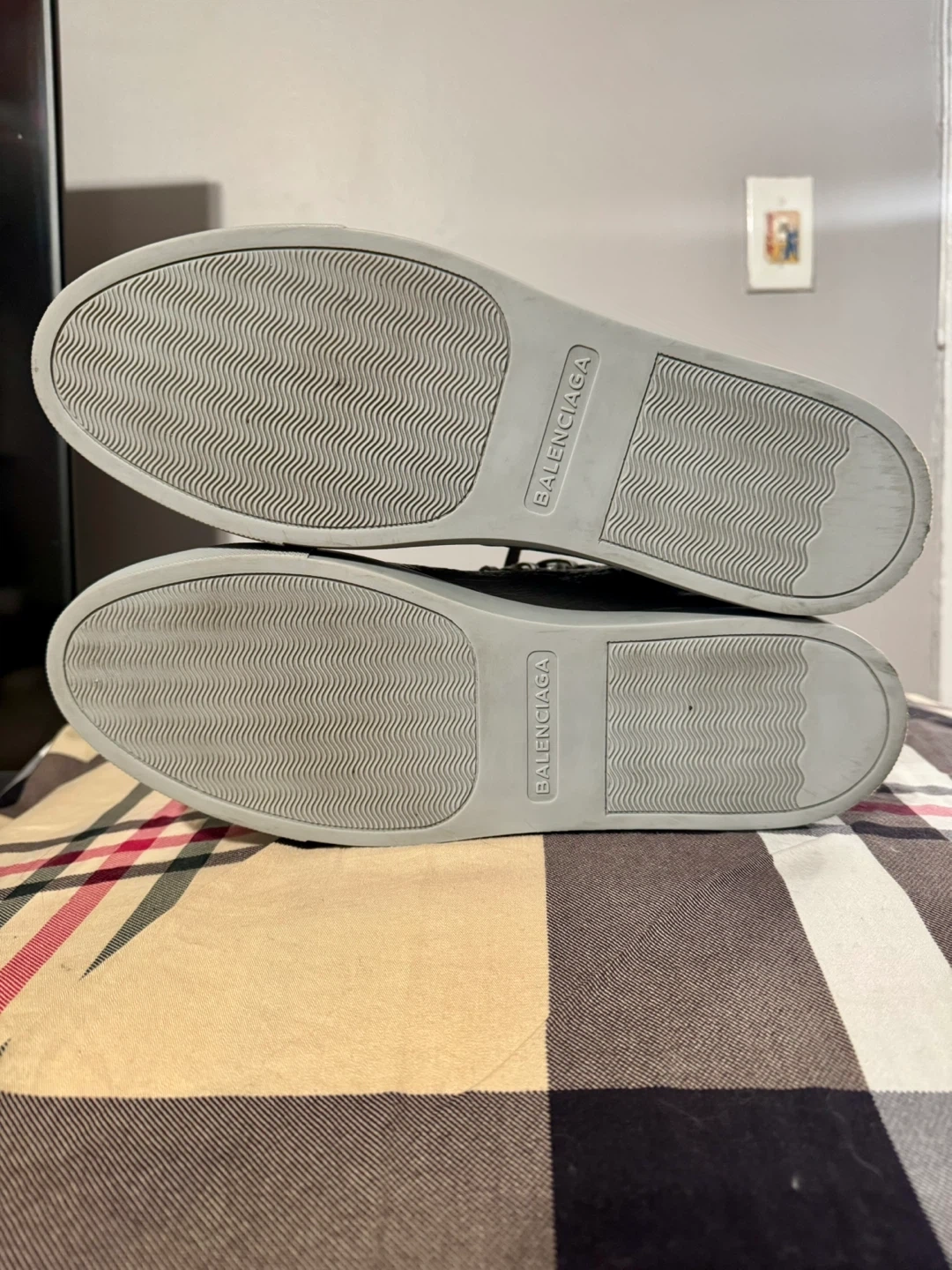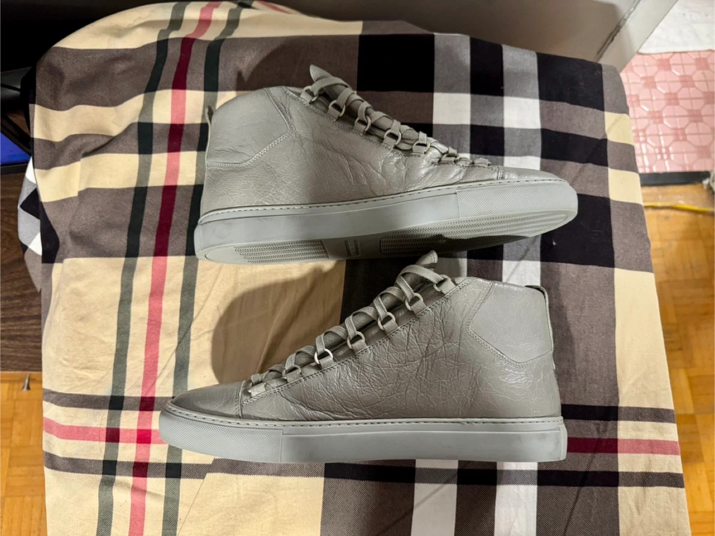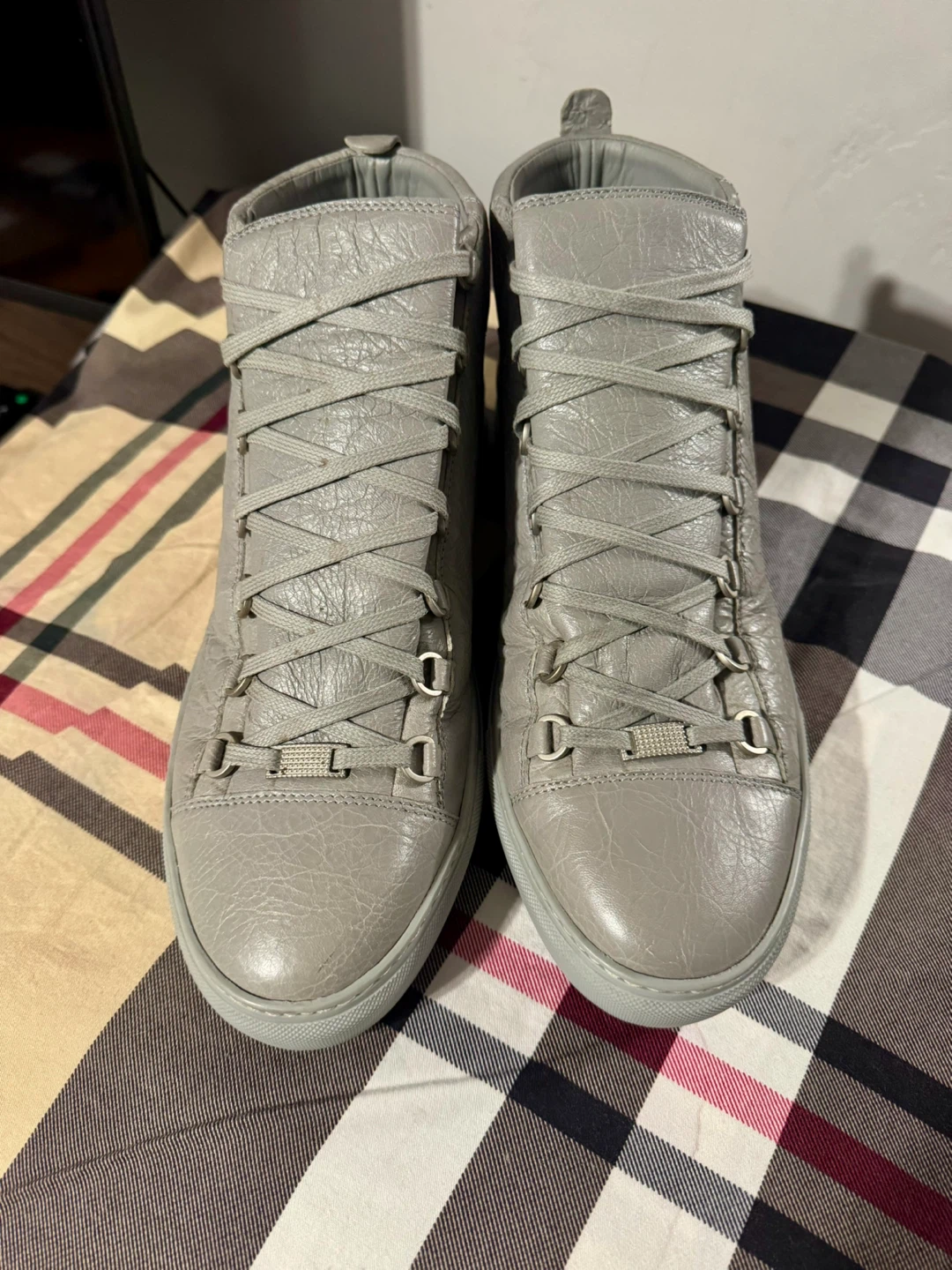 Selling a pair of Balenciaga Paris high-top sneakers in a stylish grey colour! They are a size 45. Some stain on outer left ankle part.They show some signs of wear, but are still in good condition for everyday use! What you see is what you get. Cash only and for pick up at 4 Goldfinch court north york
