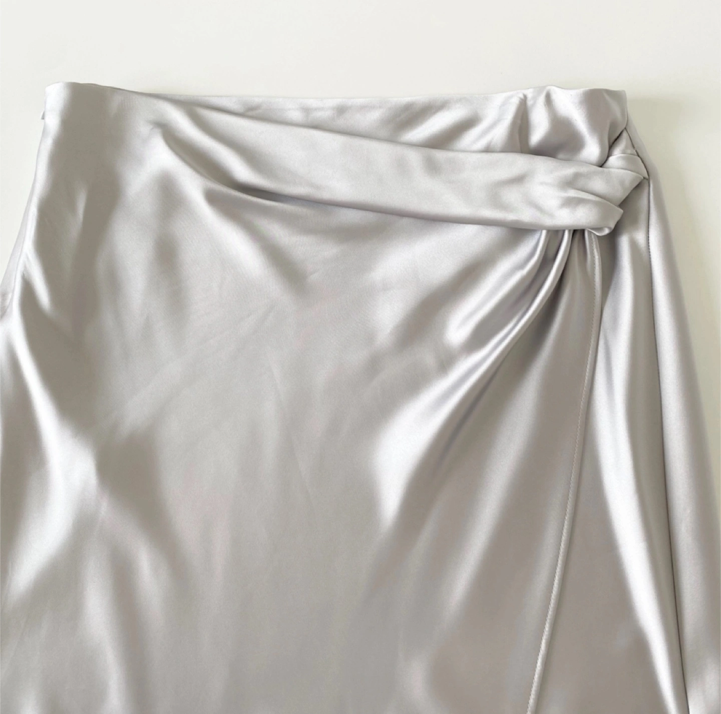 New without tag Zara faux wrap skirt with knot details and side invisible zipper closure. Made of medium weight 97% polyester, 3% elastane in a silver colour. It's very soft, silky and drapes like a dream! Can be dressed up or down.