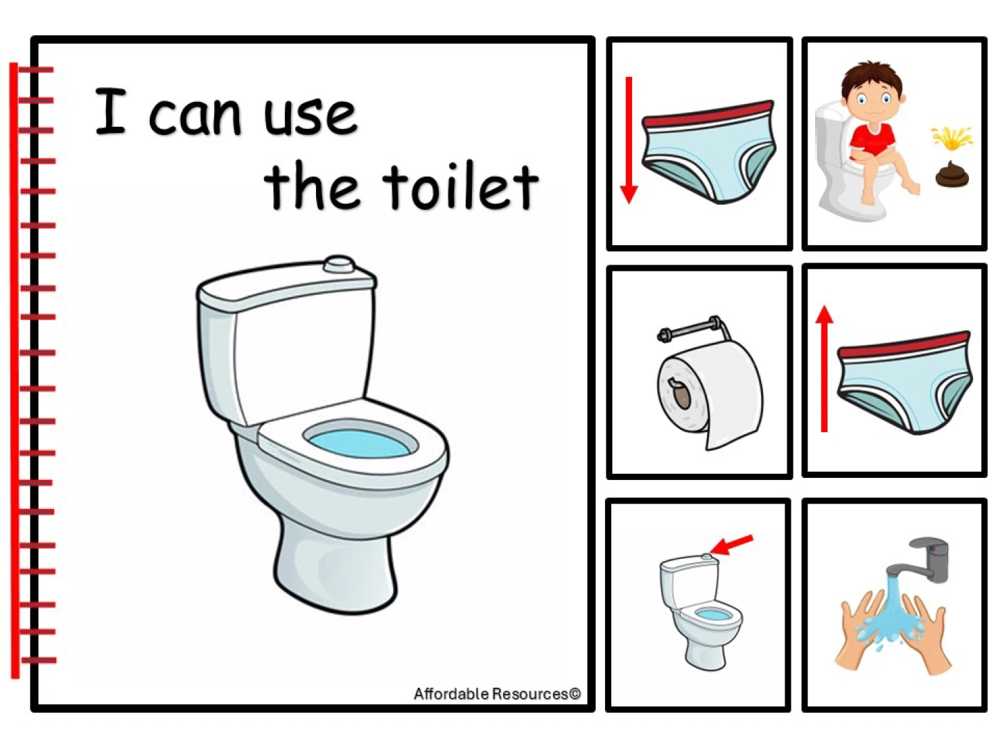 Through use of book children will learn steps for using toilet, washing hands and brushing teeth.