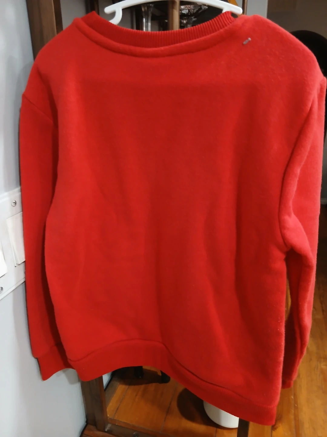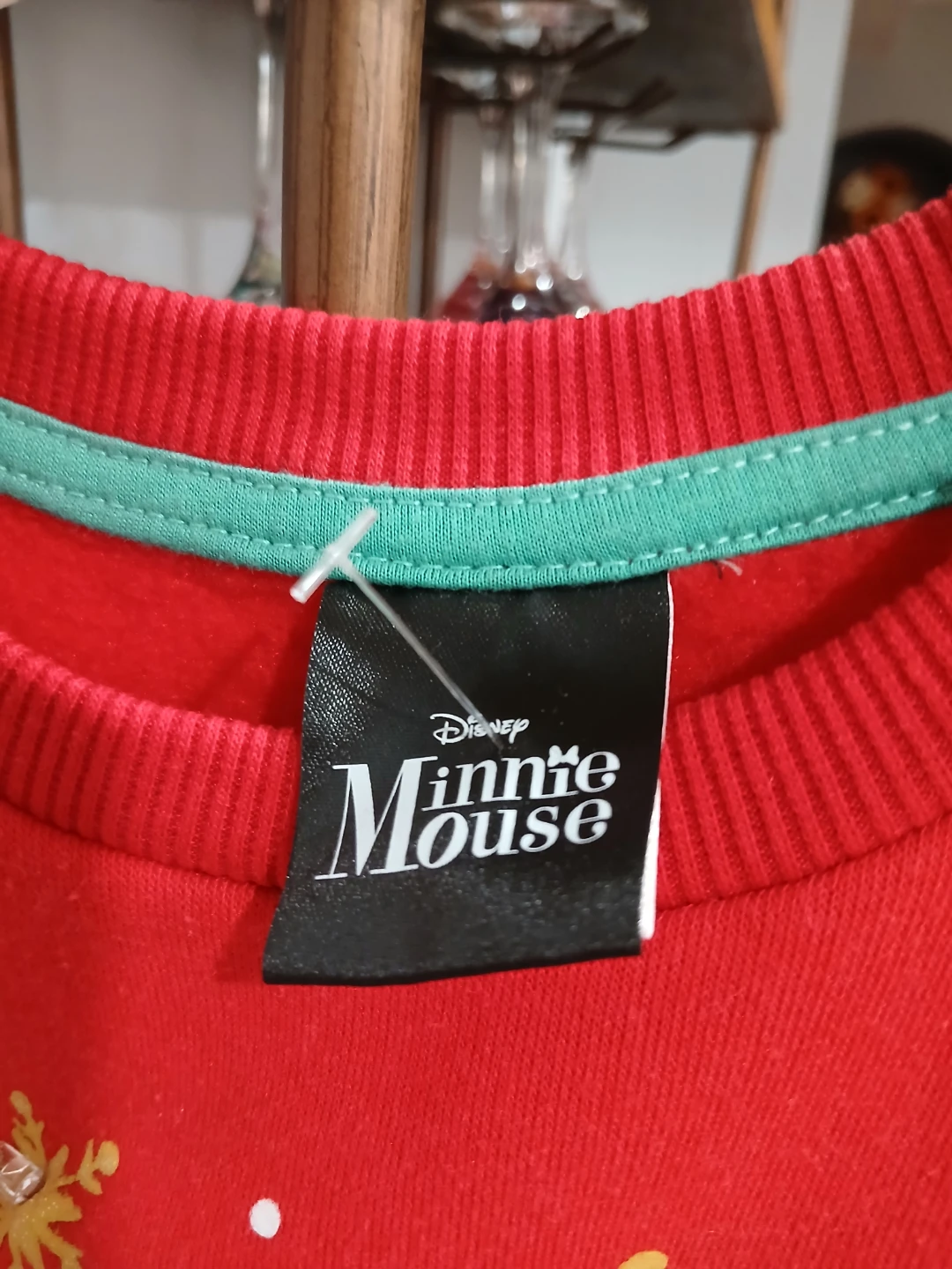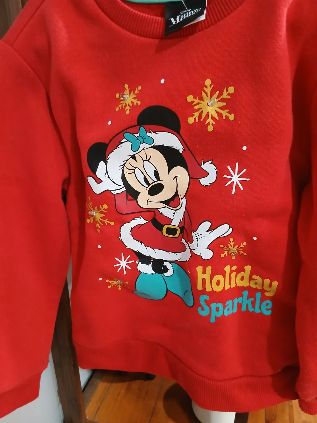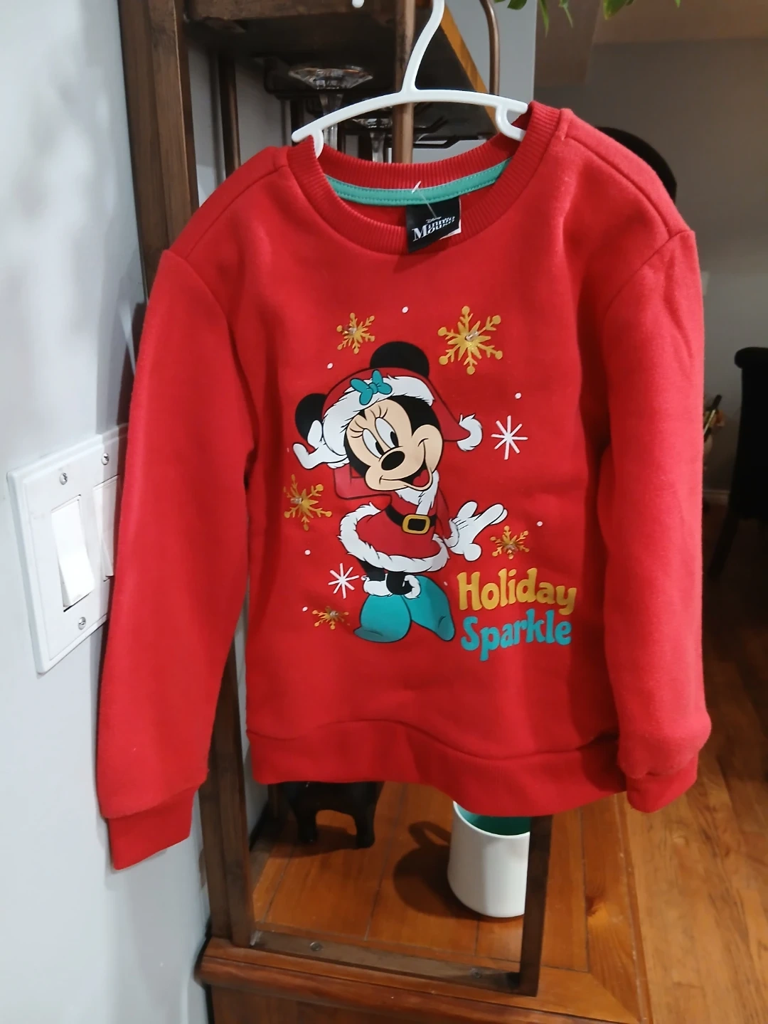 Here's a cute red sweater featuring Minnie Mouse in a festive holiday theme! The sweater has a "Holiday Sparkle" design and is perfect for the season. It's in great condition and ready for a new owner.