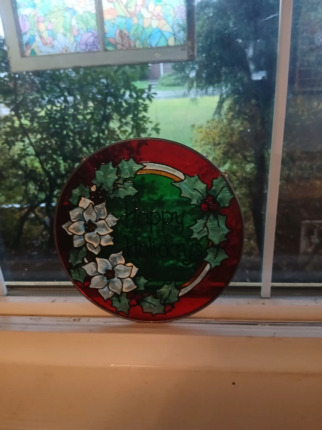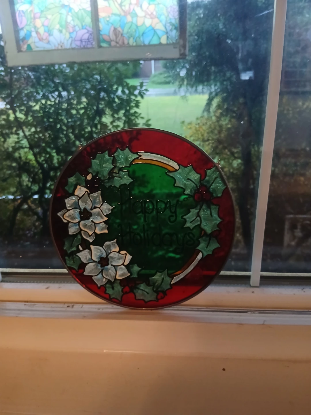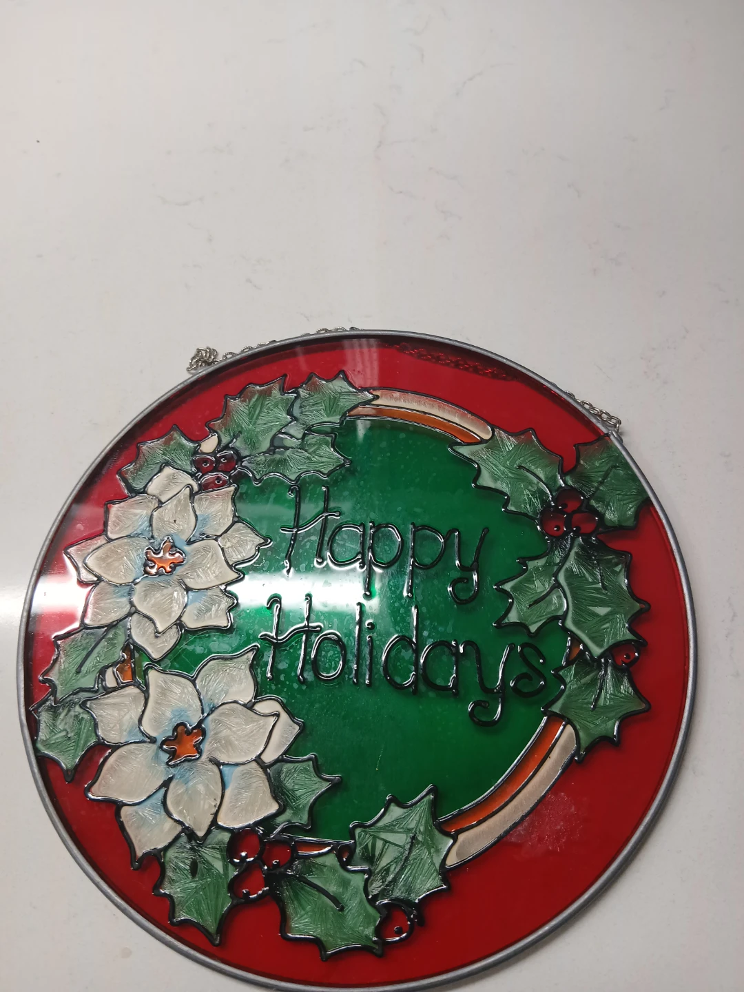 A festive stained glass window hanging featuring a 'Happy Holidays' message surrounded by holly and poinsettias. Perfect for adding a touch of holiday cheer to your home!