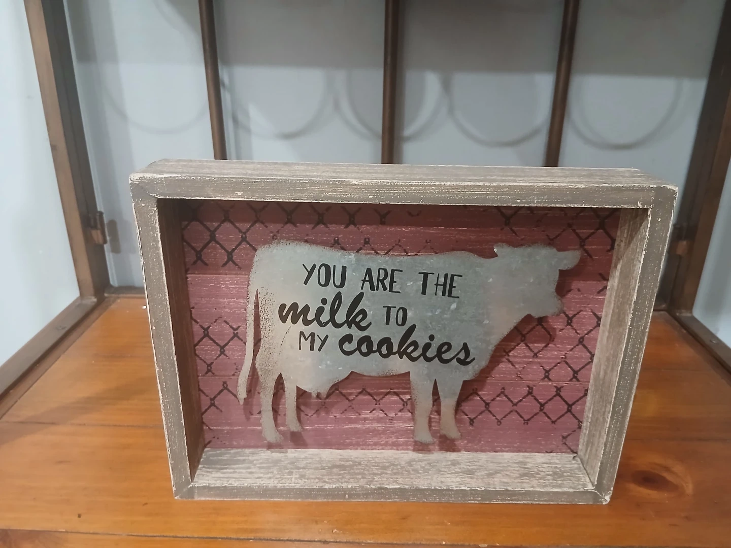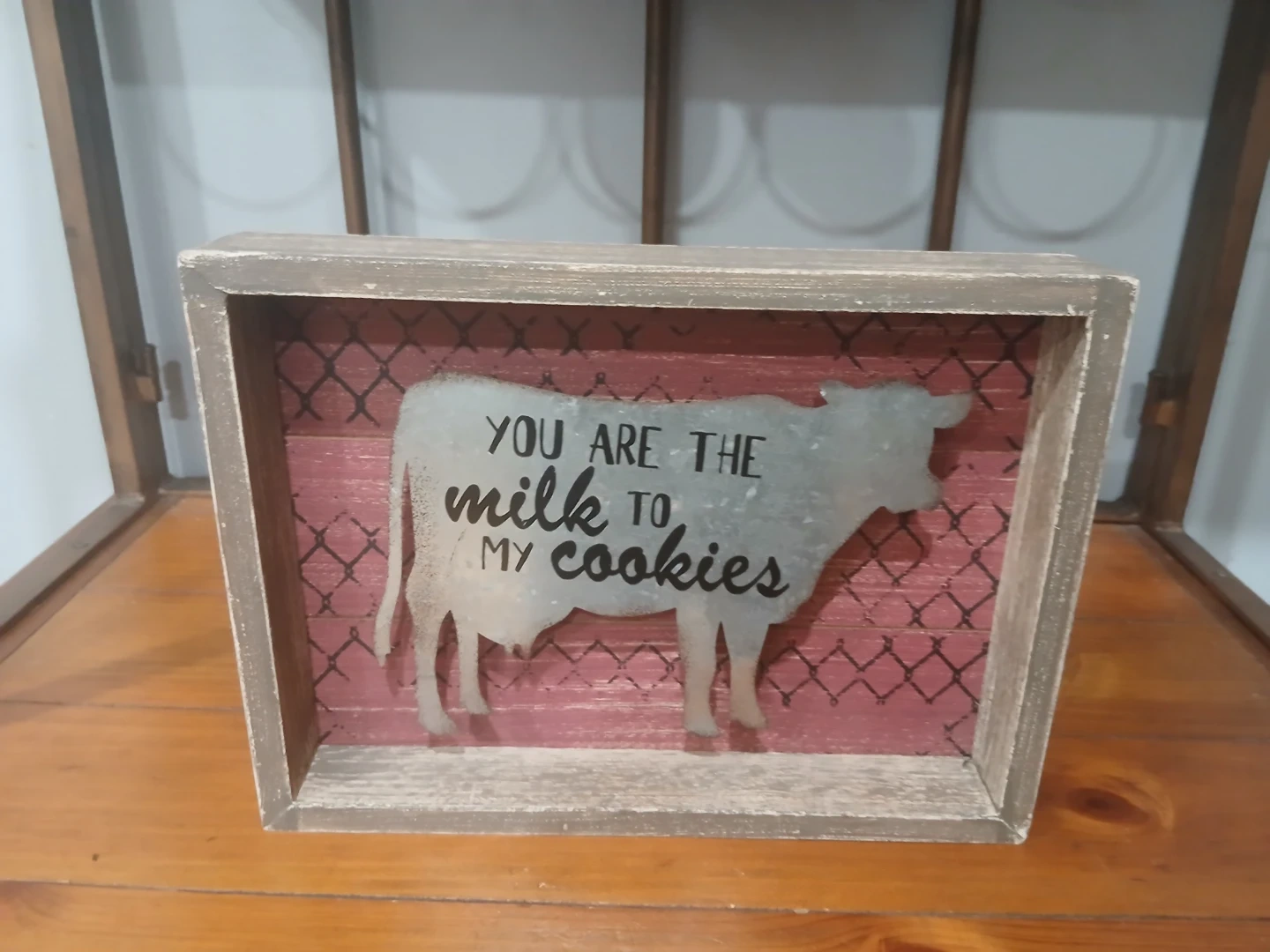 This charming farmhouse decor piece features a rustic wooden frame and a cute cow design. It says "You are the milk to my cookies" in a playful font. Perfect for adding a touch of country charm to your kitchen or living room!