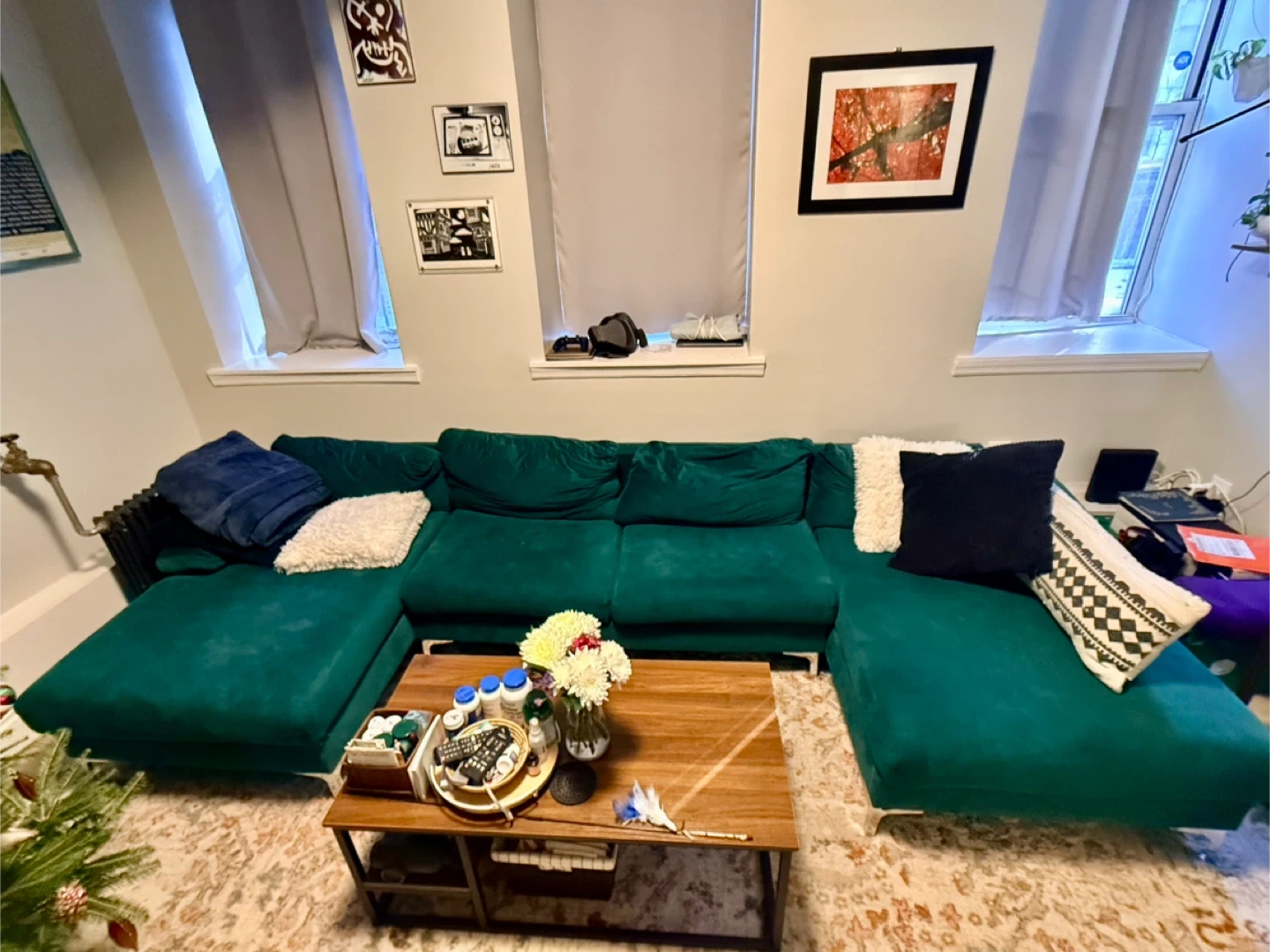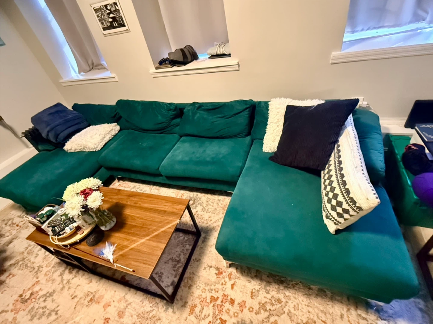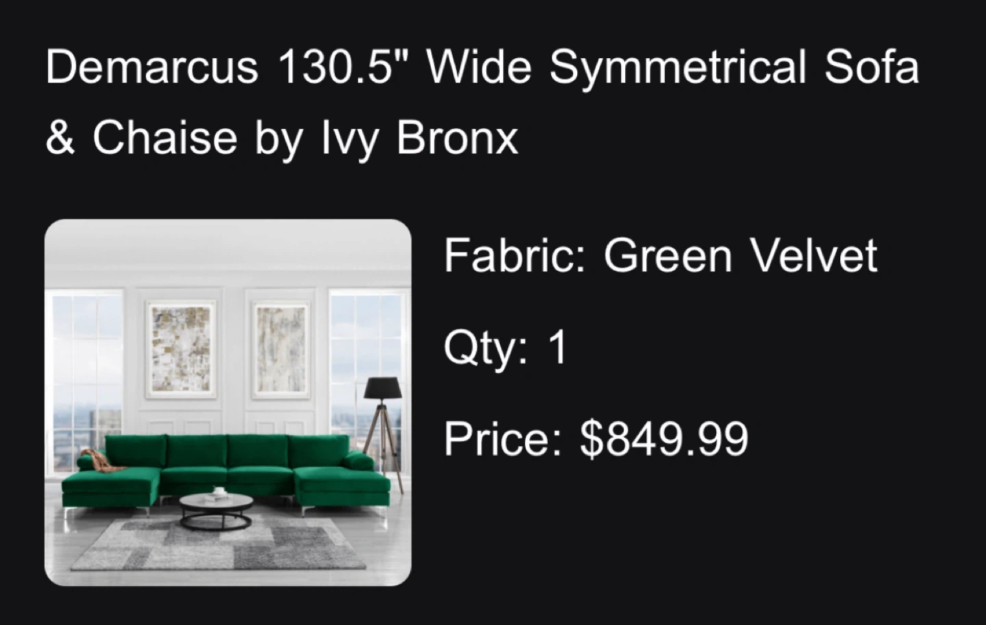 Selling a beautiful Ivy Bronx Demarcus sofa and chaise in green velvet! It's a symmetrical design and measures 130.5" wide. The original price was $849.99. It's in very good condition (need some fluffing and 1-2 areas of minor wear from cats) and ready for a new home! Price negotiable.