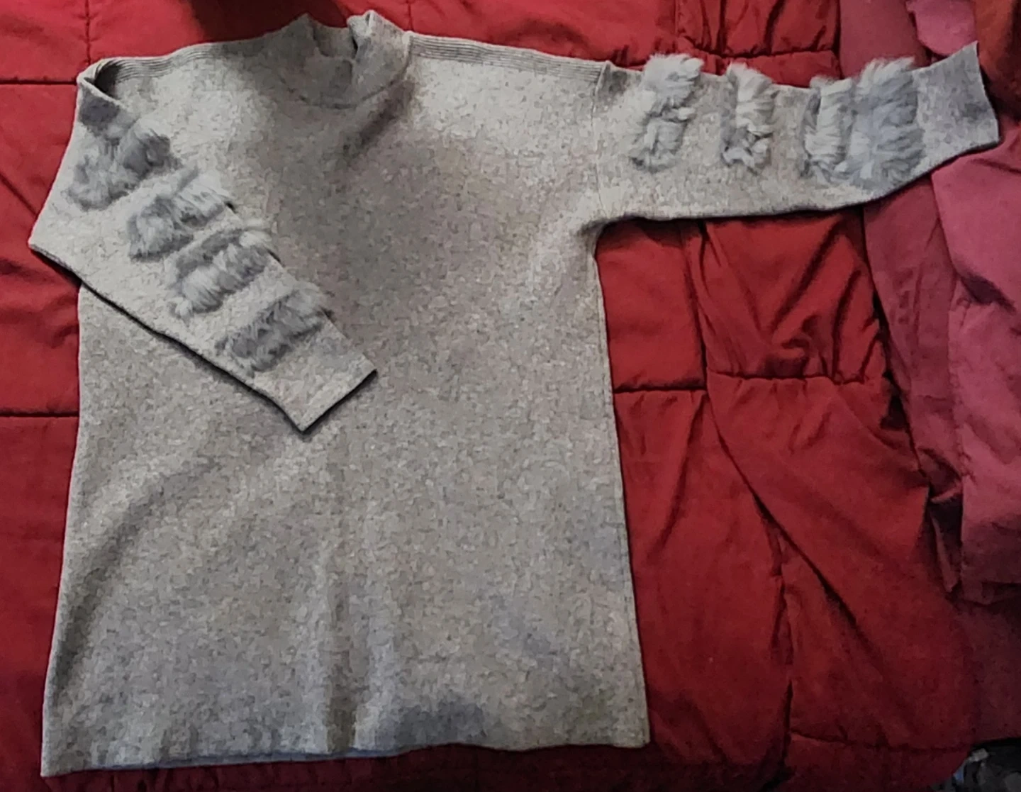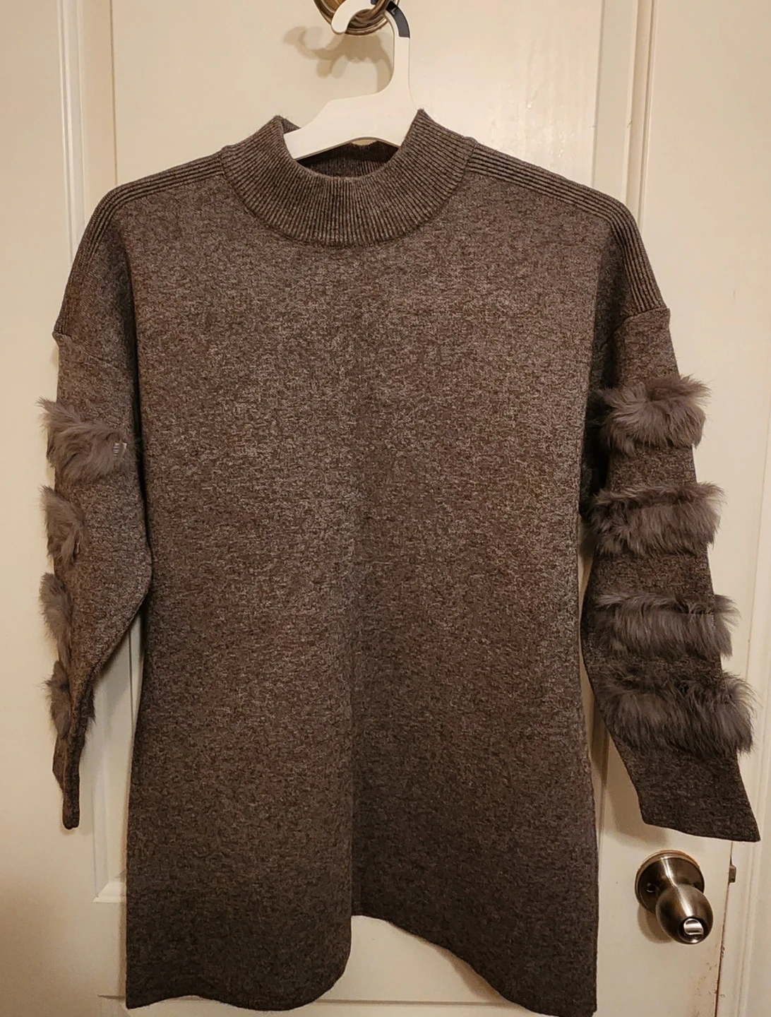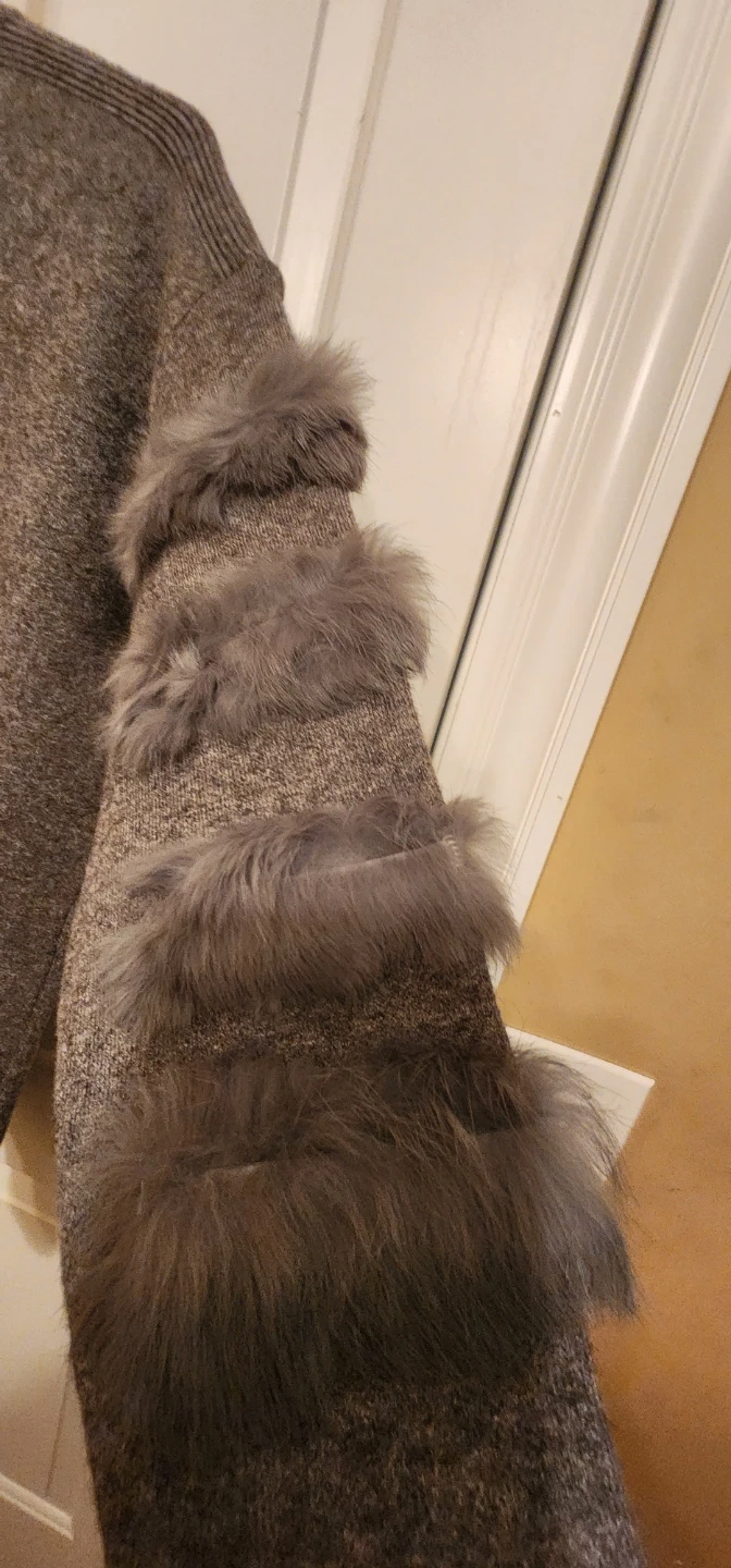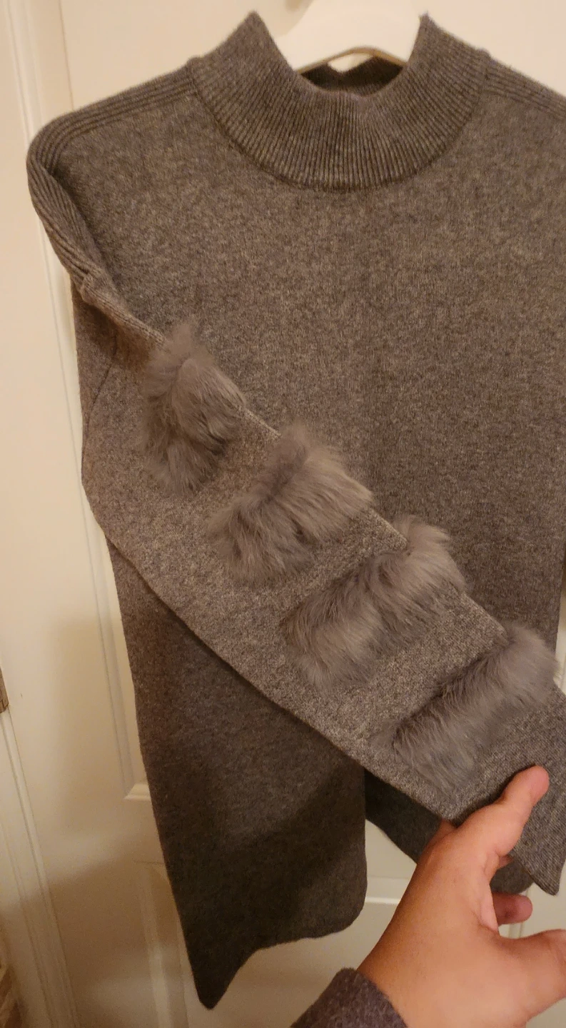 Here's a stylish sweater dress with a unique fur trim detail on the sleeves! It's a lovely gray color and perfect for adding a touch of elegance to your wardrobe