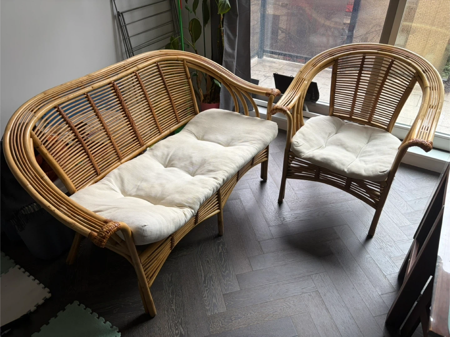 Selling a cute rattan sofa and matching chair set! Perfect for adding a touch of natural style to your living space or sunroom. The cushions are included and in great shape. This set is ready to bring a cozy and inviting feel to your home!
