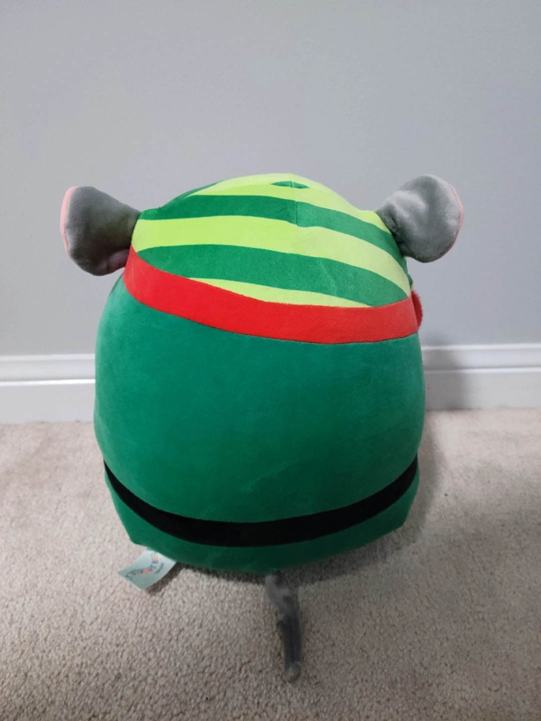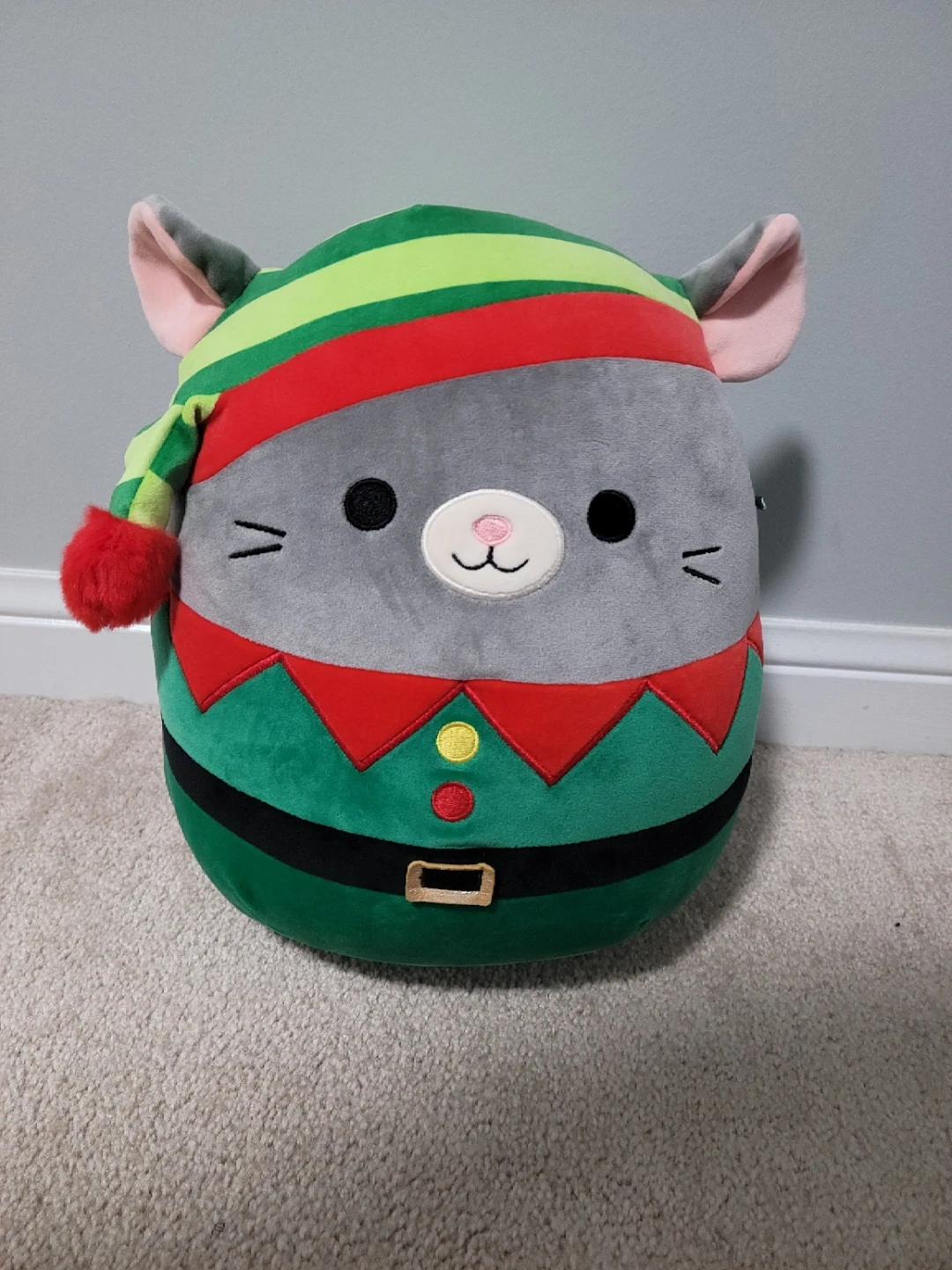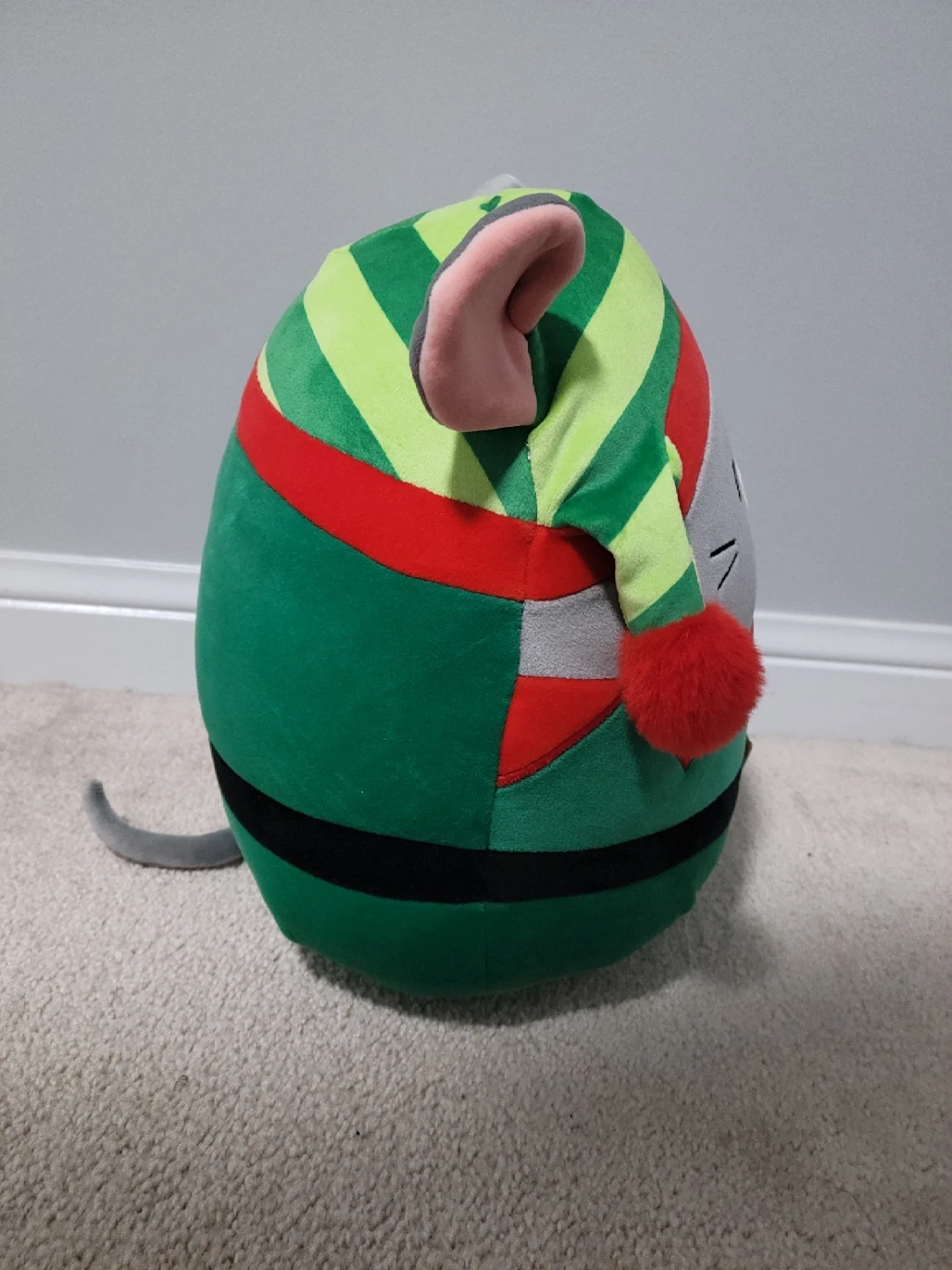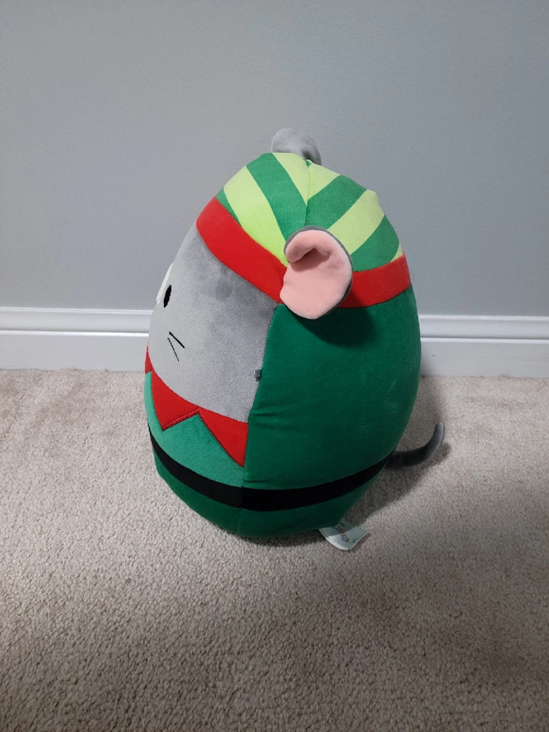 Selling a cute Squishmallow plush toy! It's an adorable grey mouse dressed up as an elf, perfect for the holidays or any time of year. It's in great condition and ready for a new home!