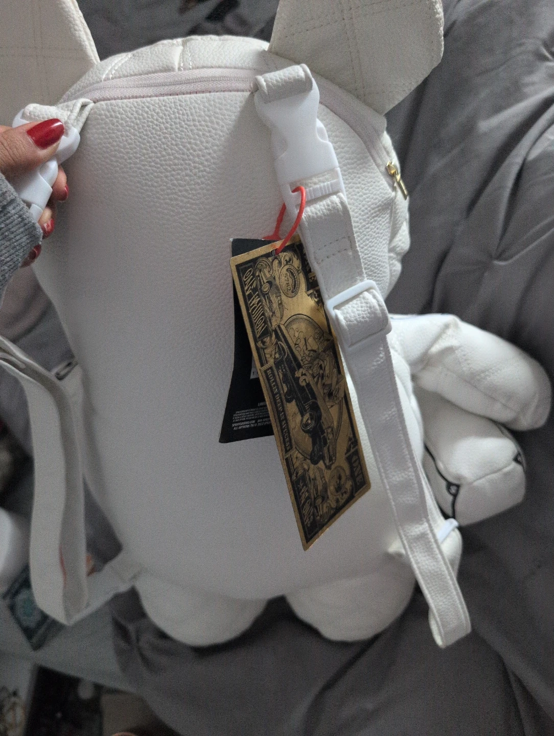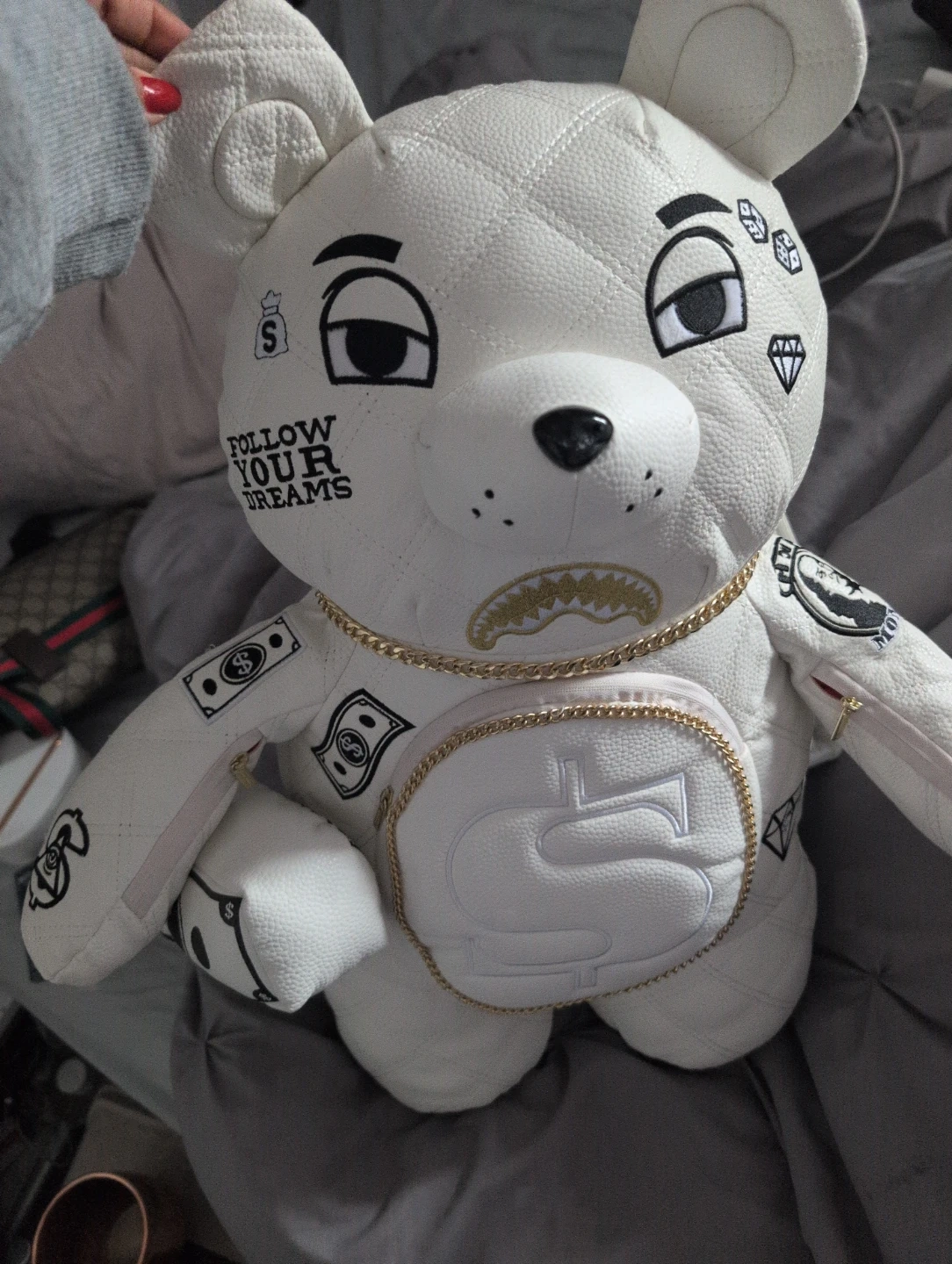 This is a white One Of One Spray ground original special edition teddy bear backpack. It features a unique design and is brand new. Perfect for adding a fun and stylish touch to your outfit!