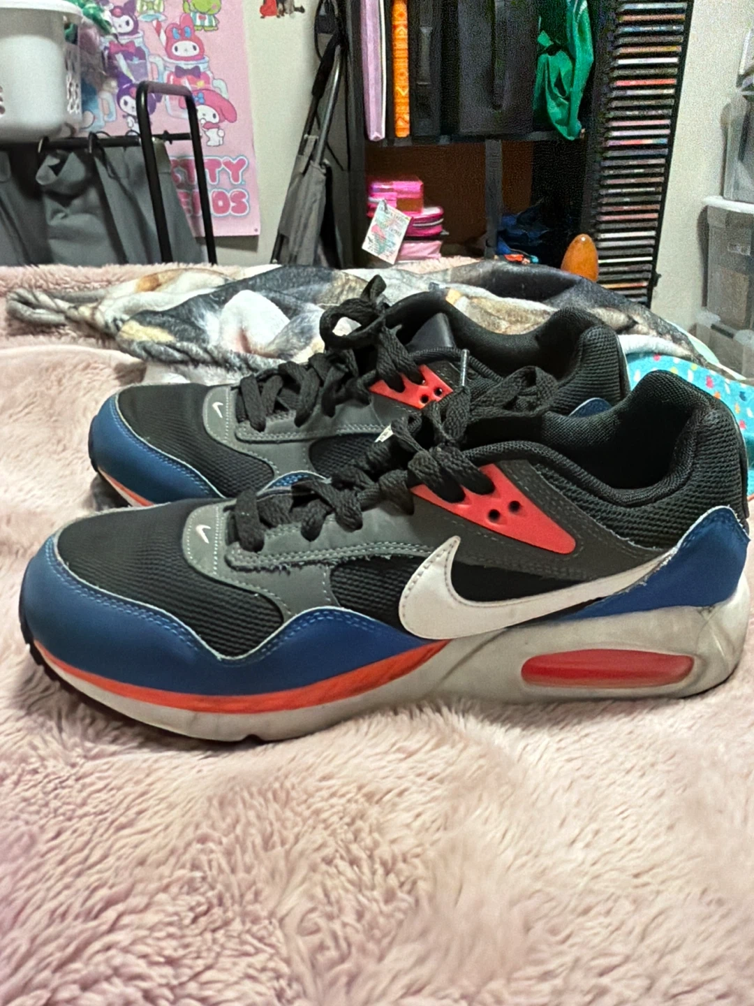 Selling a pair of Nike Air Max Impact sneakers. They are in good condition and have a stylish design with black, grey, blue, and red accents. Perfect for casual wear or workouts!