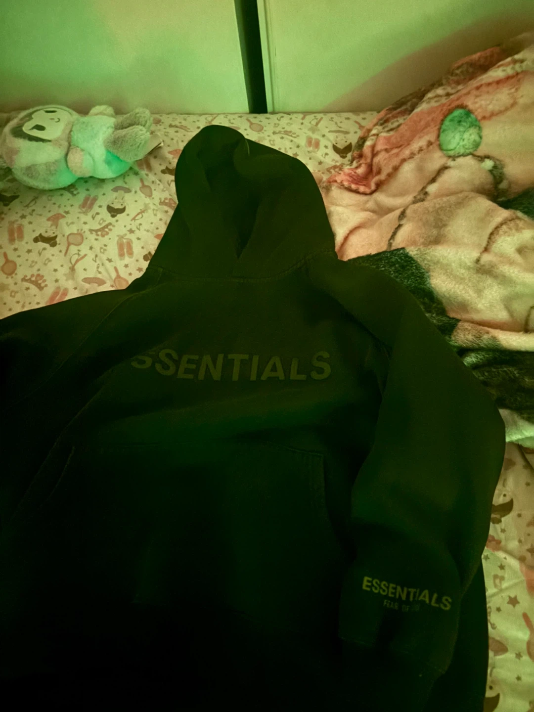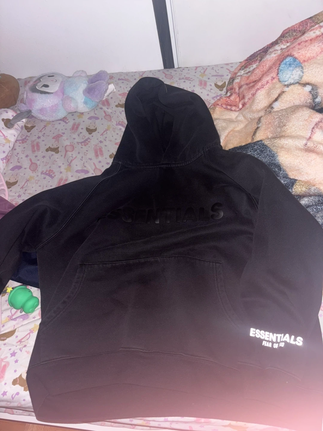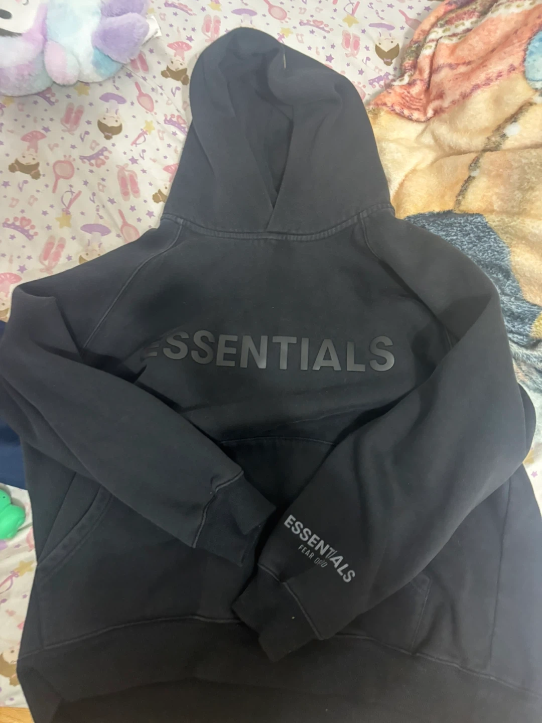 Selling an Essentials Fear of God hoodie in black. It's in great condition and has the classic Essentials logo on the front and sleeve. Perfect for everyday wear!