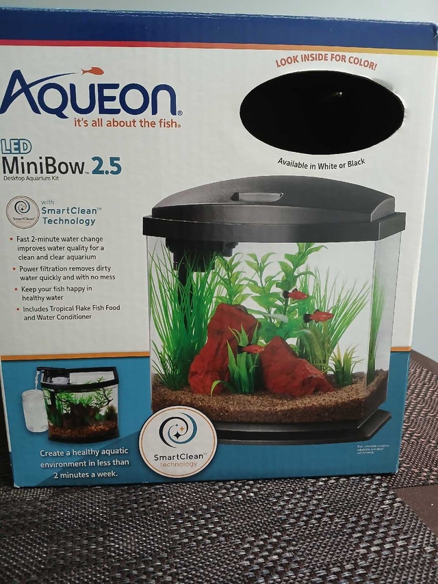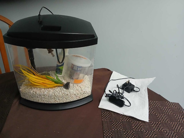 Desktop aquarium kit. Perfect condition. Includes free replacement cartridge, brand new replacement filter, fish food, and water conditioner. Great value, and perfect gift for a little one or fish enthusiast. FISH NOT INCLUDED.