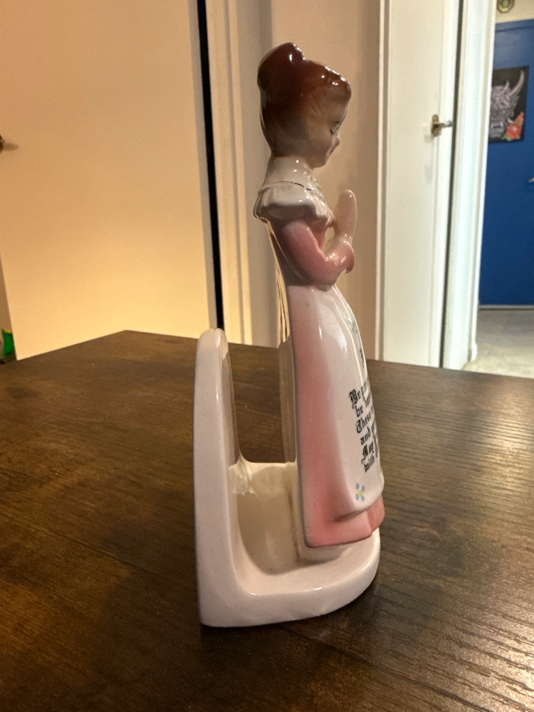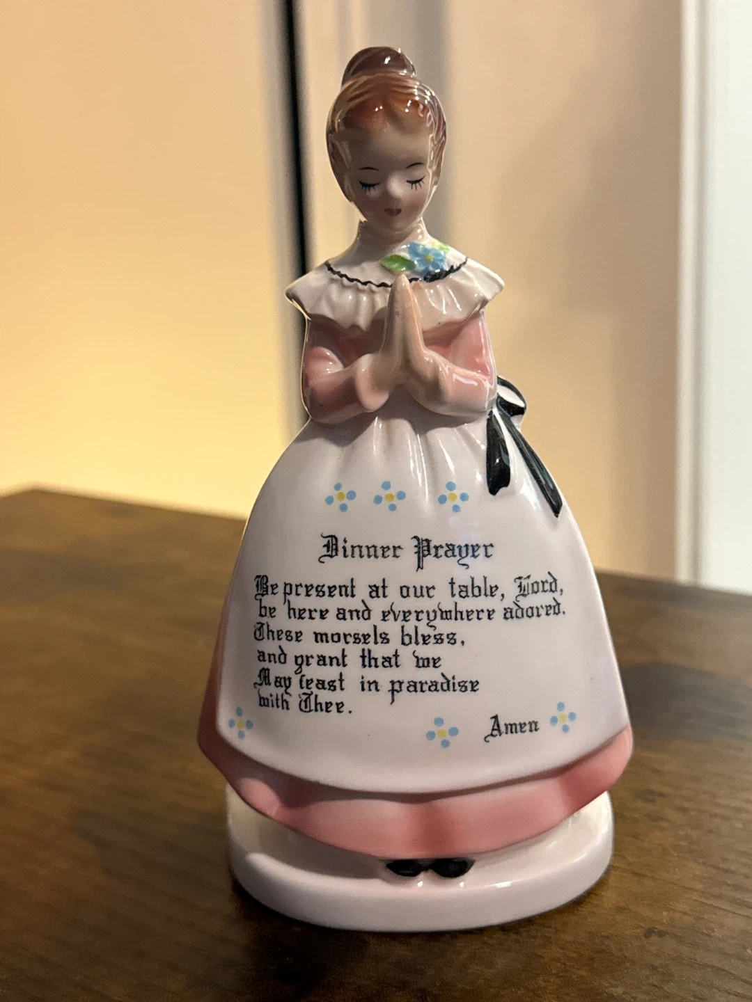 This is a lovely vintage figurine of a girl saying a dinner prayer. It's made in Japan and has a sweet, old-fashioned charm. It would be a great addition to any collection or a unique decorative piece for your home