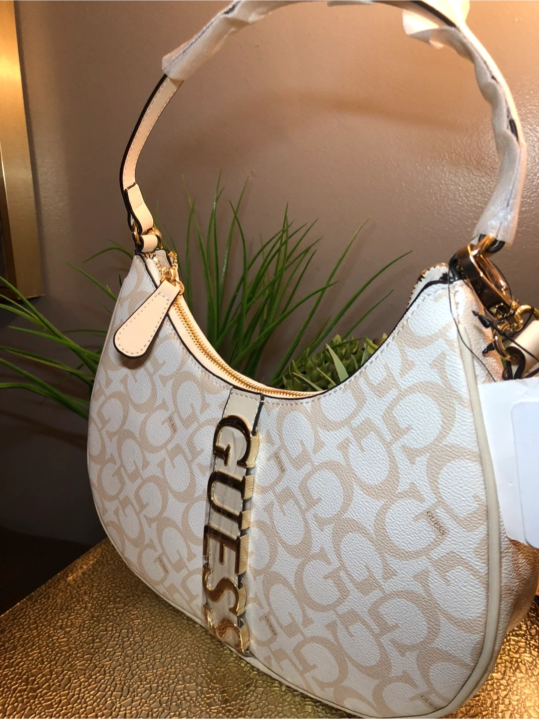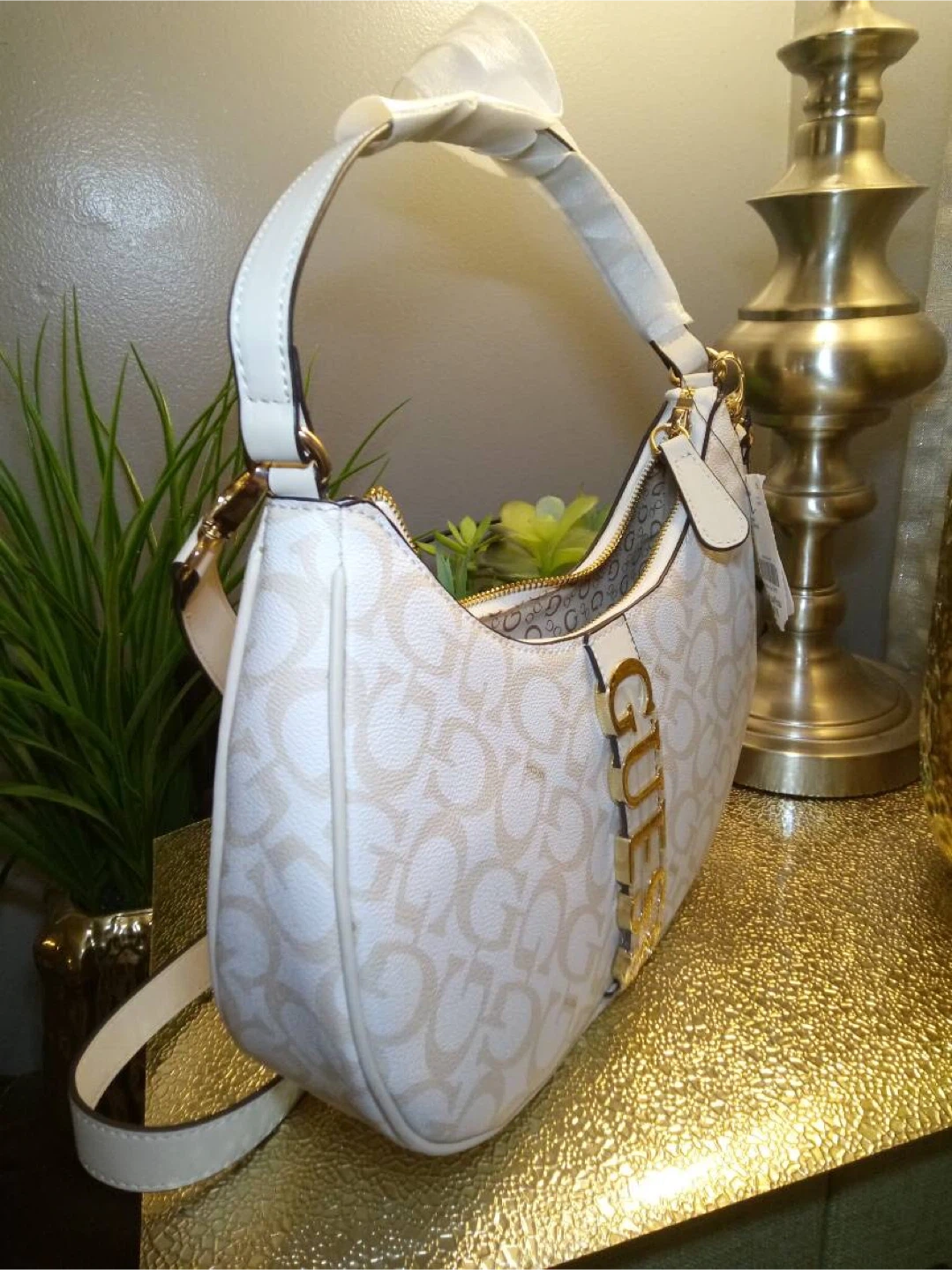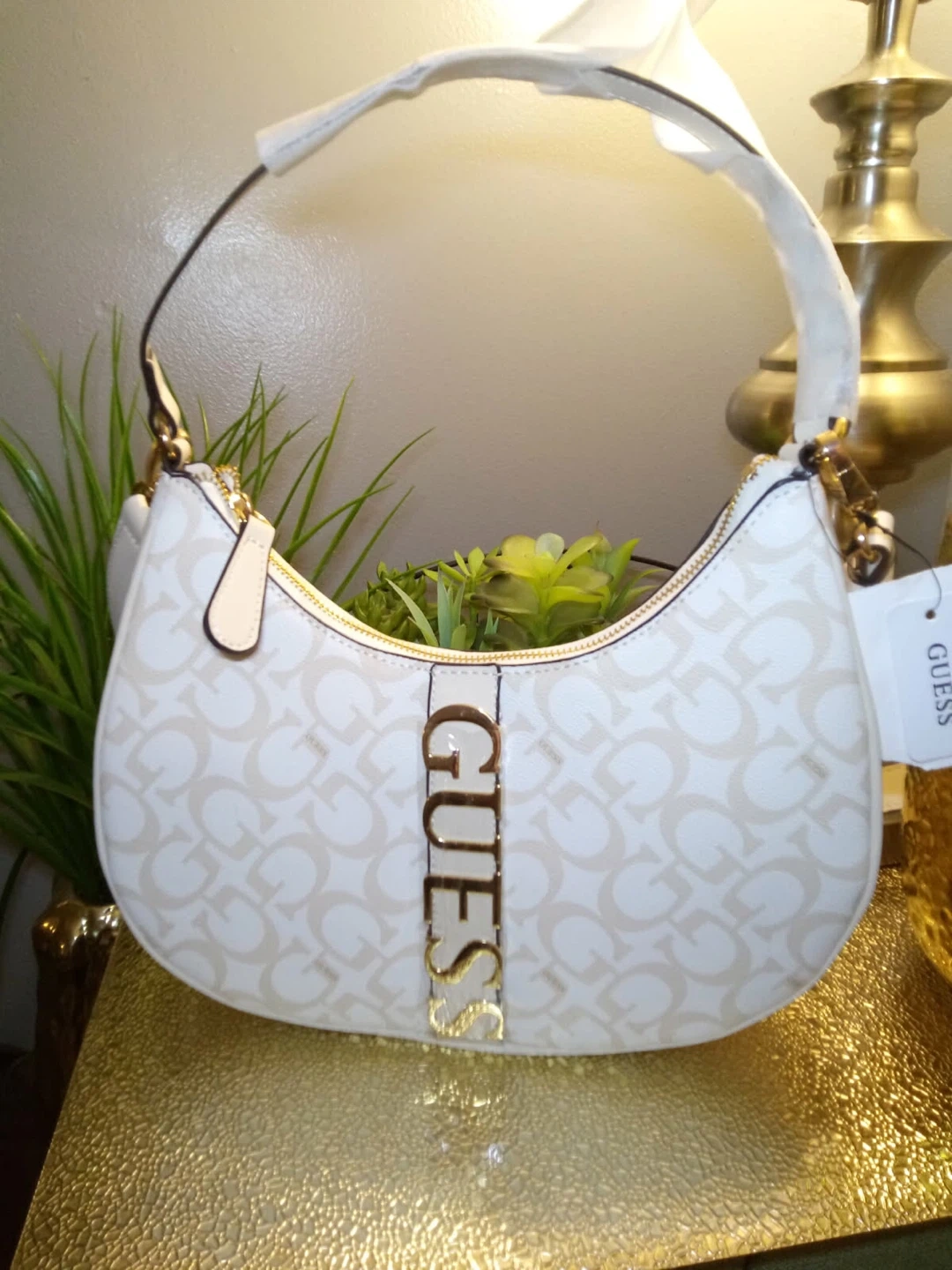 This is a new GUESS hobo bag. It's white with a repeating "G" logo pattern and gold-tone hardware. Perfect for adding a touch of style to your outfit!