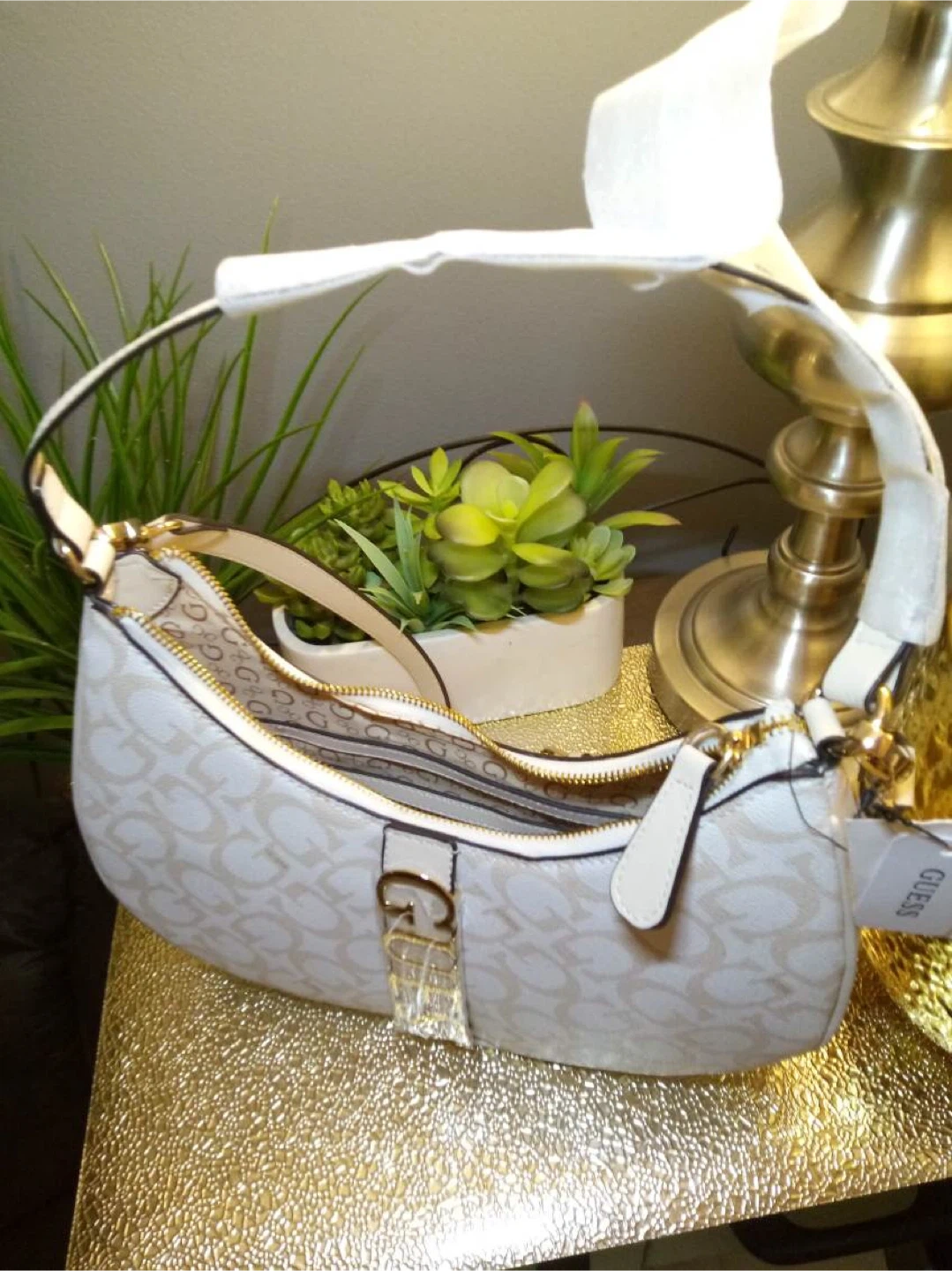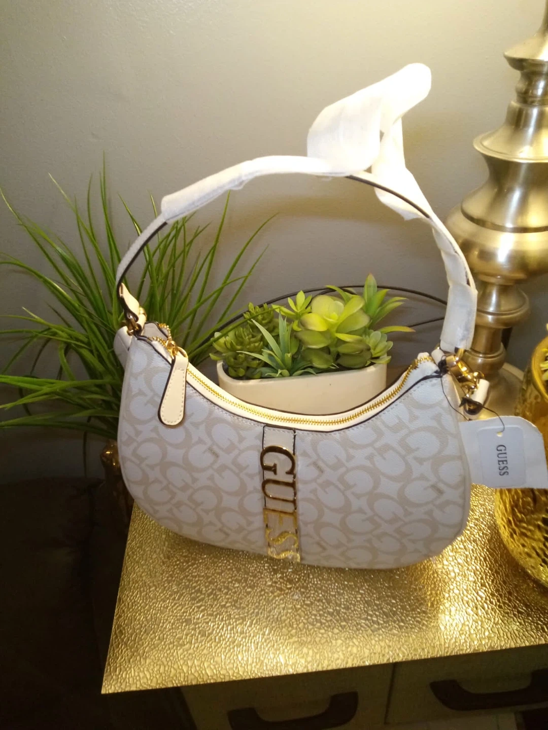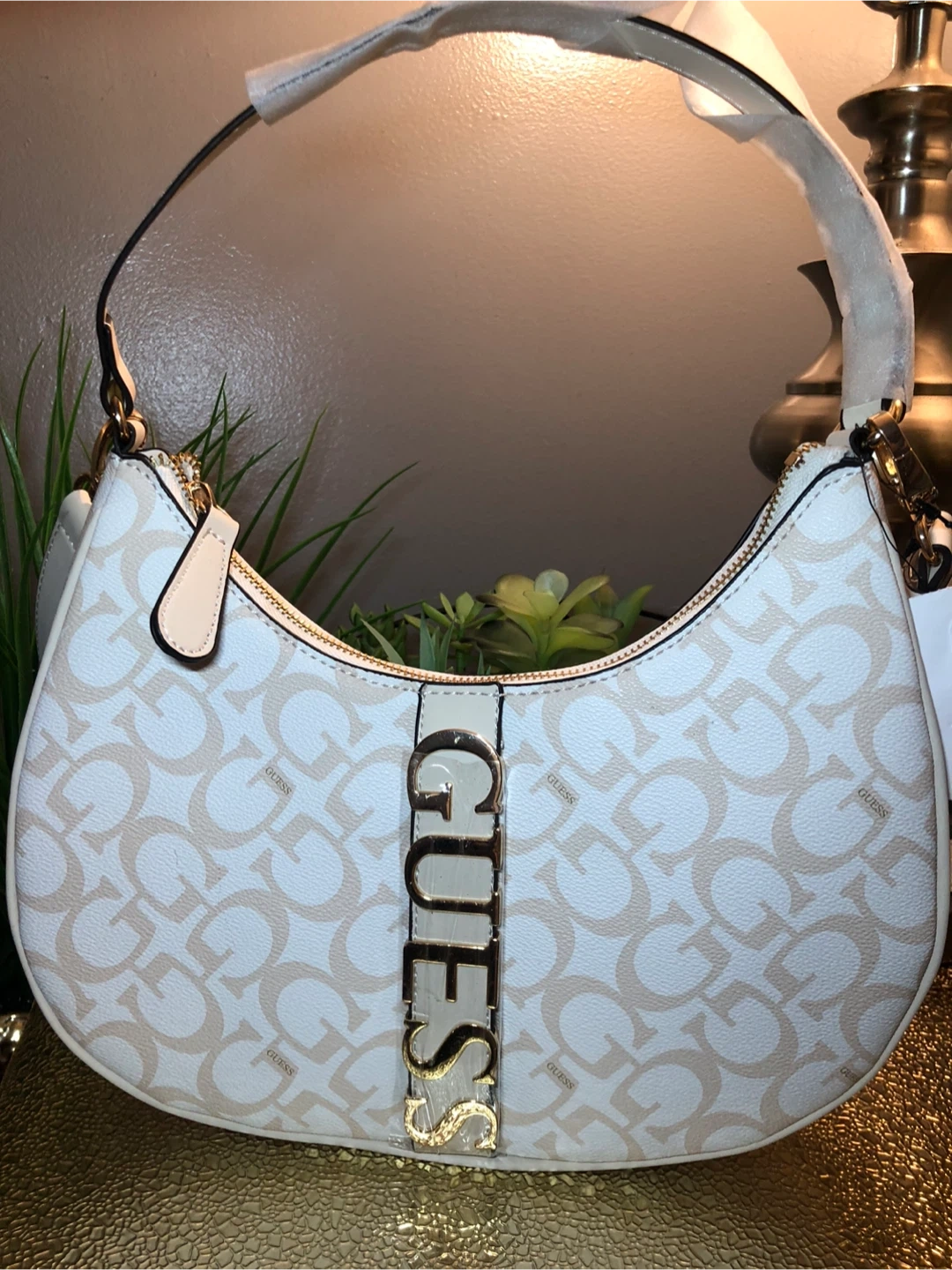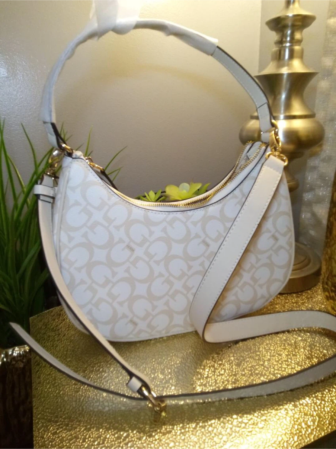 This is a new GUESS hobo bag. It's white with a repeating "G" logo pattern and gold-tone hardware. Perfect for adding a touch of style to your outfit!