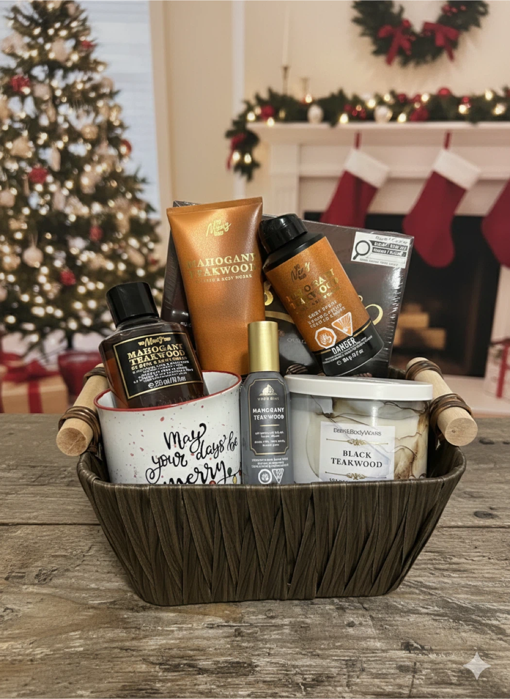 Selling a Bath & Body Works gift basket featuring the Mahogany Teakwood scent! It includes a variety of items, perfect for creating a cozy atmosphere. The basket contains the following items:
