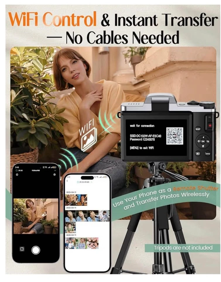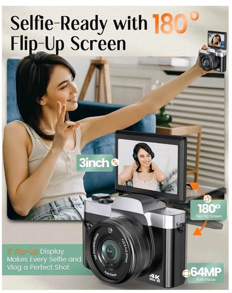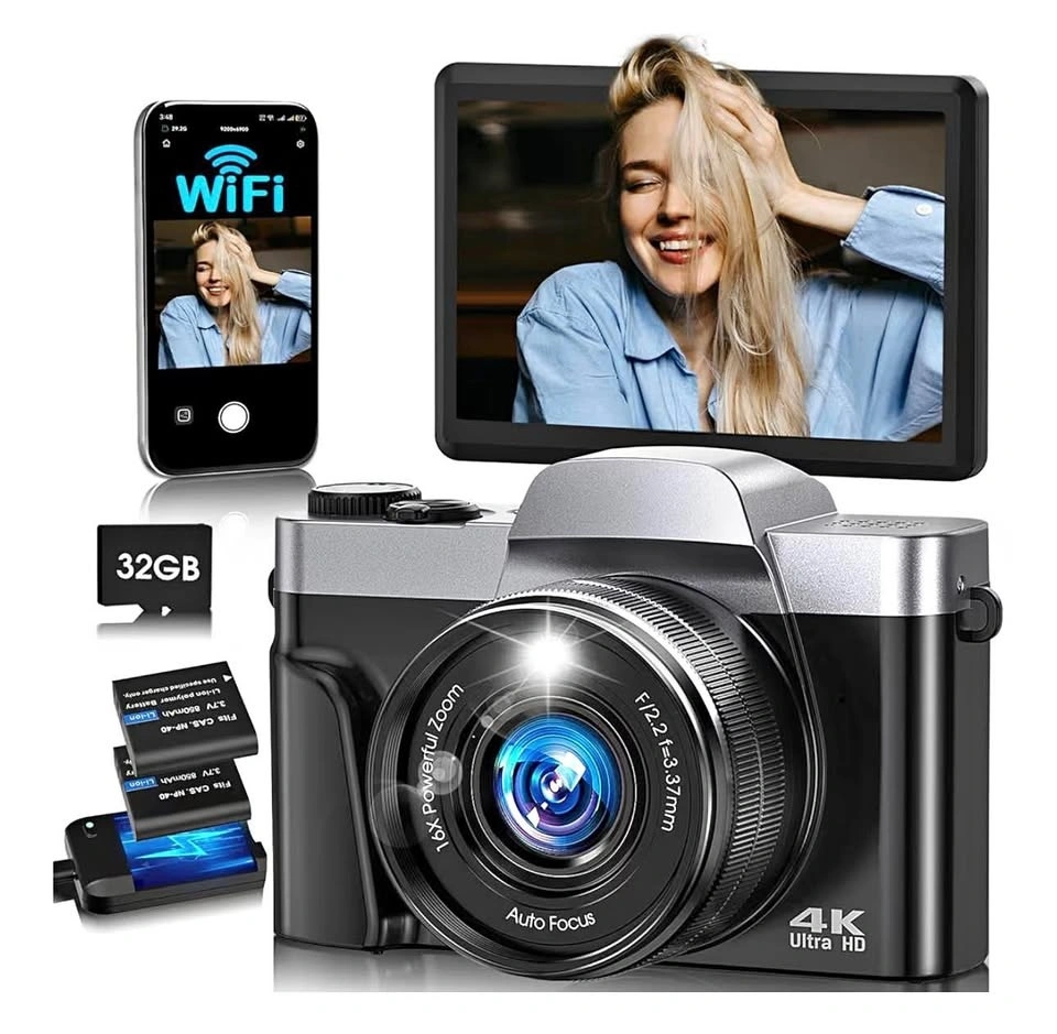 4K Digital Camera for Photography with WiFi, 64MP Autofocus Vlogging Camera for YouTube, 3'' 180° Flip Screen Compact Travel Camera for Teens with 32GB SD Card, 16X Zoom, Anti-Shake, 2 Batteries (Black)