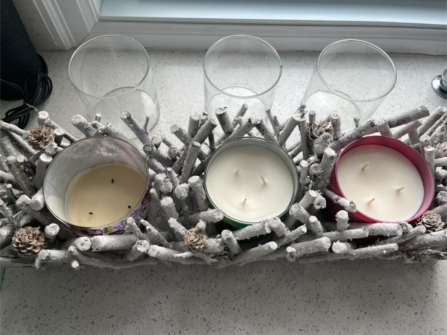Has 3 large glass inserts. Holds candles the size of the 3 wick BBW candles. Size 22” x 7” x 6”