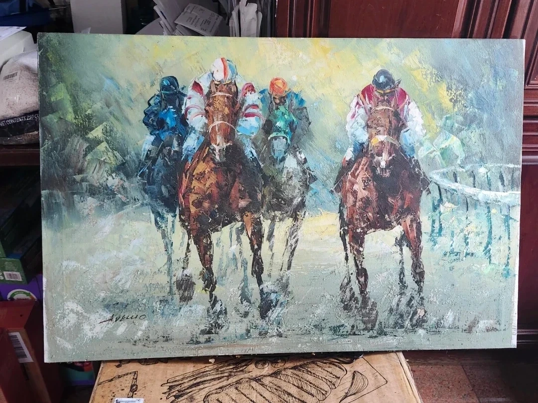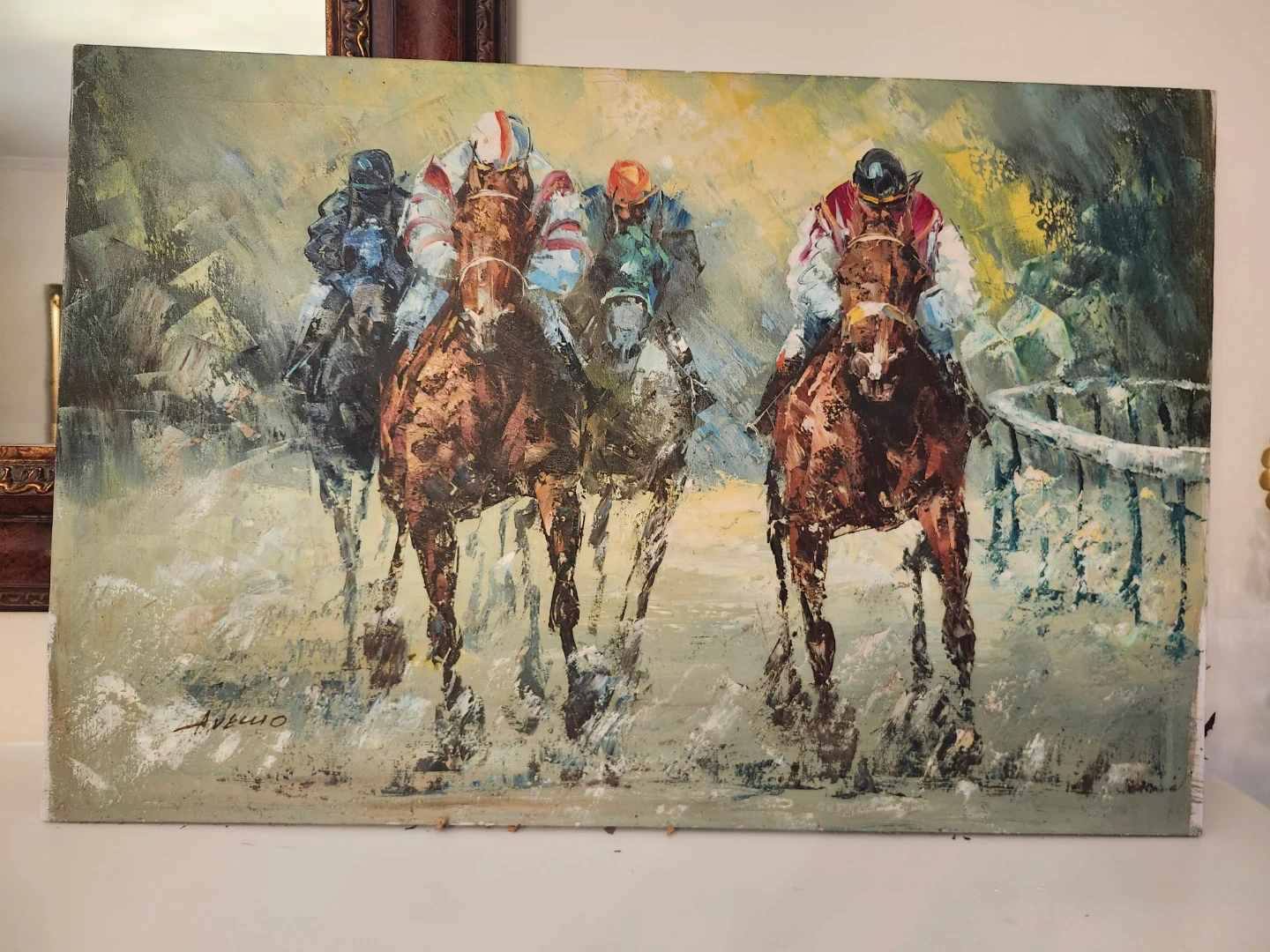 A beautiful oil painting of a horse race. It depicts four horses and their jockeys in a dynamic scene. The painting is signed 'Avrekio'.