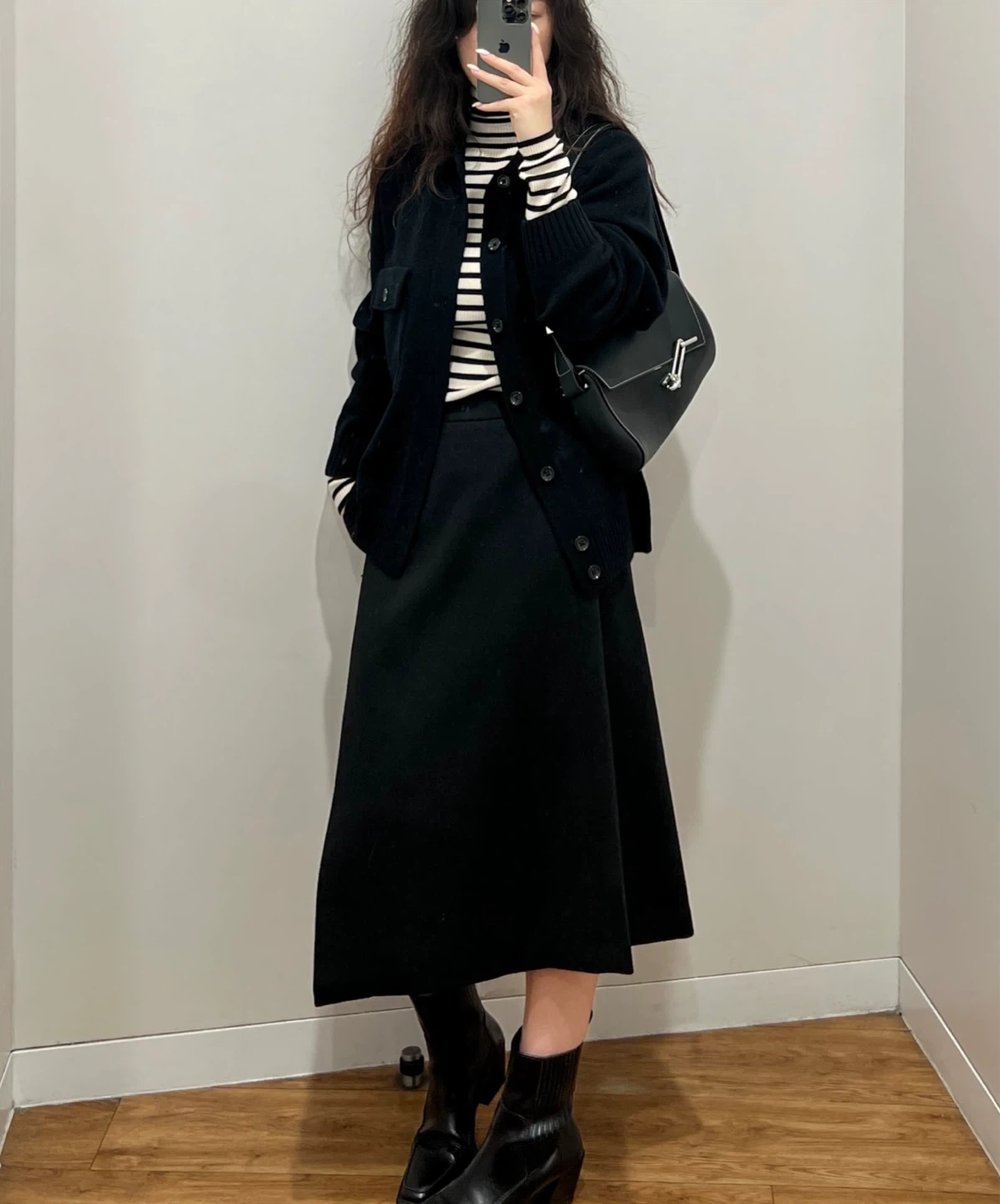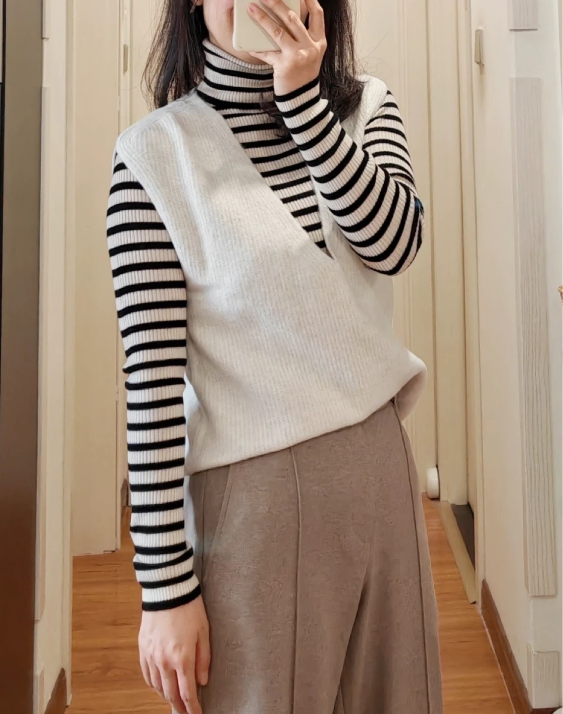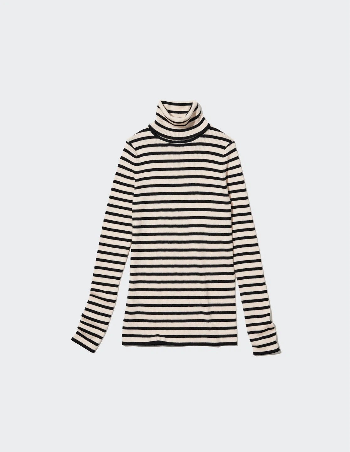 A stylish striped turtleneck top! It features a classic design with long sleeves, perfect for layering or wearing on its own. The neutral colour palette makes it versatile for various outfits