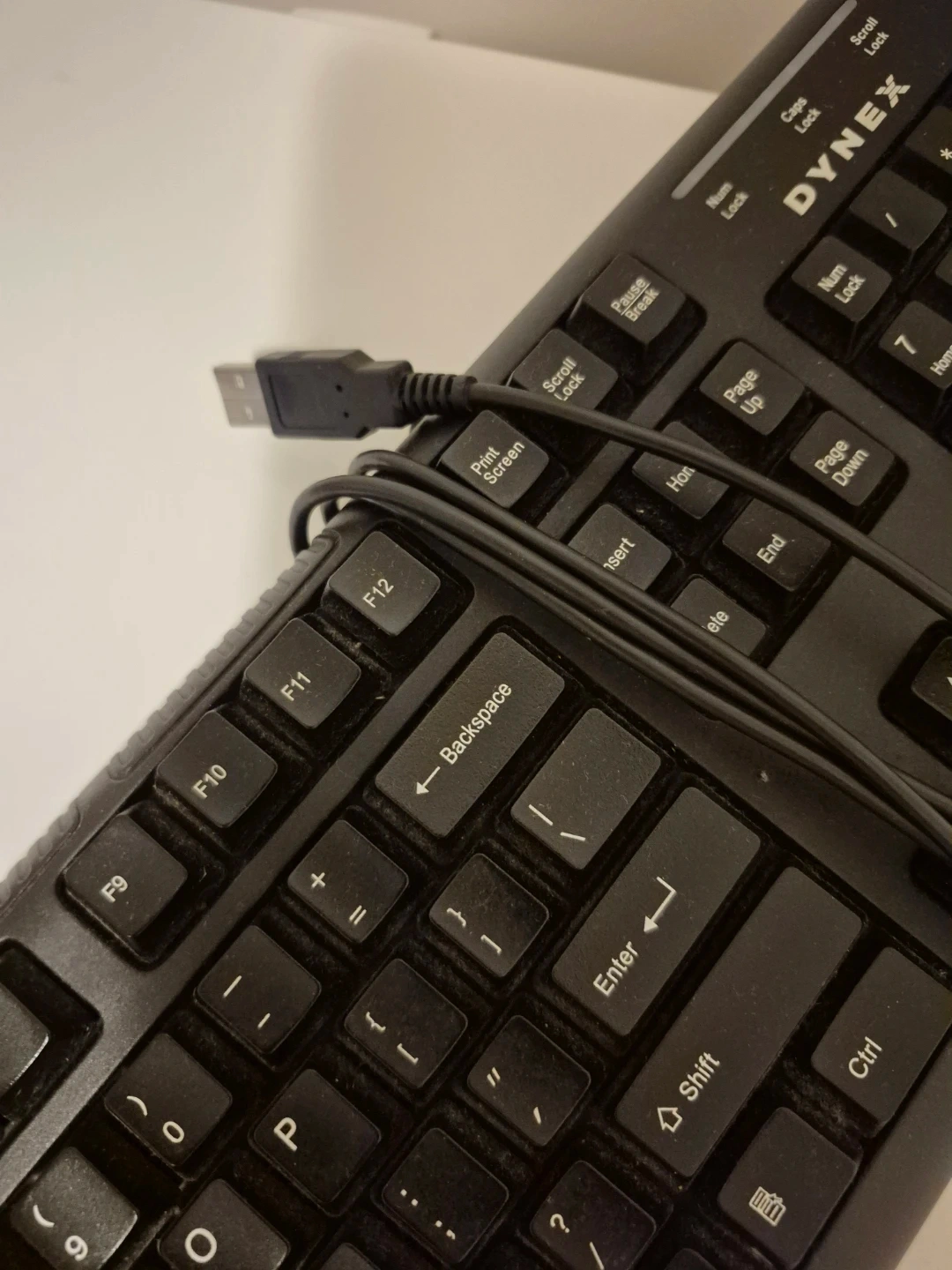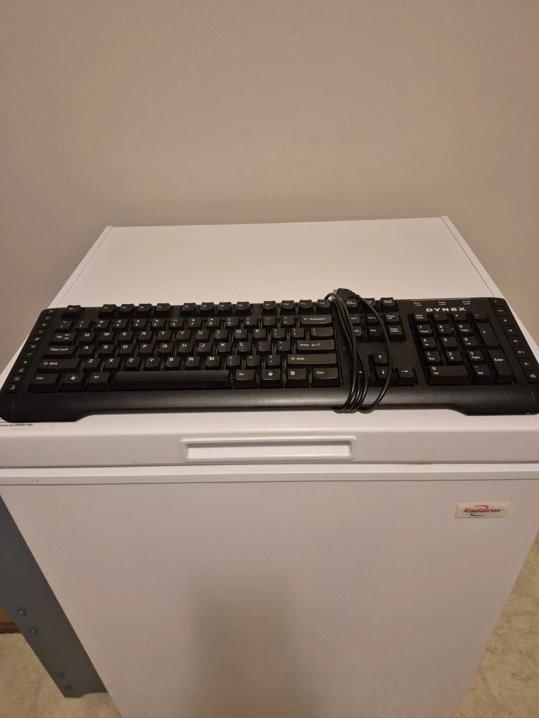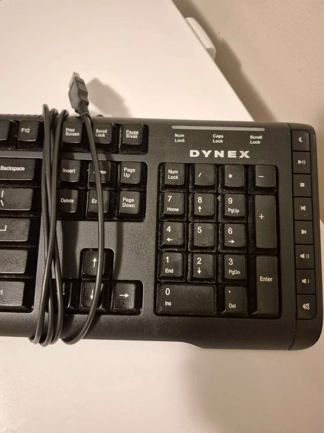 Offering for FREE a Dynex keyboard in black. It's a standard keyboard layout with a number pad. Perfect for everyday use!