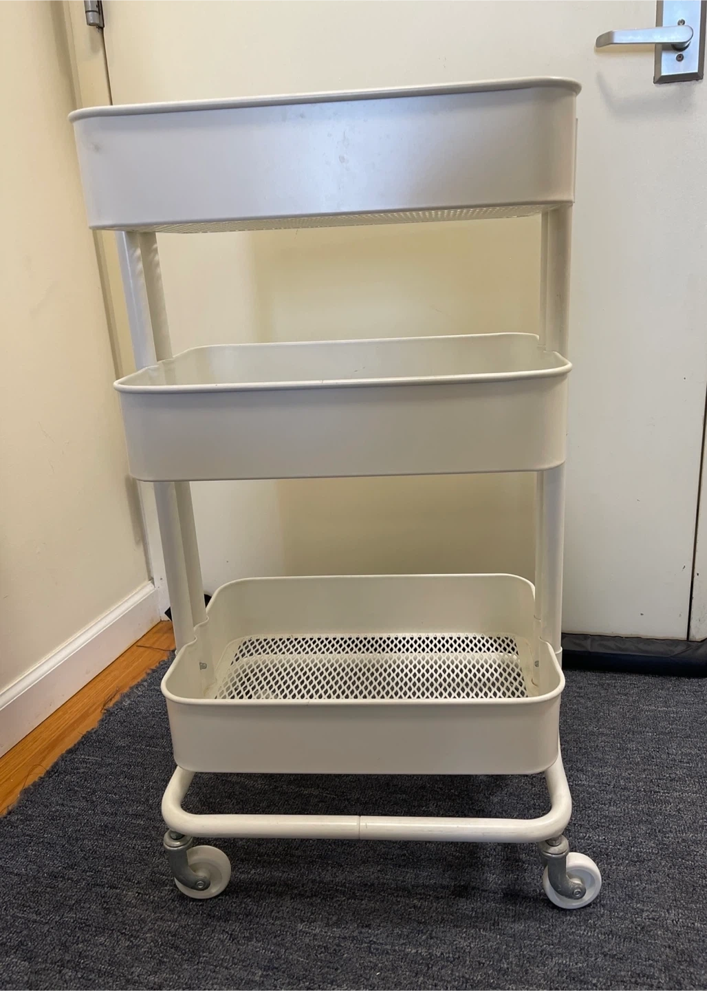 Selling a white IKEA Raskog utility cart. It's in good condition and ready for a new home! Great for storage and organization in any room