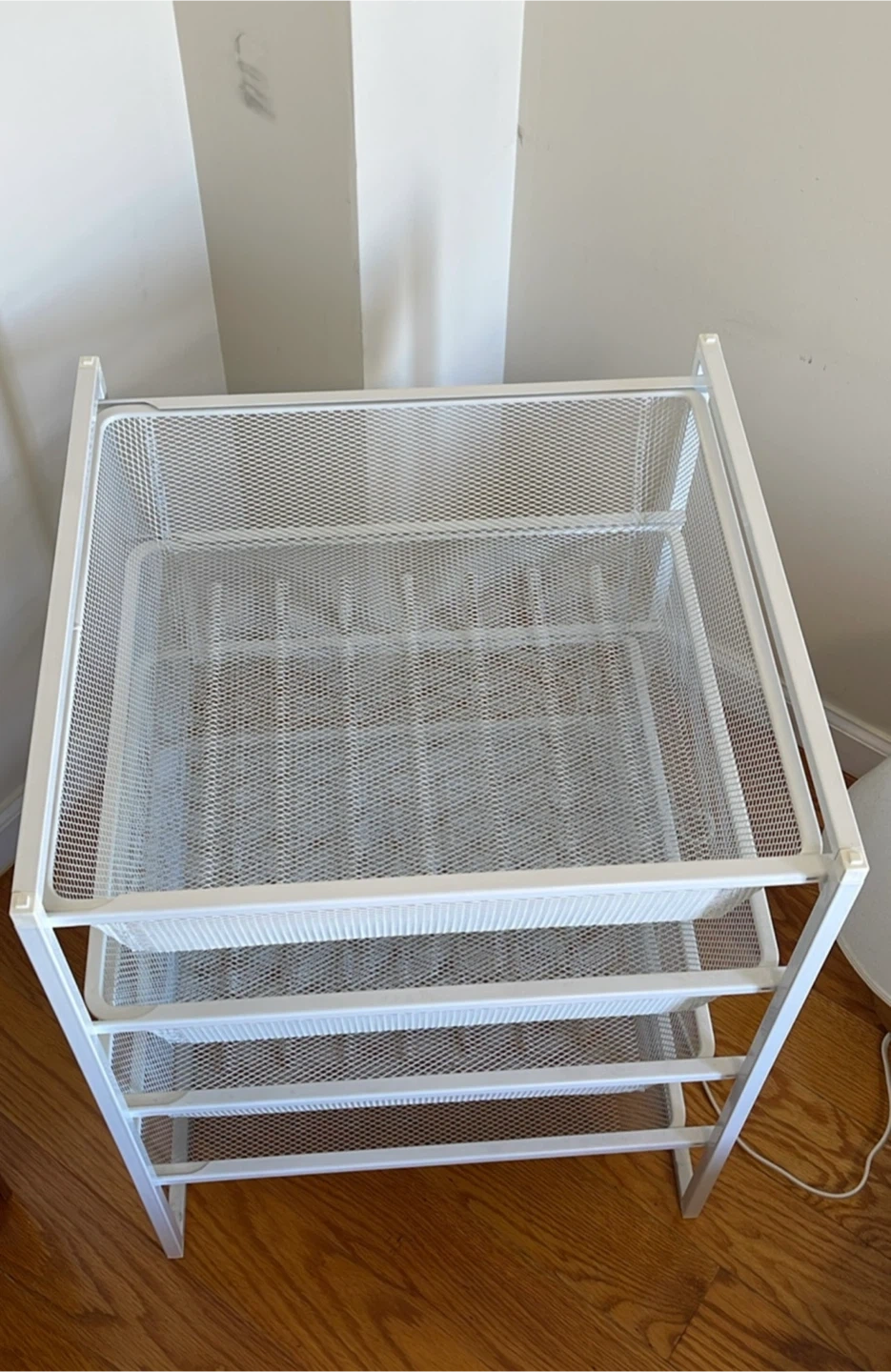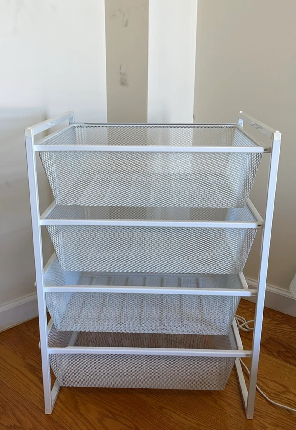 I'm selling a white metal storage rack from IKEA. It has four mesh basket drawers. It's great for organizing any room in your home!