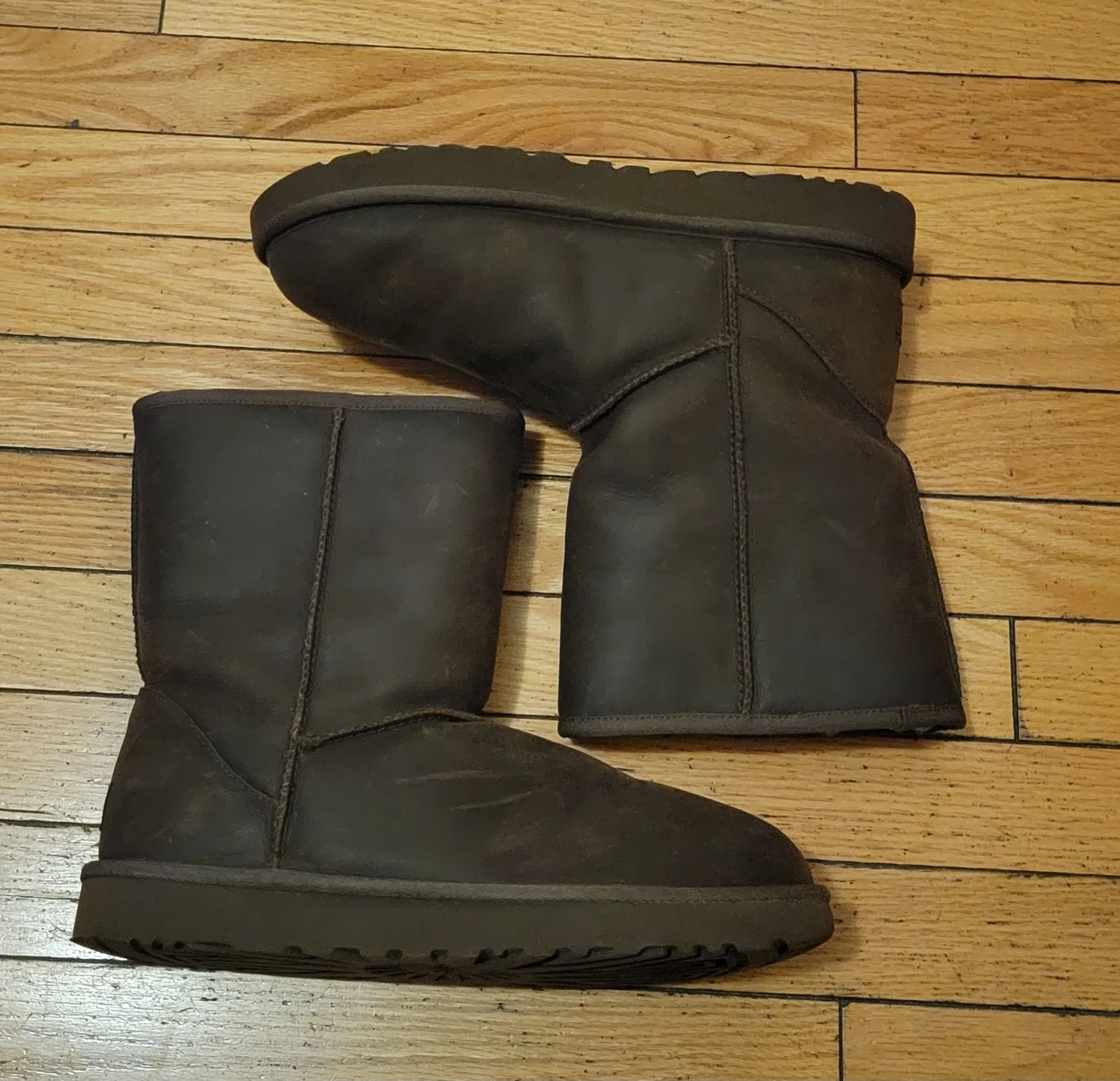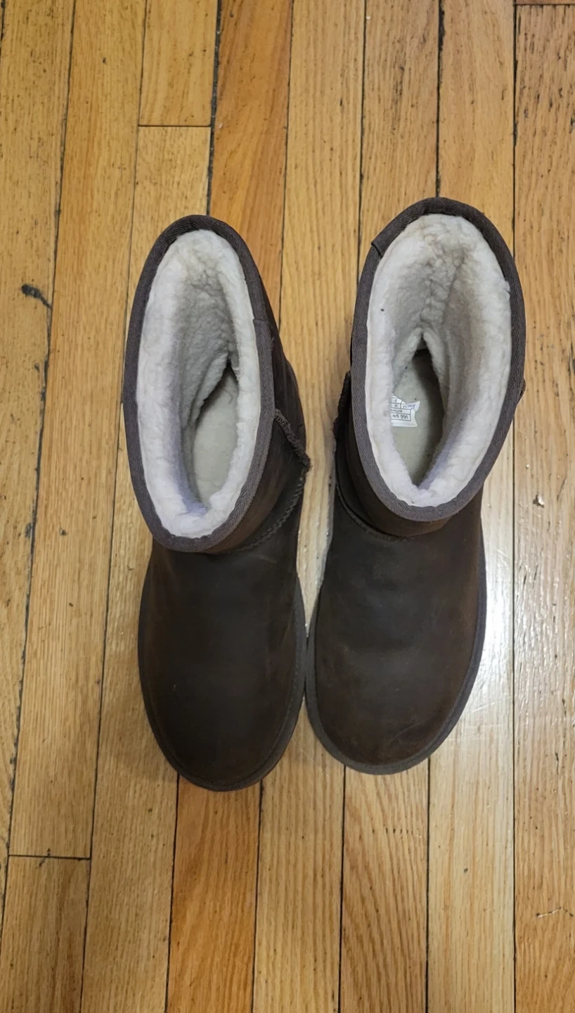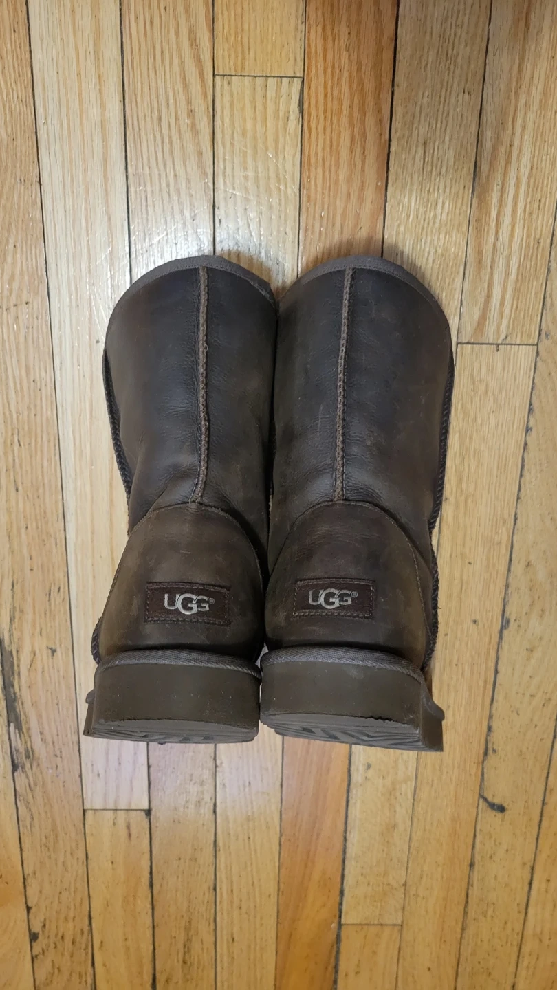 Selling a pair of UGG leather boots in size 11. They're in good condition and ready for a new owner! The boots are made of leather and have a warm, cozy lining. Perfect for the colder months!