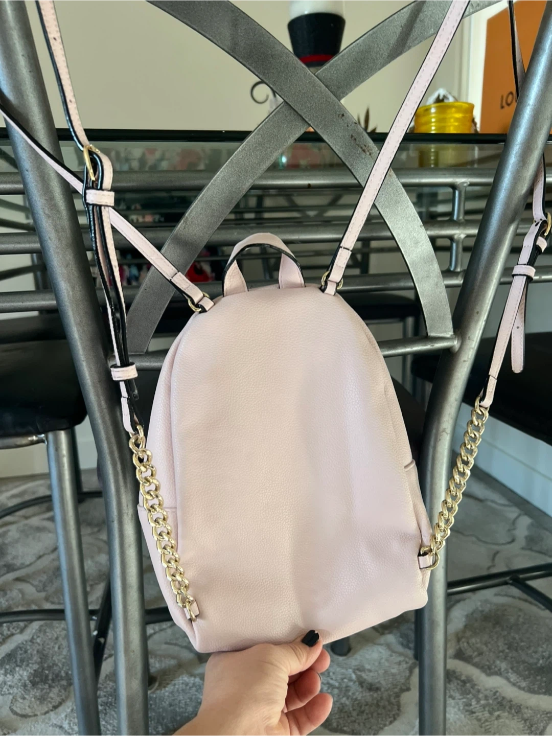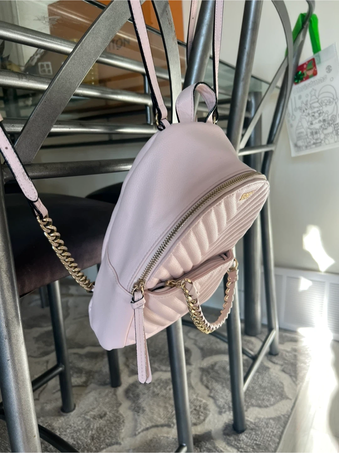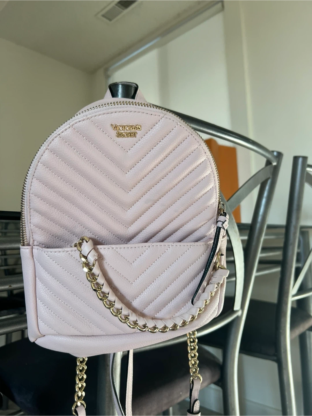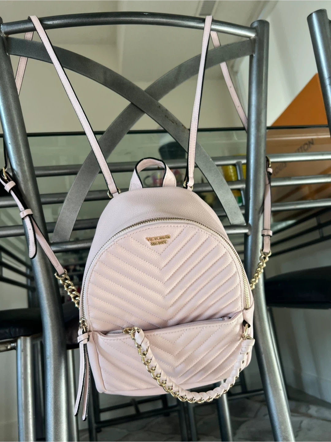 Selling a cute Victoria's Secret mini backpack in a lovely pink colour! It features a stylish chevron pattern and gold chain detailing. It's perfect for carrying your essentials in style!
