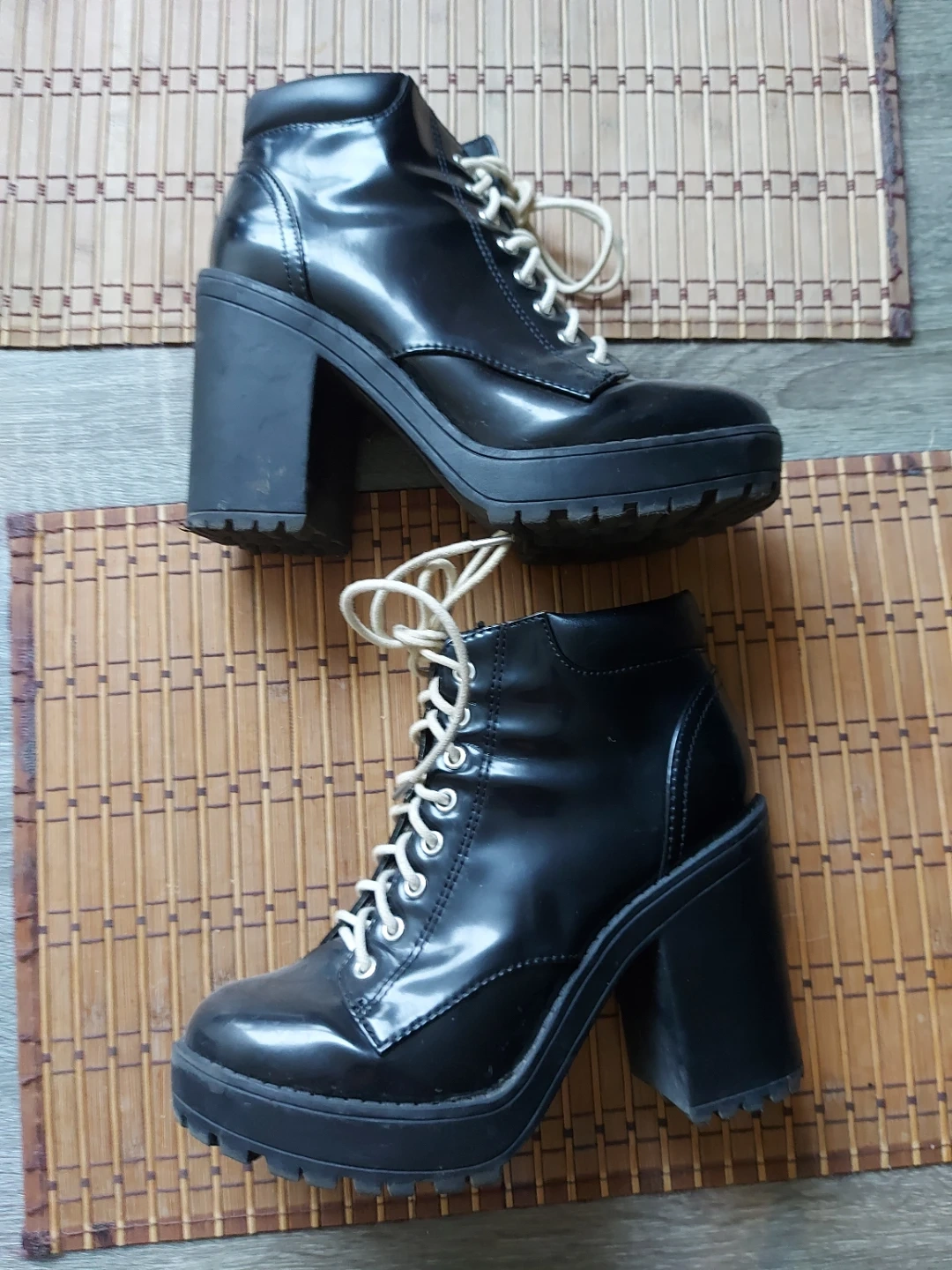 These black platform heel boots are in great condition! They feature a lace-up design and a chunky heel, perfect for adding some edge to your look. There are some signs of wear.