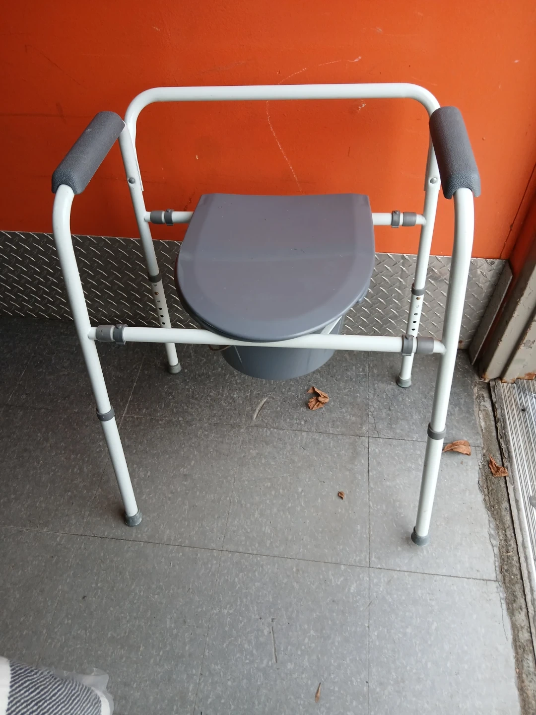 Here's a commode chair that's in good condition. It features adjustable legs for customized height and padded armrests for added comfort. Perfect for anyone needing a bit of extra support!