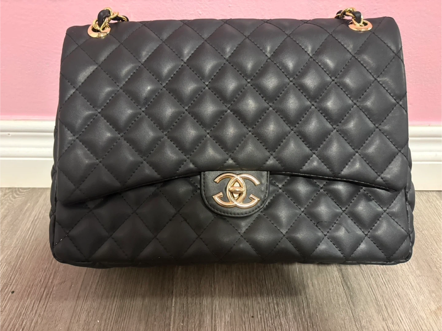 Selling a beautiful Chanel handbag in black quilted leather. It features the classic Chanel logo and gold chain detailing. There are some signs of wear, as shown in the pictures, but it's still a stunning piece!