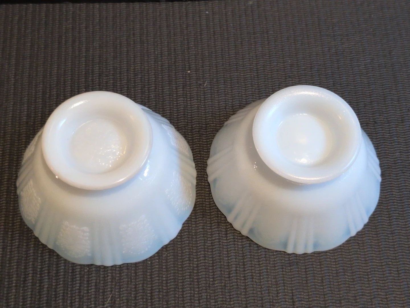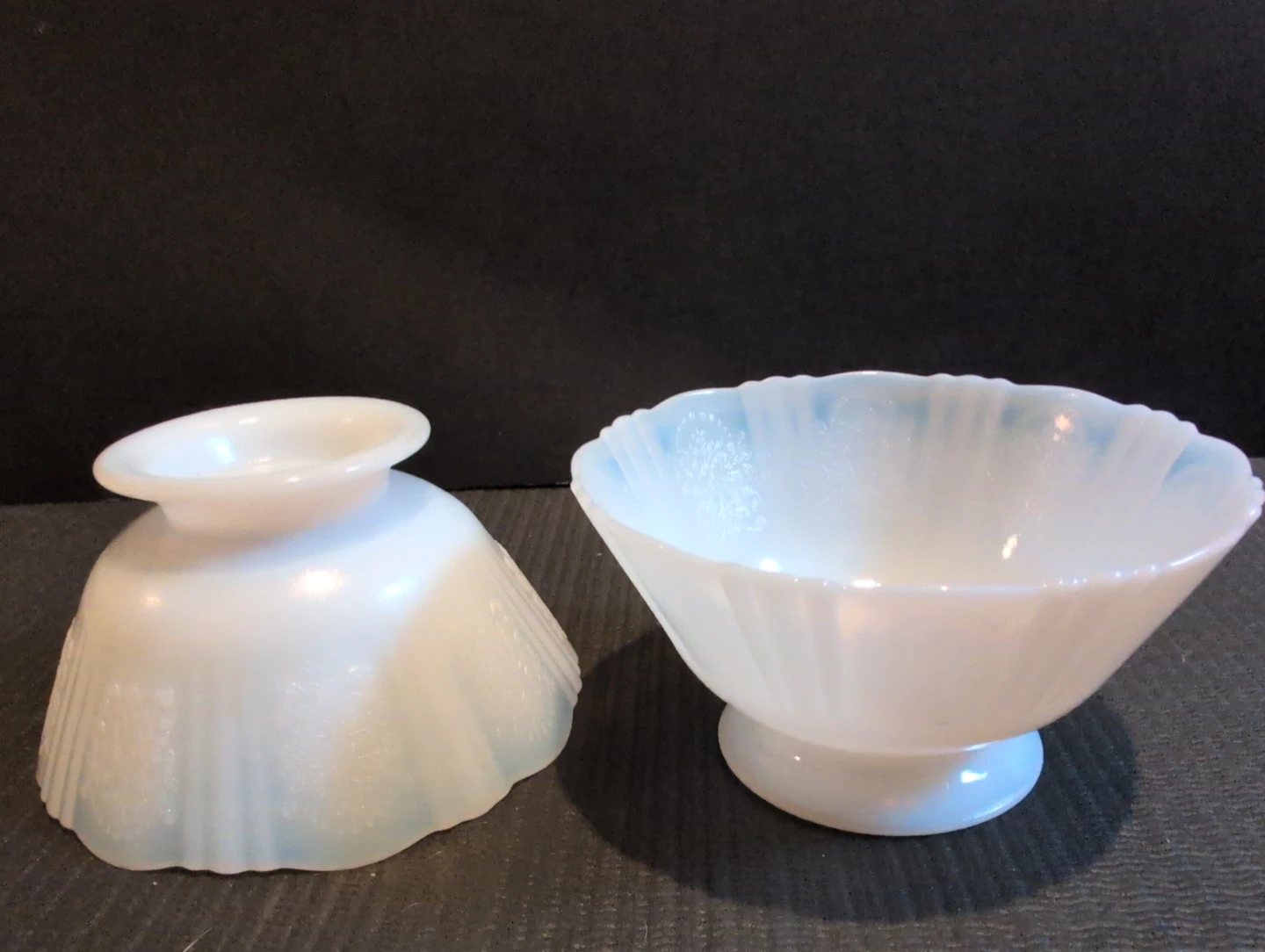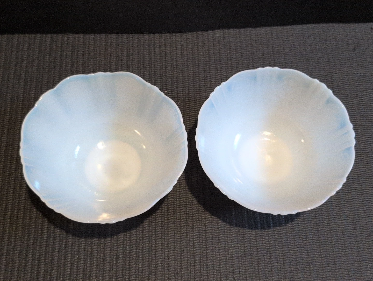 Selling a set of two vintage milk glass footed dessert bowls. They have a delicate, fluted design and a lovely opalescent sheen. They are in great shape, no chips or cracks. Perfect for individual servings! 4.25" Diameter