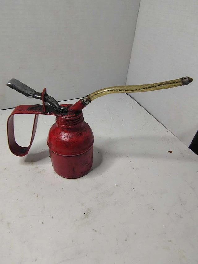 This is a vintage oil can with a flexible spout, perfect for adding a touch of nostalgia to your workshop. Showing signs of use, it still has plenty of life left for any hands-on enthusiast. This oil can is ready to get back to work! If the ad is up, it's still available.