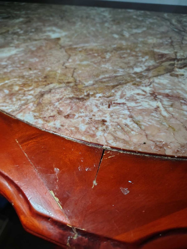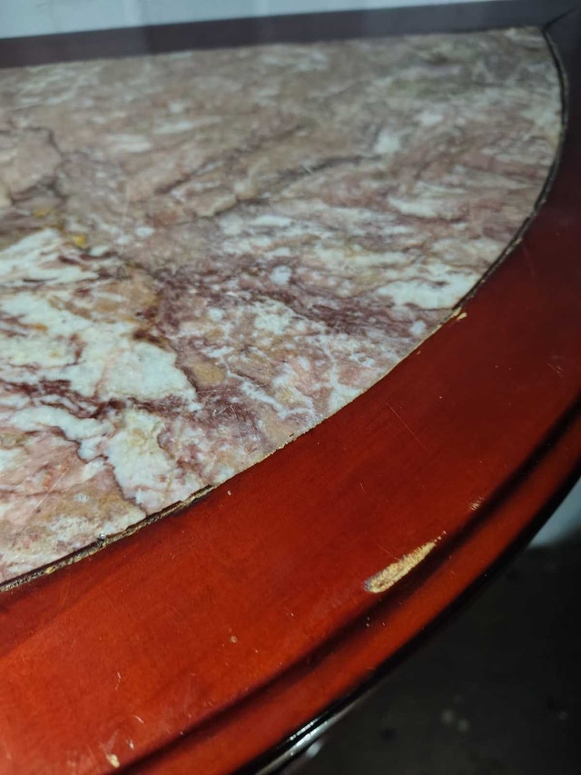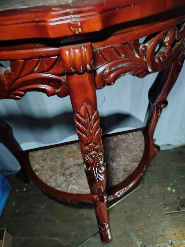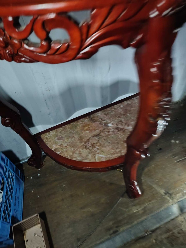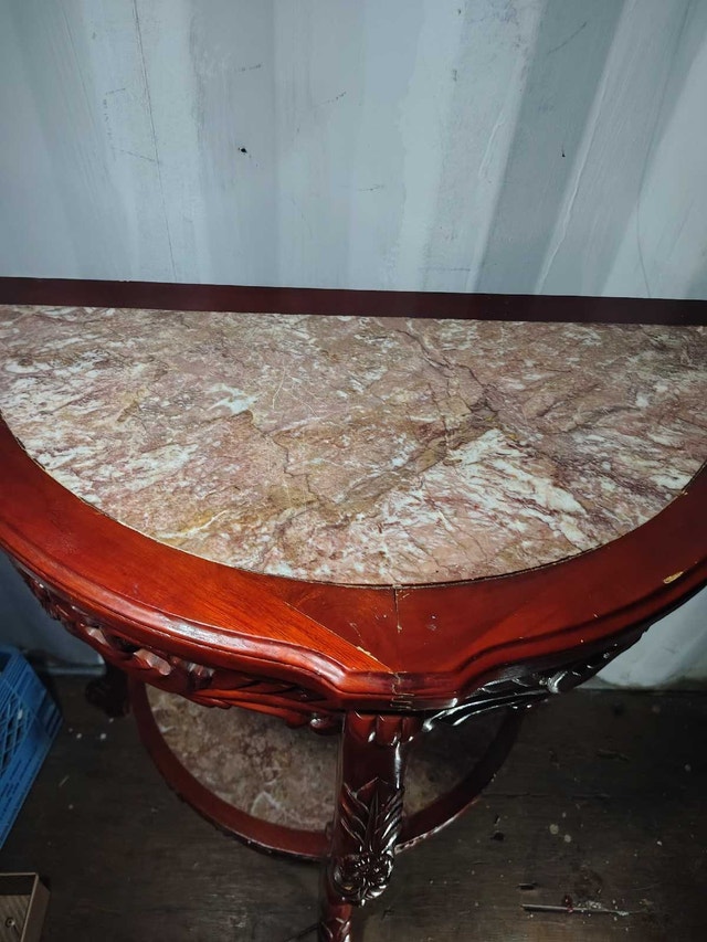 This is a used half-moon shaped table that features a unique marble top and decorative carved wood legs, perfect for adding a touch of elegance to any space. As you can see in the pictures the table does have some damage. Priced accordingly.
