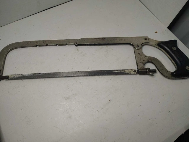 This is a used Millers Falls No. 48 hacksaw, a handy tool for cutting metal and other materials. Its sturdy construction and ergonomic handle make it a reliable choice for any workshop. The saw shows signs of wear but remains in good working condition. Specifications: