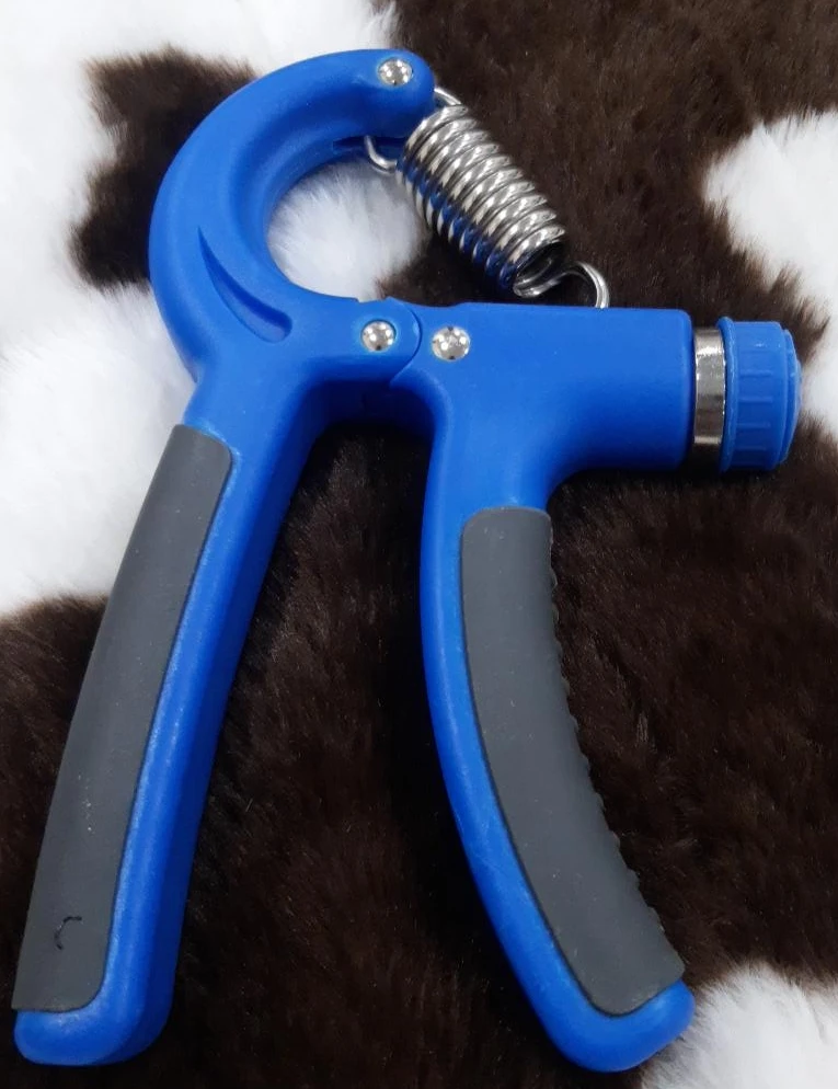 Selling a blue hand grip strengthener! It's in great shape and ready to help you build up your hand strength. The handles are blue with grey grips, and there's a silver spring for resistance. Perfect for anyone looking to improve their grip!