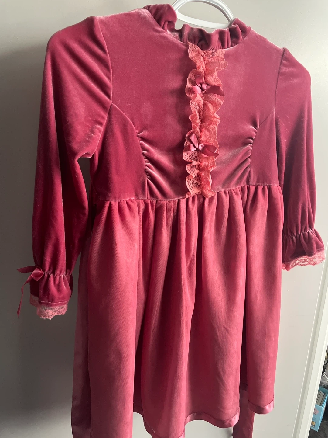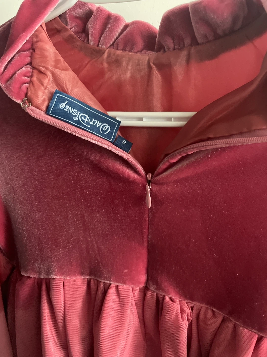 This is a beautiful pink velvet dress from Walt Disney in size 8. It's in great condition and ready for a new owner! The dress features lovely details like ruffles and lace accents, perfect for a special occasion or dress-up fun