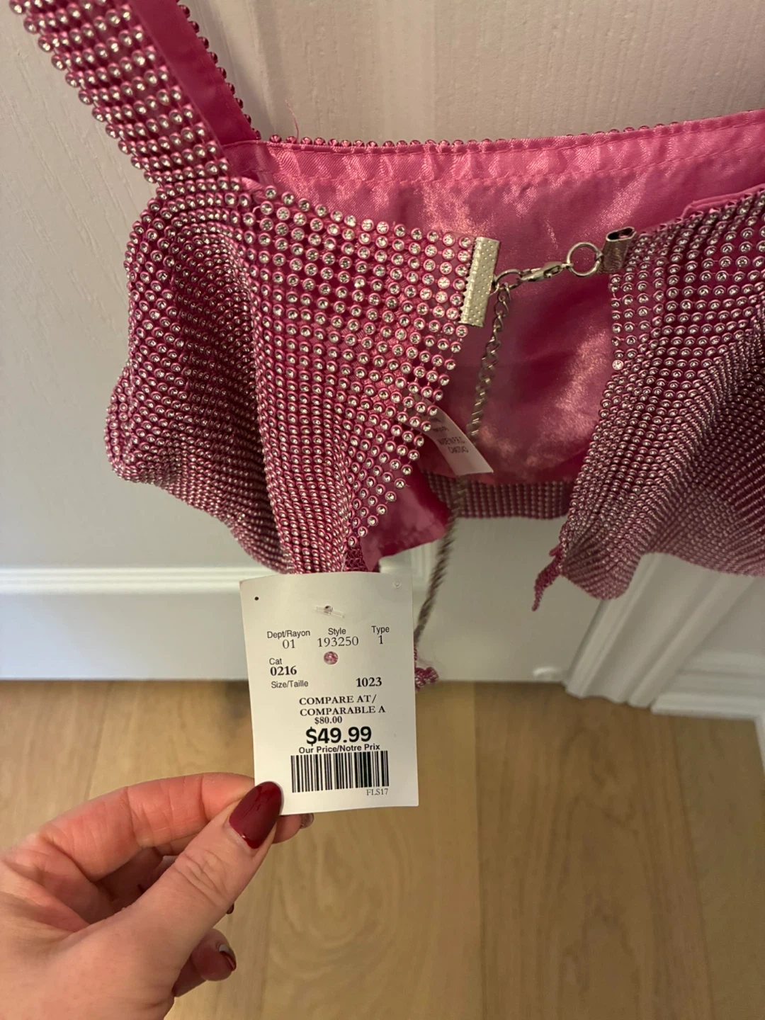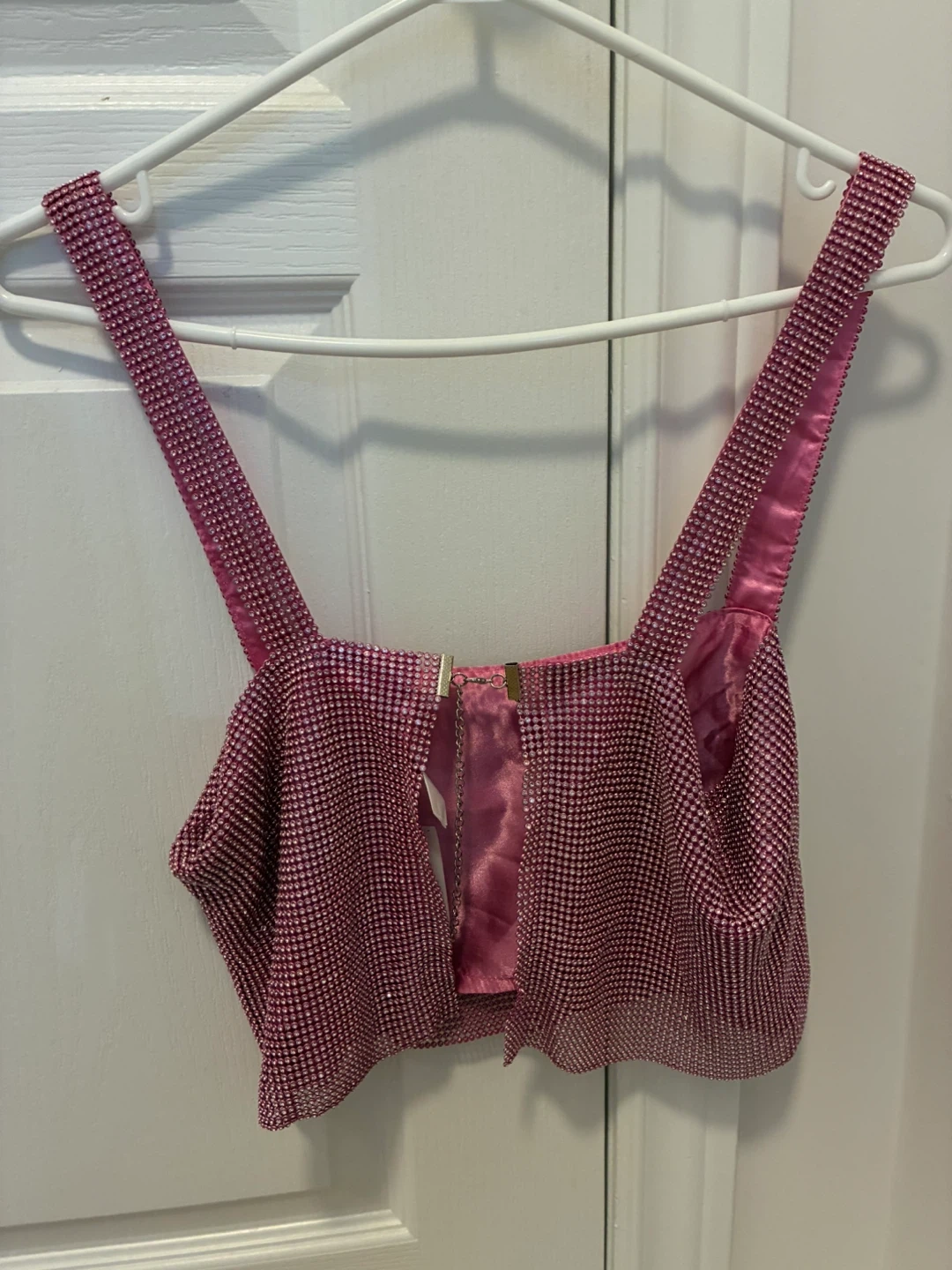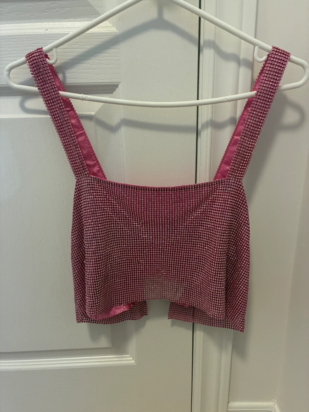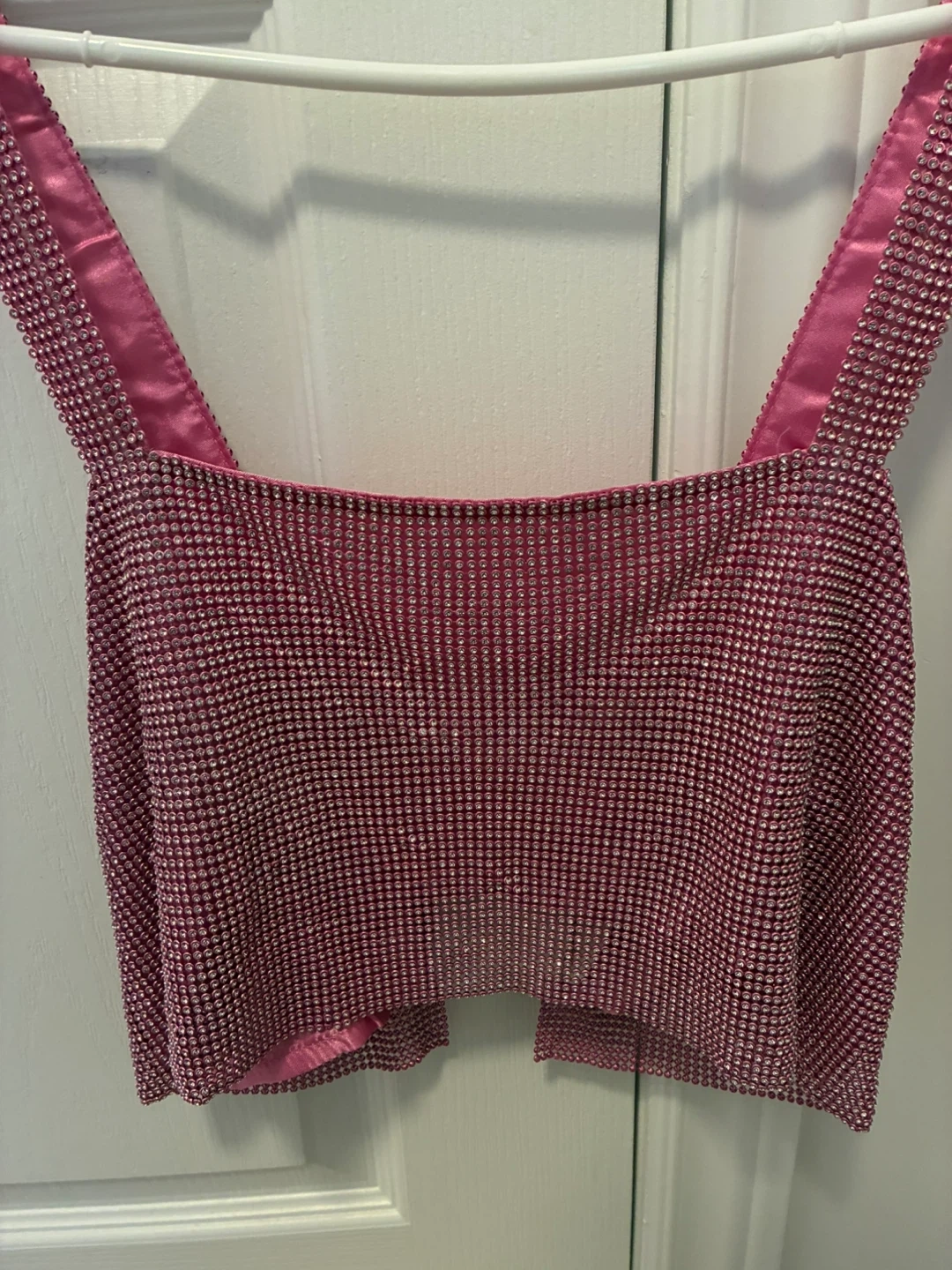 Selling a cute pink rhinestone top. Never worn still has the tags on it. Size small. The tag shows it was originally priced at $49.99.