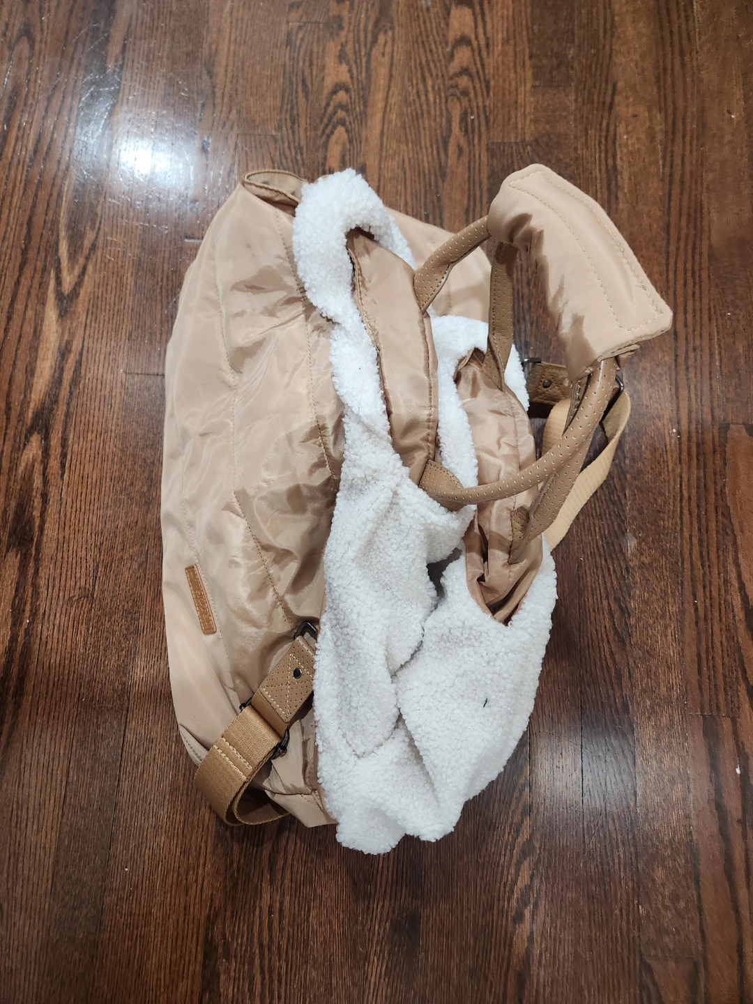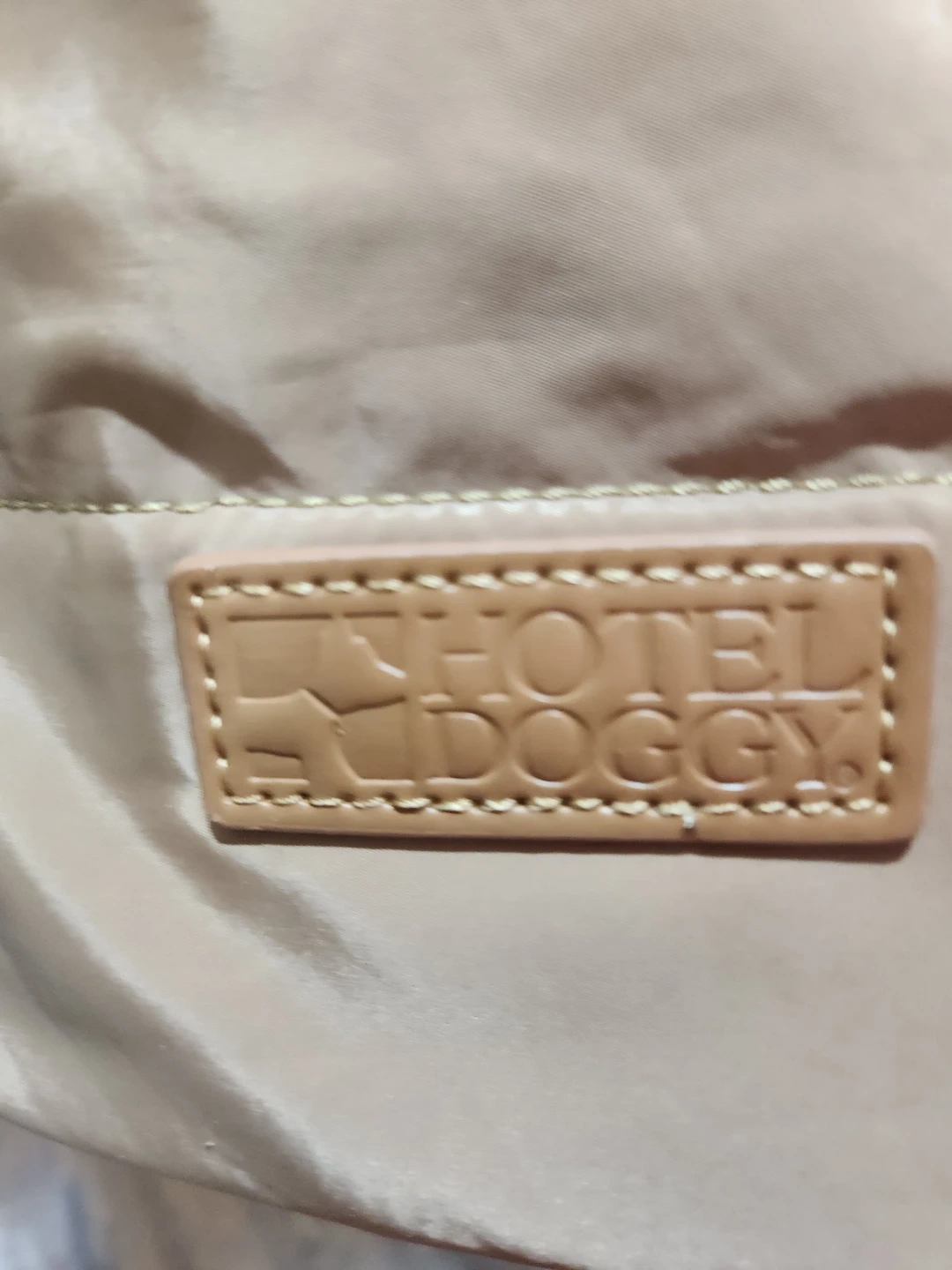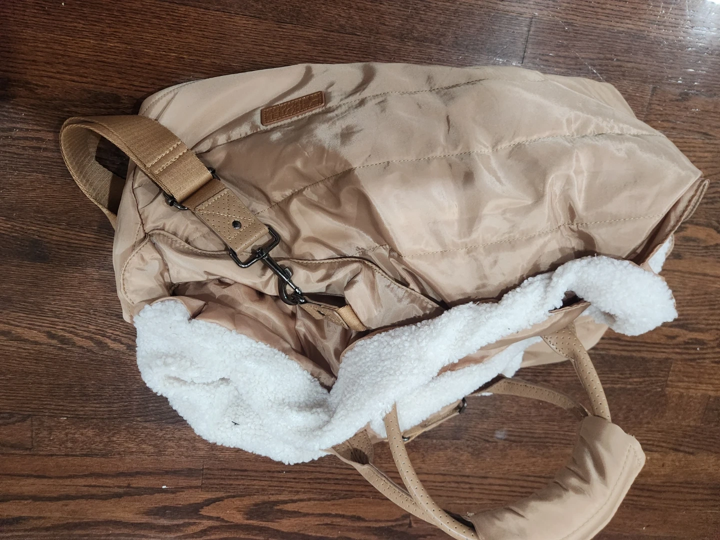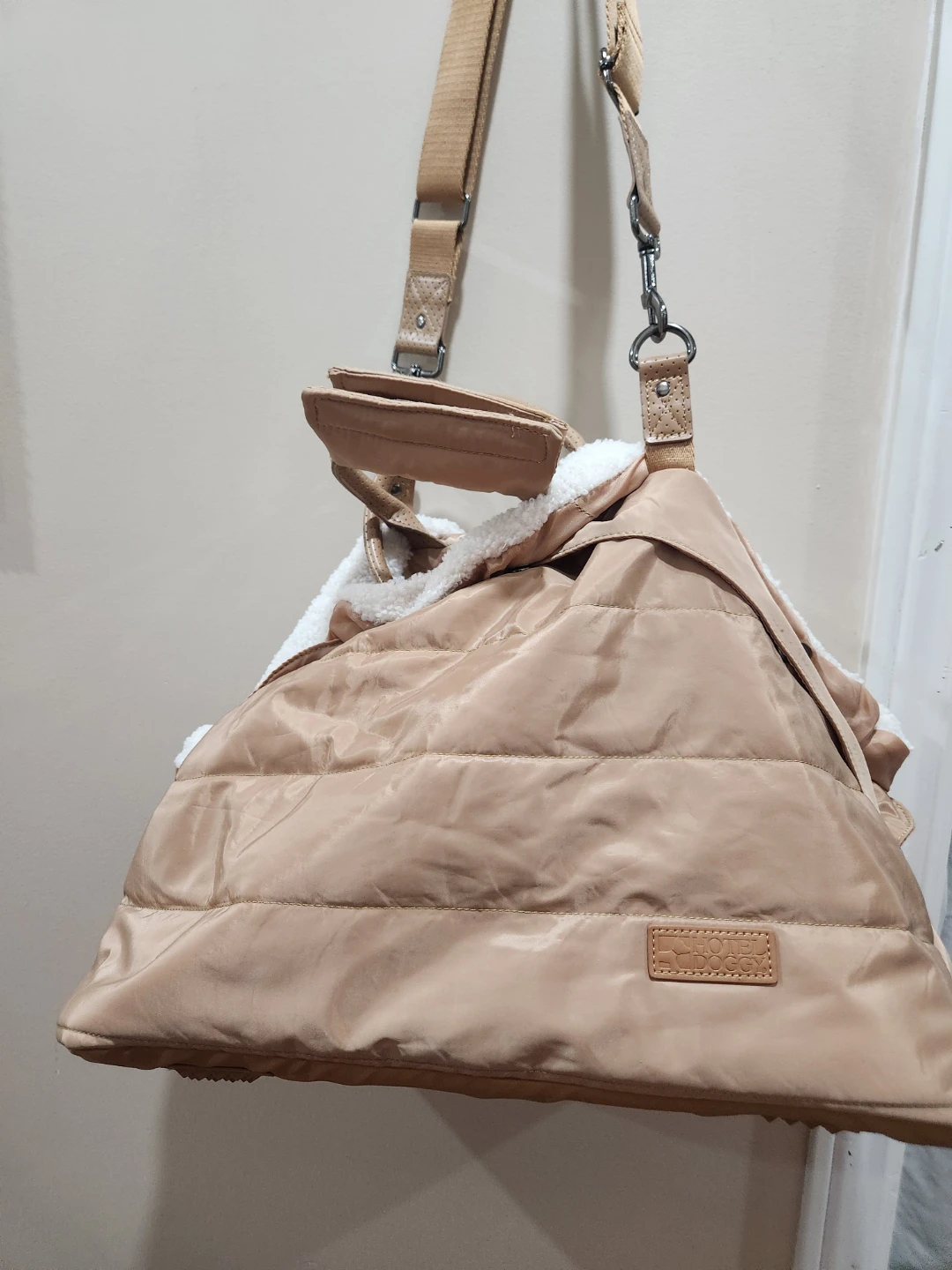 This is a beige pet carrier from Hotel Doggy. It features a quilted design and cozy sherpa lining, perfect for keeping your furry friend comfortable on the go! It has both handles and a shoulder strap for easy carrying