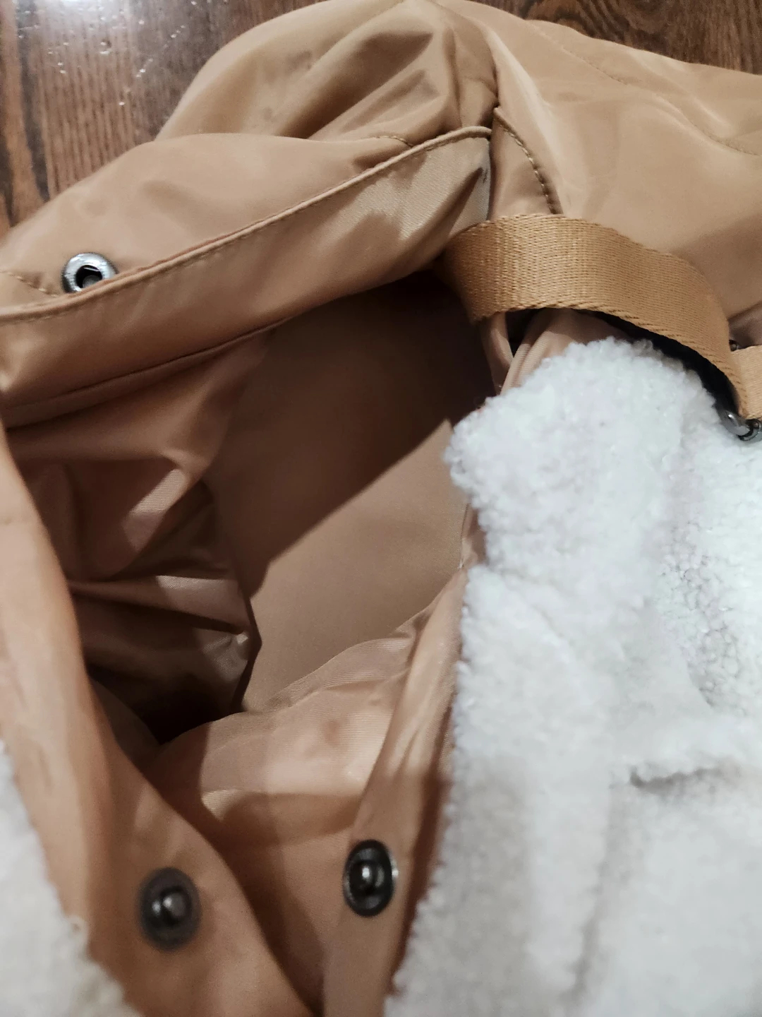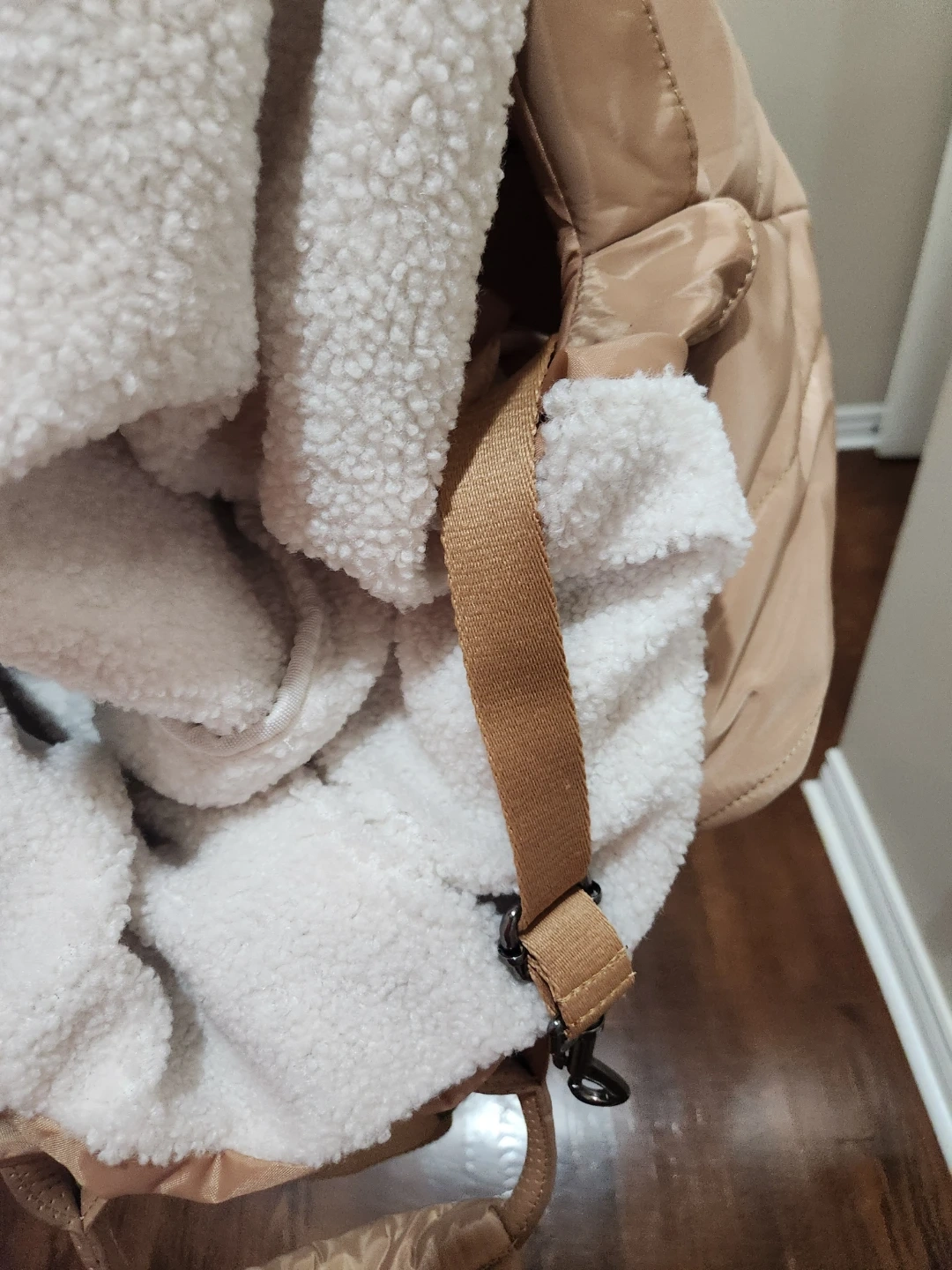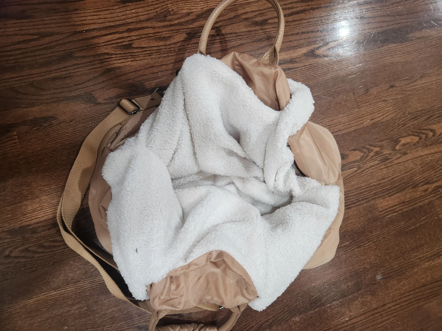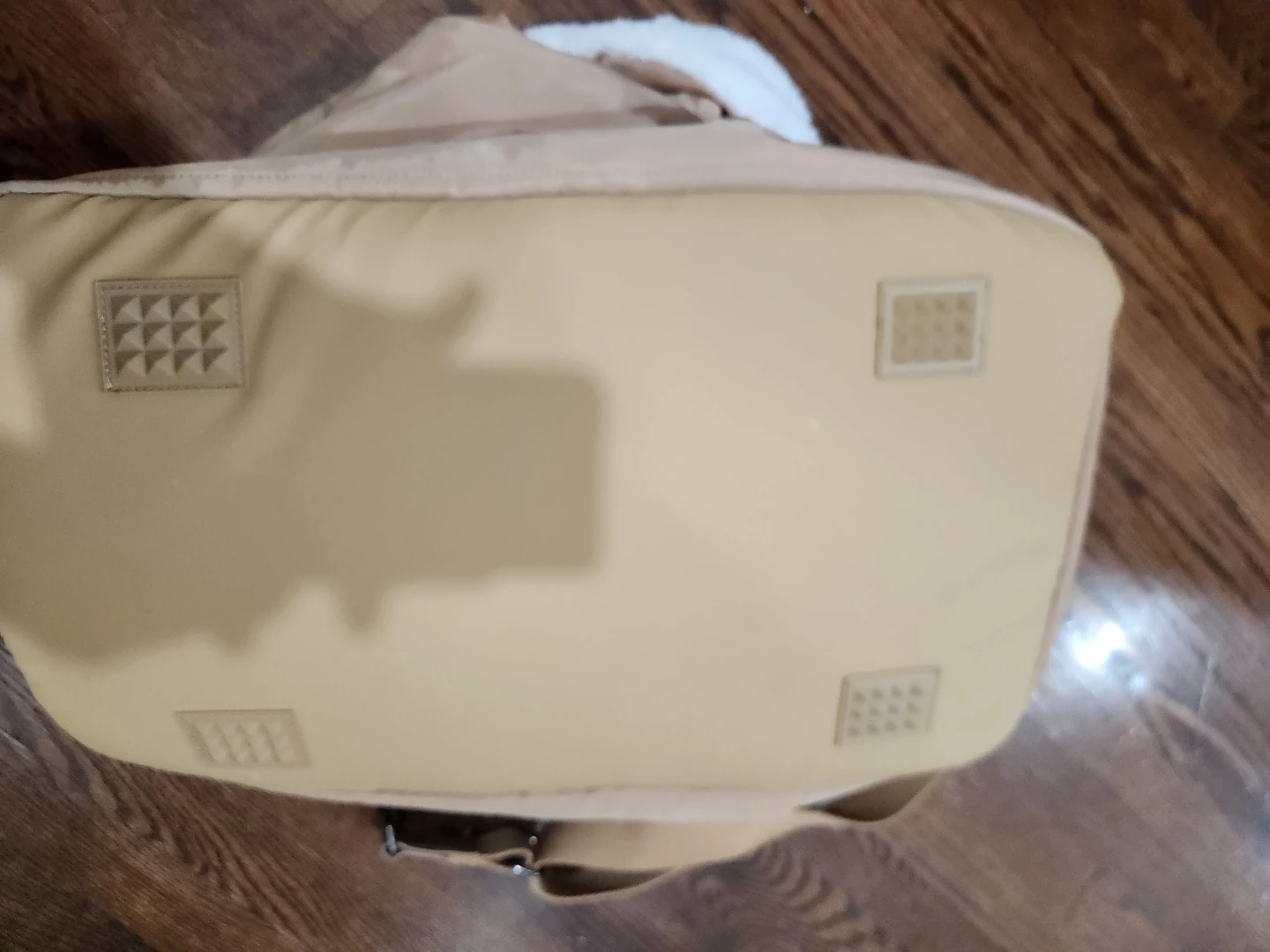 This is a beige pet carrier from Hotel Doggy. It features a quilted design and cozy sherpa lining, perfect for keeping your furry friend comfortable on the go! It has both handles and a shoulder strap for easy carrying