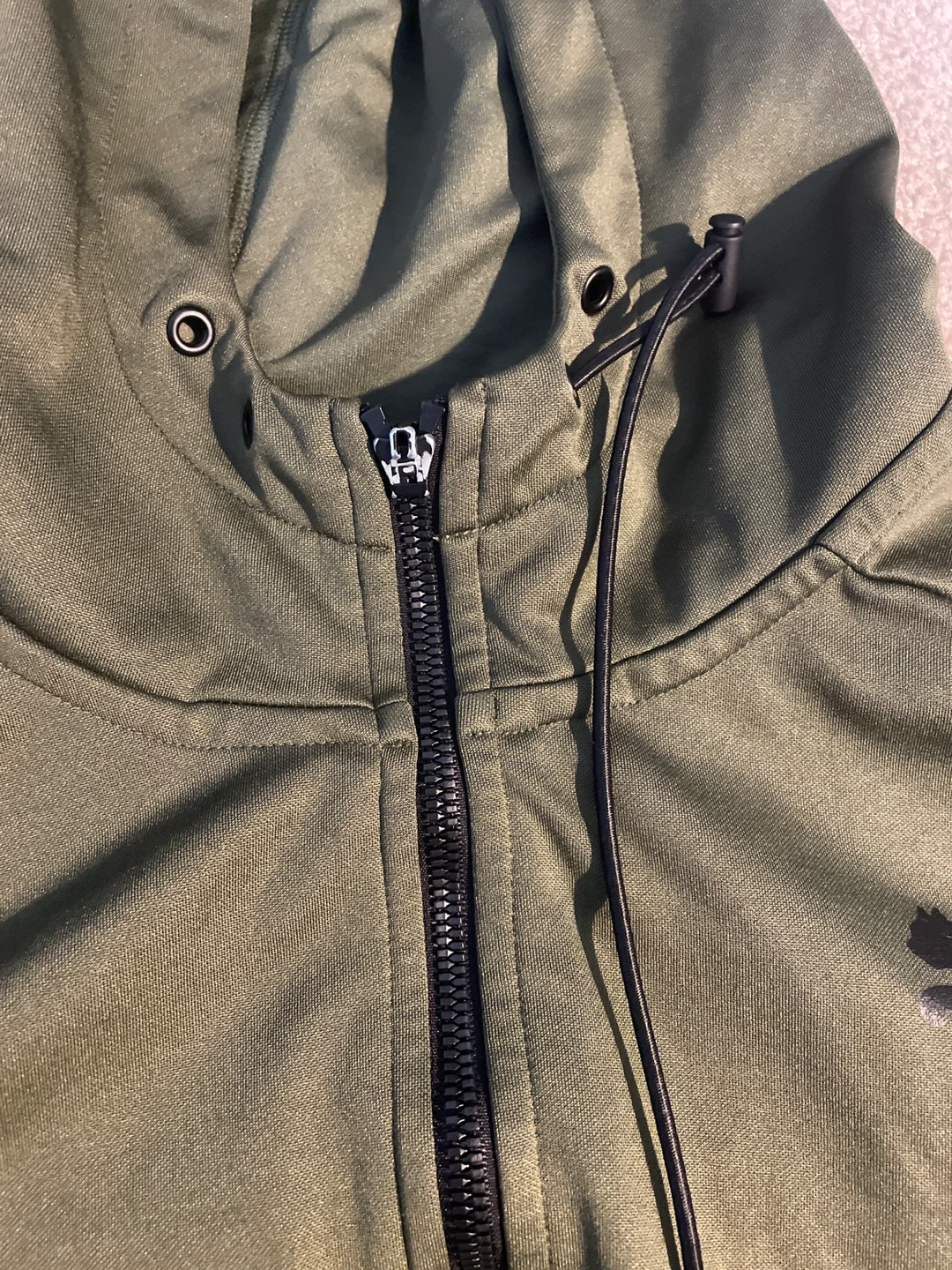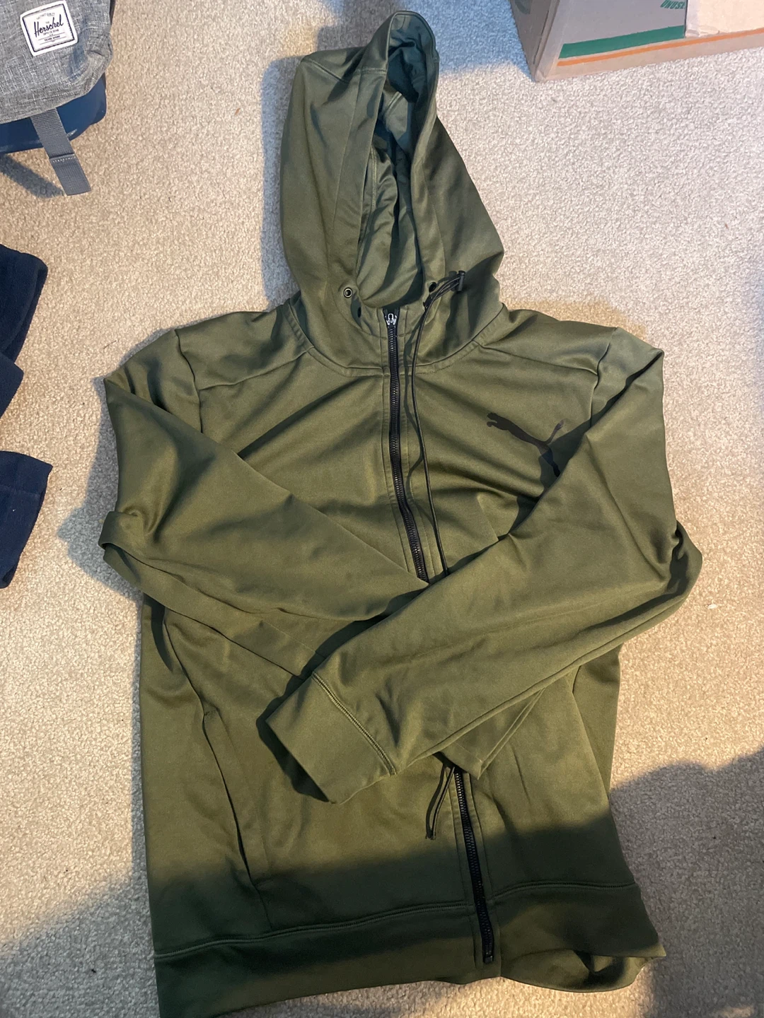 Selling a Puma full zip hoodie in olive green. Good condition, missing a zipper and the draw string is weird now. But very comfy and good quality.Perfect for layering or wearing on its own!