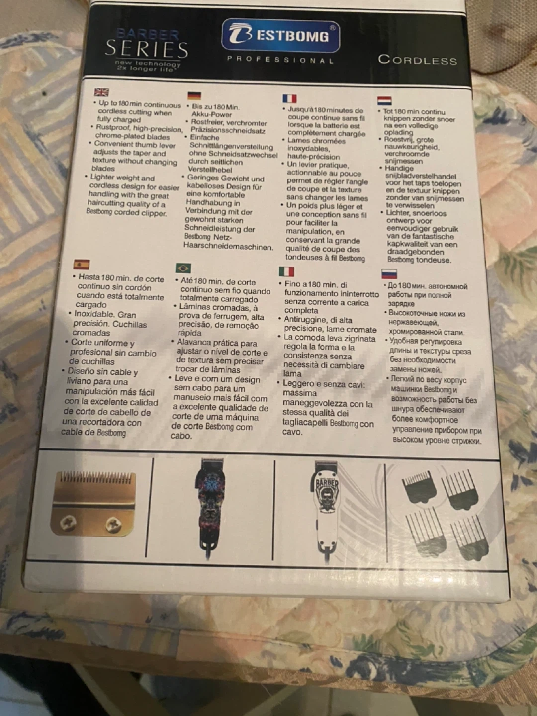 Selling a brand new Bestbomg Barber Series cordless clipper! It features rustproof, high-precision chrome-plated blades that adjust to taper and texture without changing blades. It's lightweight and cordless for easier handling, and provides up to 180 minutes of continuous cordless cutting when fully charged