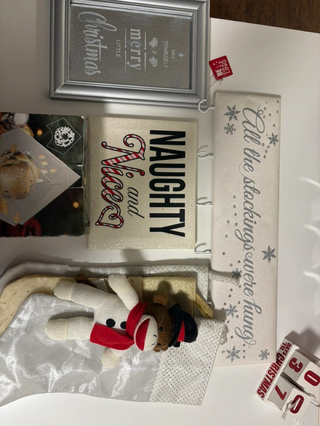 Selling a bundle of Christmas decorations! Includes a framed "Merry Little Christmas" sign, a "Naughty and Nice" block, an "All the stockings were hung" sign, a Christmas countdown block, and a stocking with a snowman