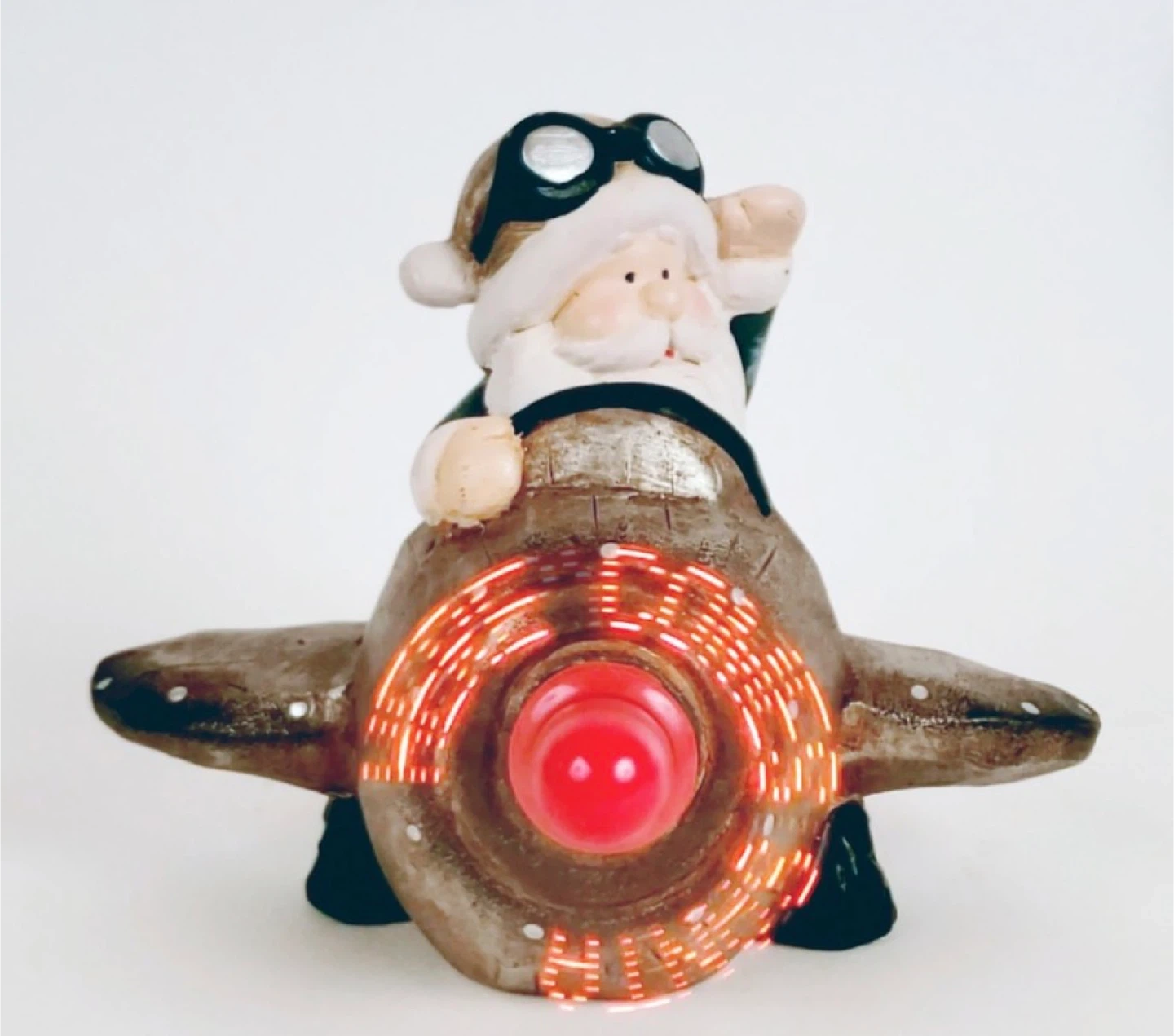 This Battery Operated Snowman in a Plane with a lit up Propeller is a unique way to add a touch of whimsy to your living space. With greetings of "Merry Christmas" and "Here Comes Santa" this snowman is a joyful addition to your decor. This Battery Operated Santa in a Plane with a lit up Propeller is a unique way to add a touch of whimsy to your living space. With greetings of "Merry Christmas" and "Here Comes Santa" this Santa is a joyful addition to your decor.
