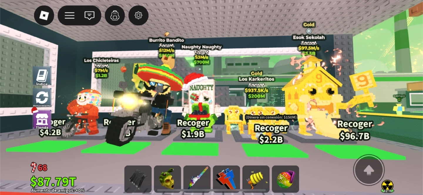 This image shows various in-game assets from the Roblox game, including characters, buildings, and currency amounts. It seems to be a snapshot of the game's interface, displaying different elements and their associated values.