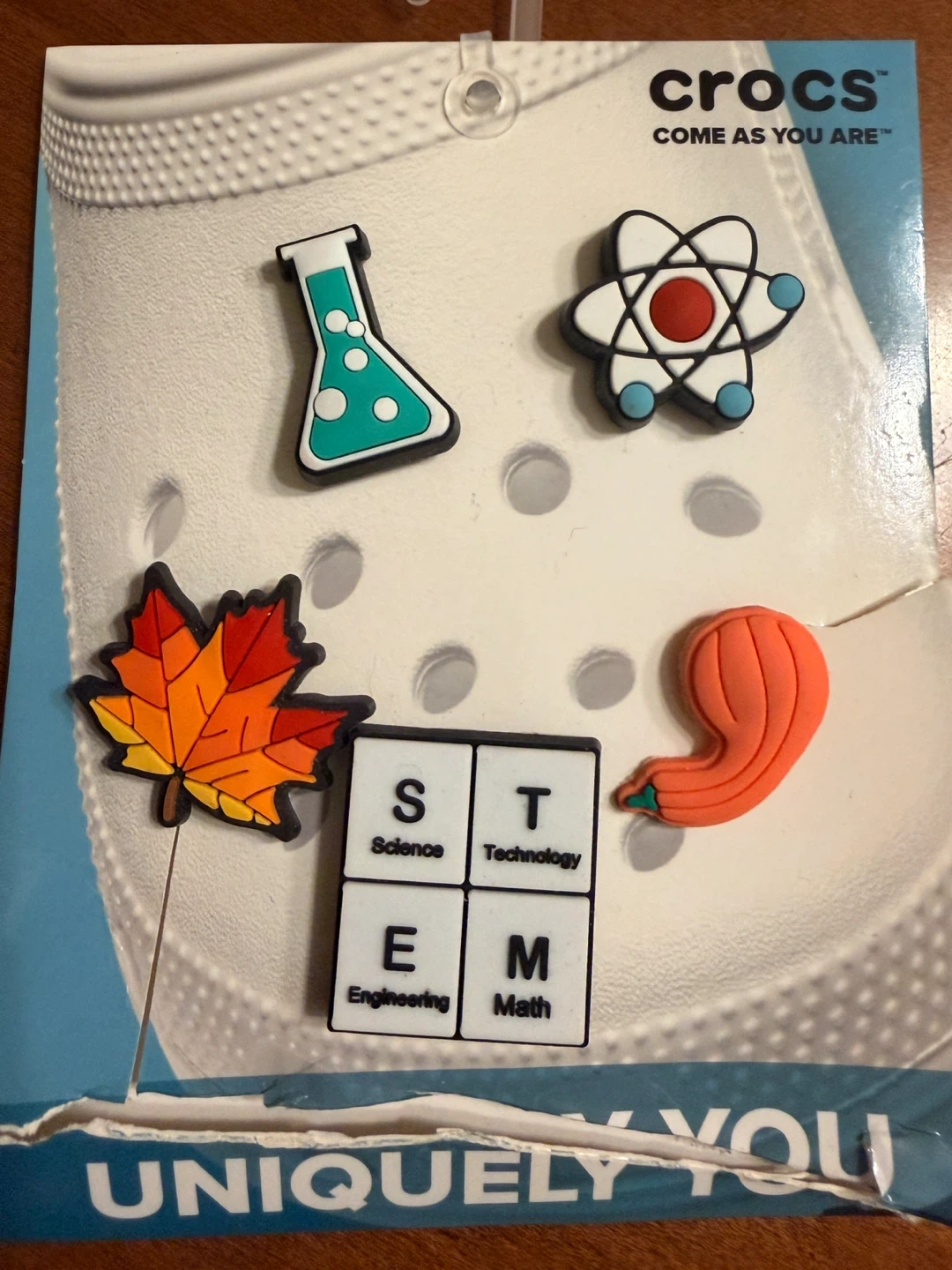 Add a bit of science to your Crocs with these fun atom & Science nerd Jibbitz charms! It's in great shape and ready to personalize your footwear. I kept Pi so added some Autumn winter ๐ for fun.