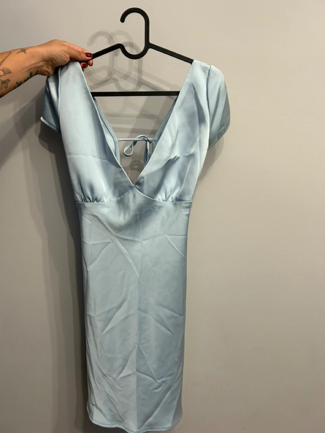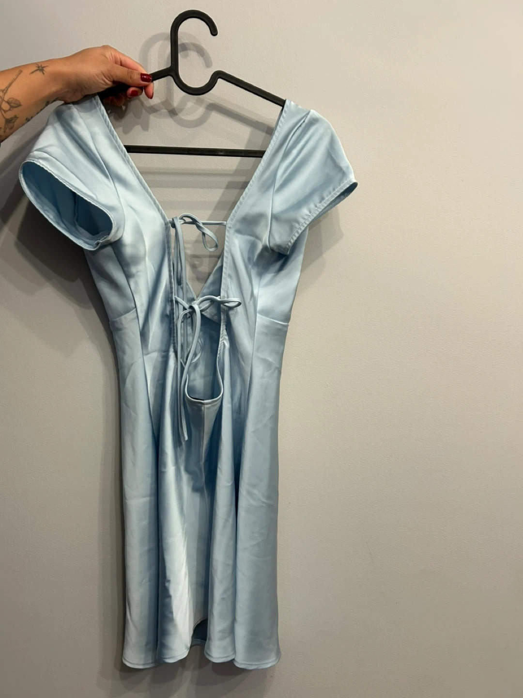 A lovely light blue mini dress! It's in great condition and ready for a new owner. Perfect for a night out or a special occasion. The open back with tie detail adds a touch of elegance
