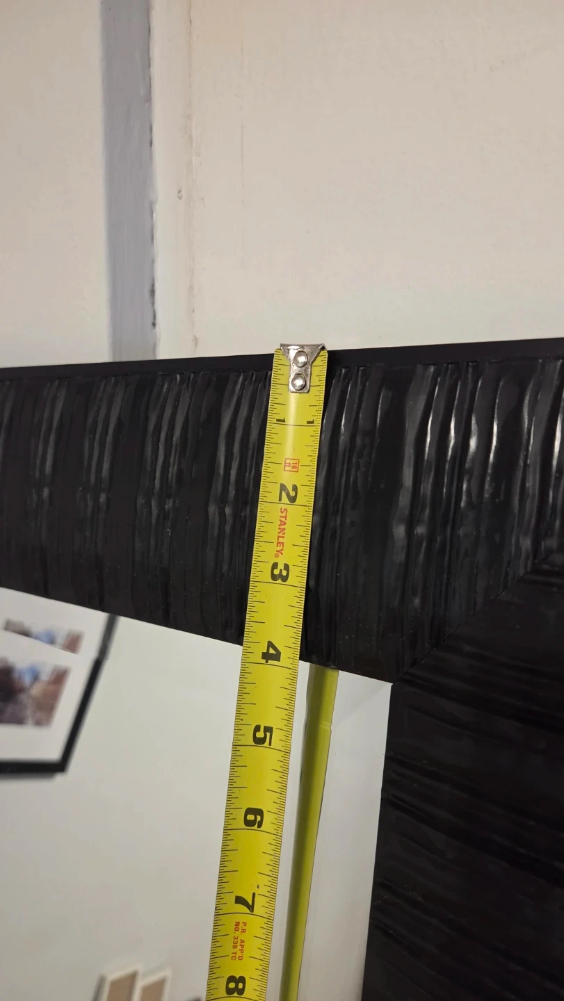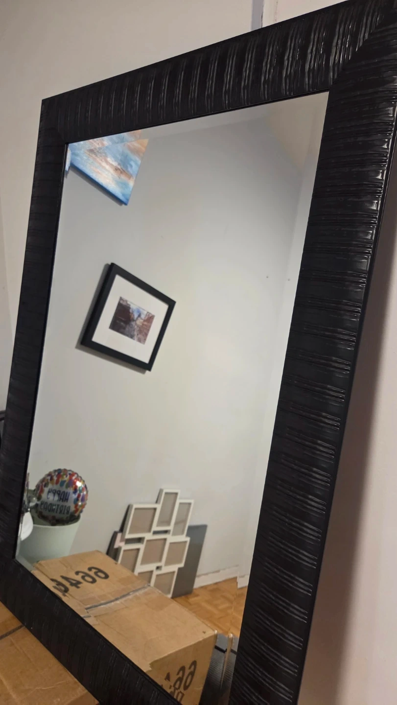 Selling a large black framed mirror. The frame has a textured design. It would look great in any room!