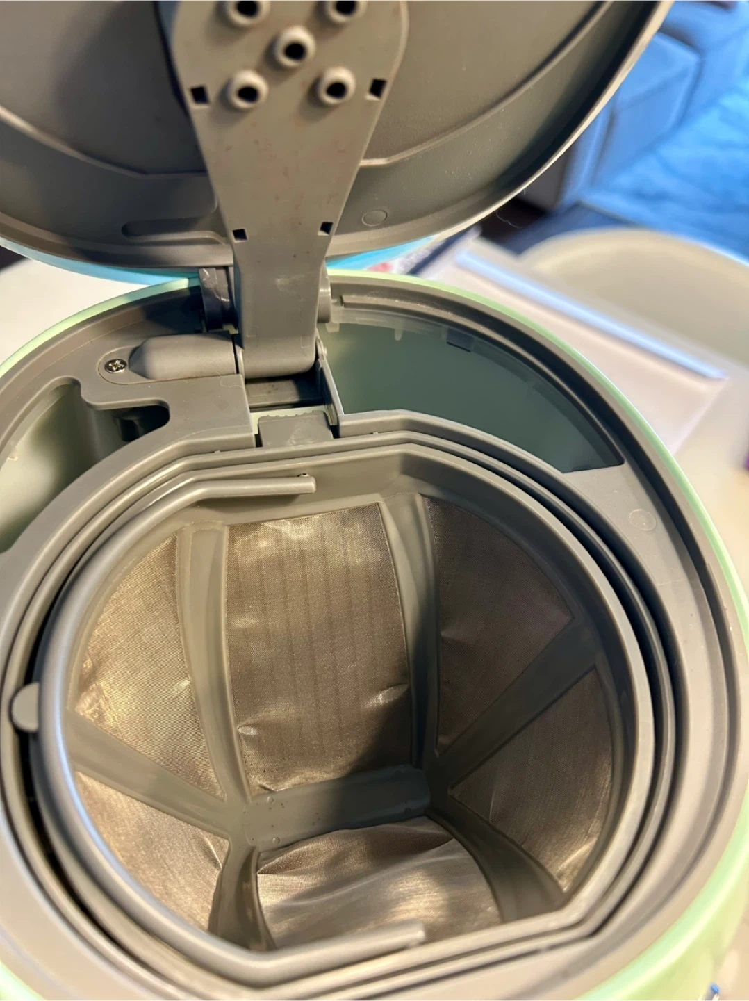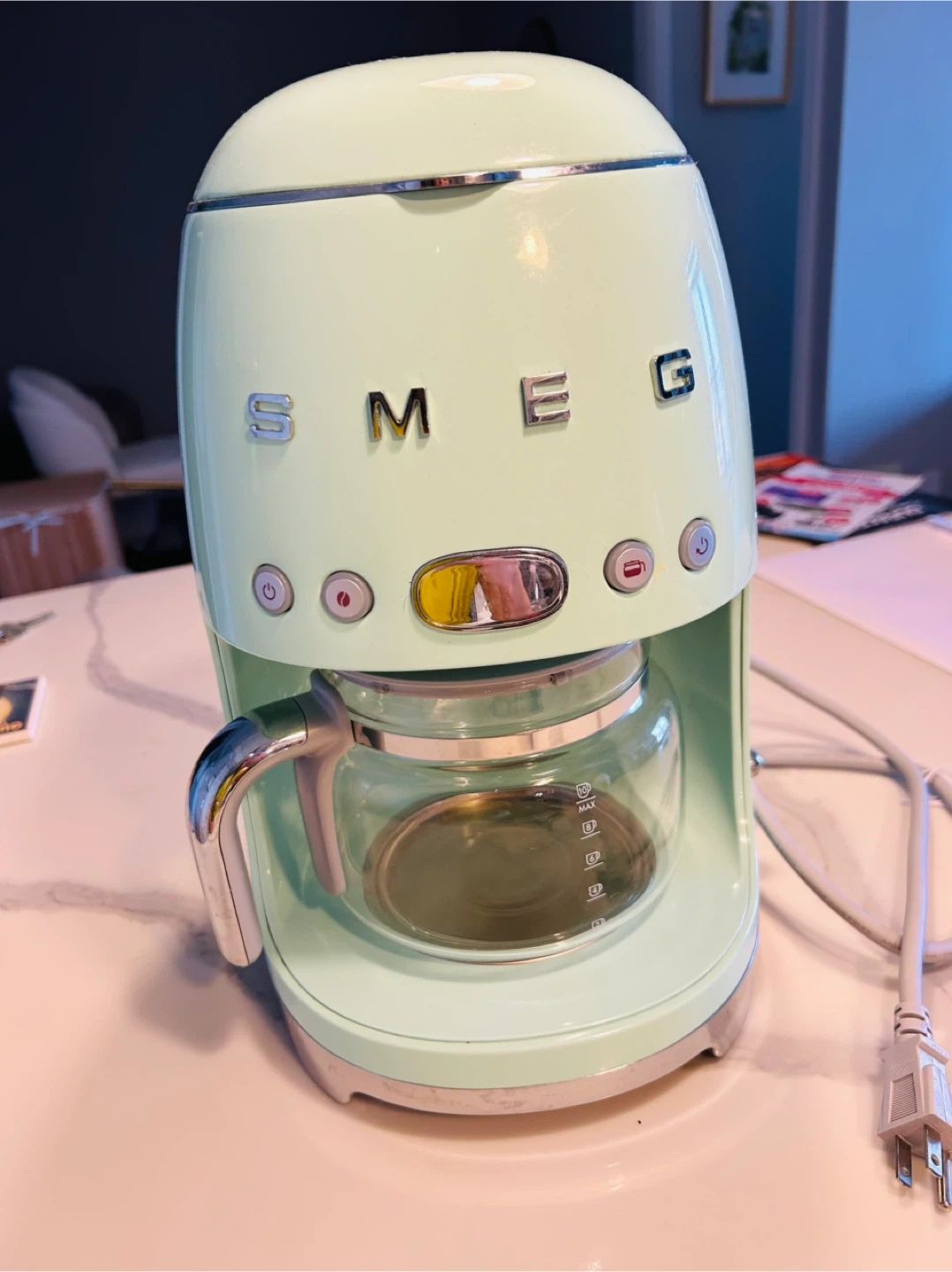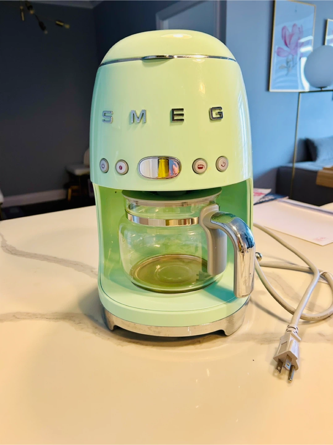 Smeg coffee maker in a lovely pastel green colour! It's in great shape and ready to brew your favourite coffee. This stylish appliance will look great on your kitchen counter